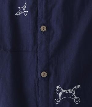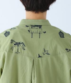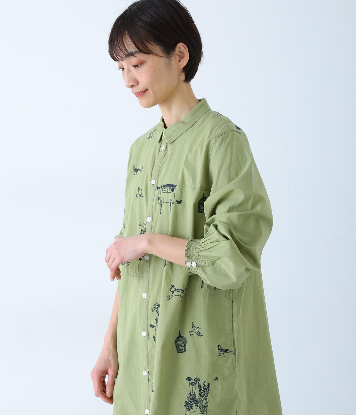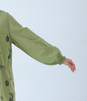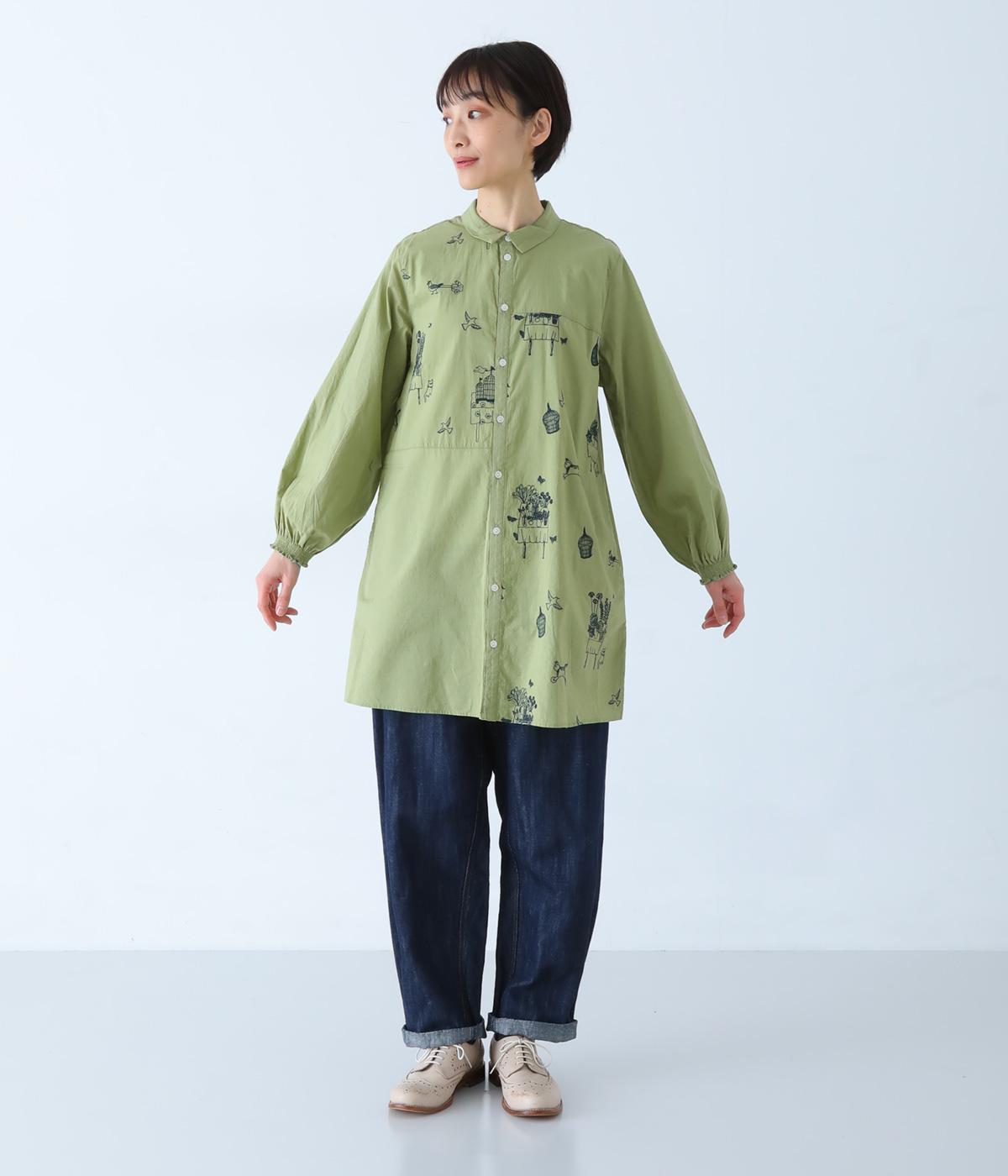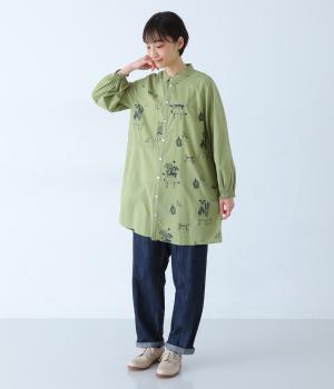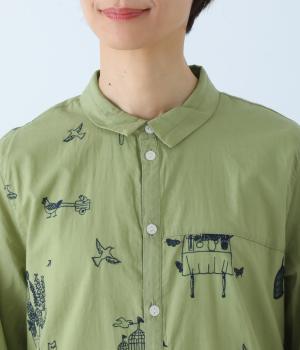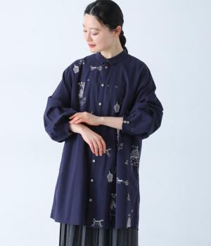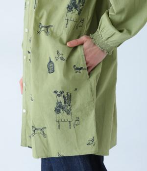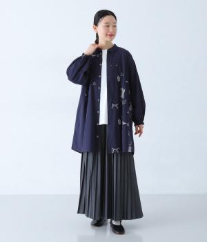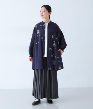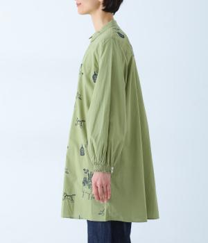 画家・イラストレーター マツモトヨーコさんとのコラボシリーズです。マツモトさんの作品から動物やお花などをピックアップして、可愛らしい総柄に仕上げました。アシンメトリーな切替やカーブヨーク、襟の切り替えなど、遊び心あるディテールをふんだんに取り入れた一着です。