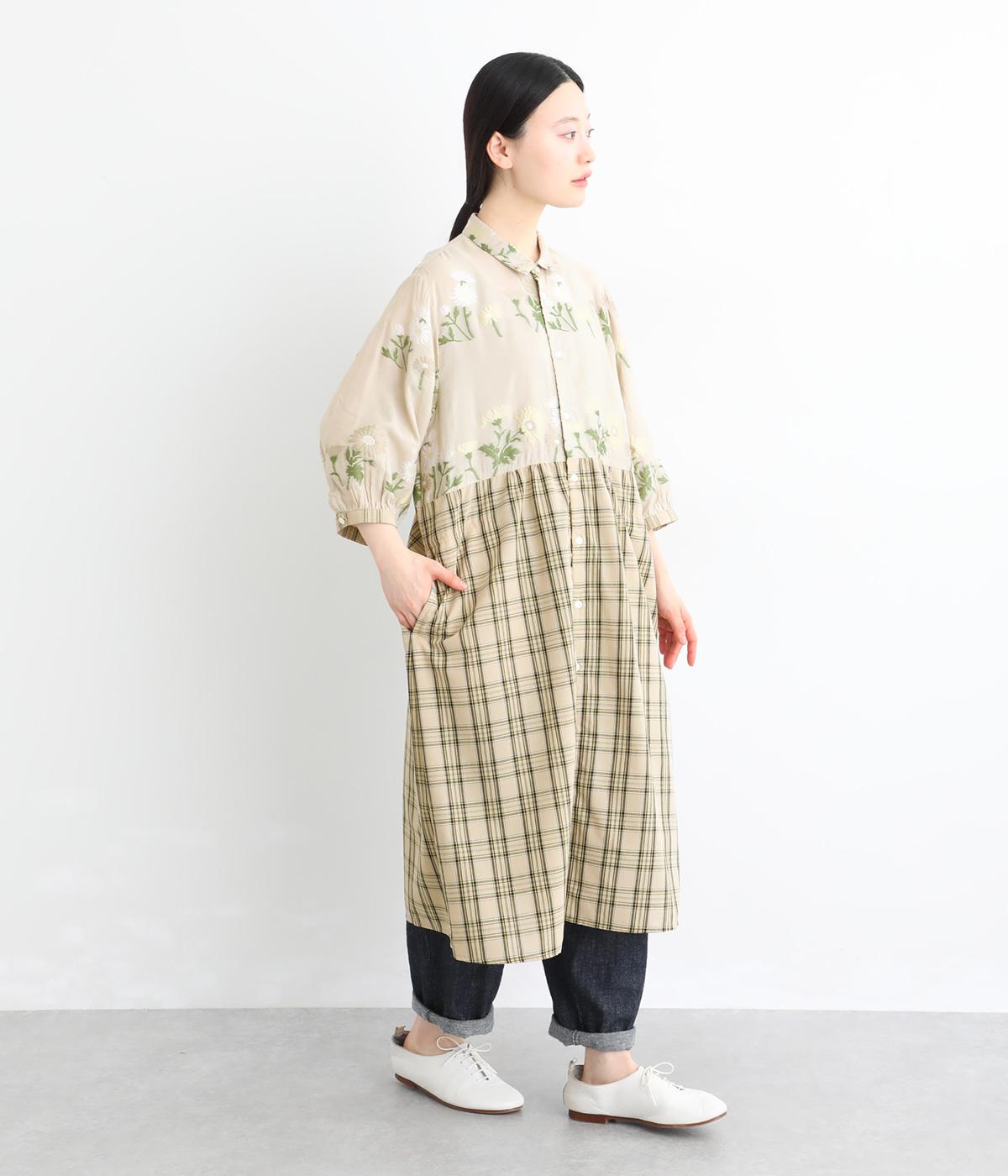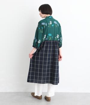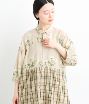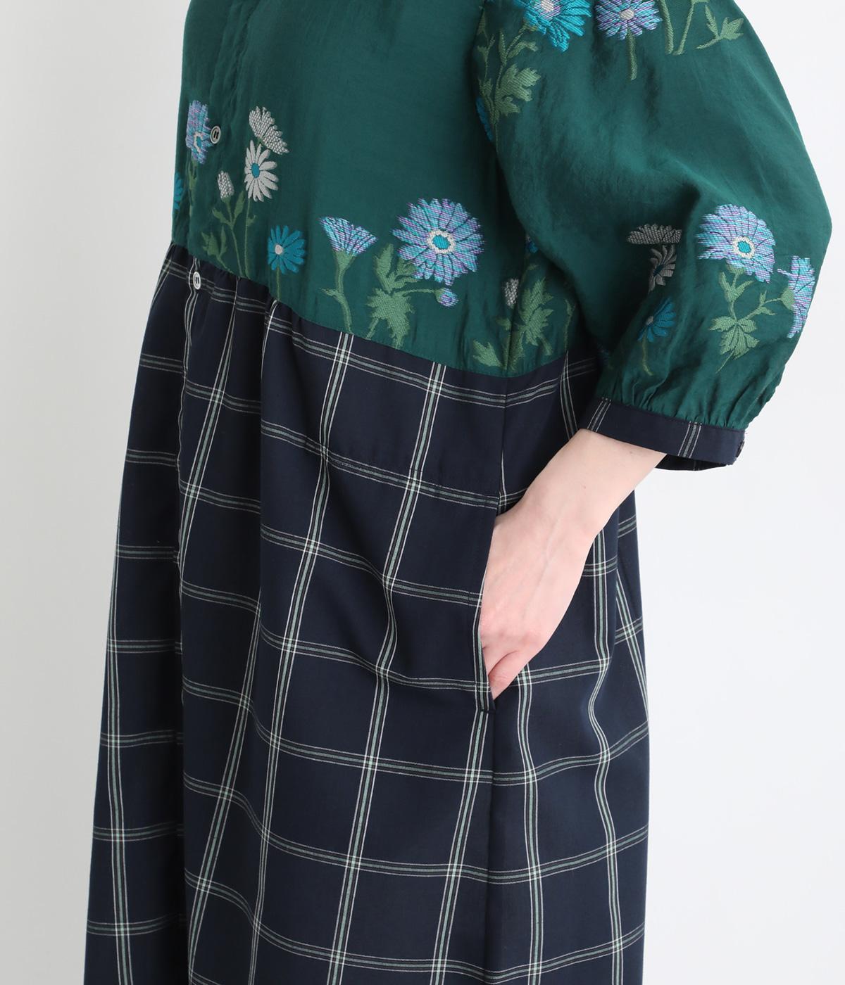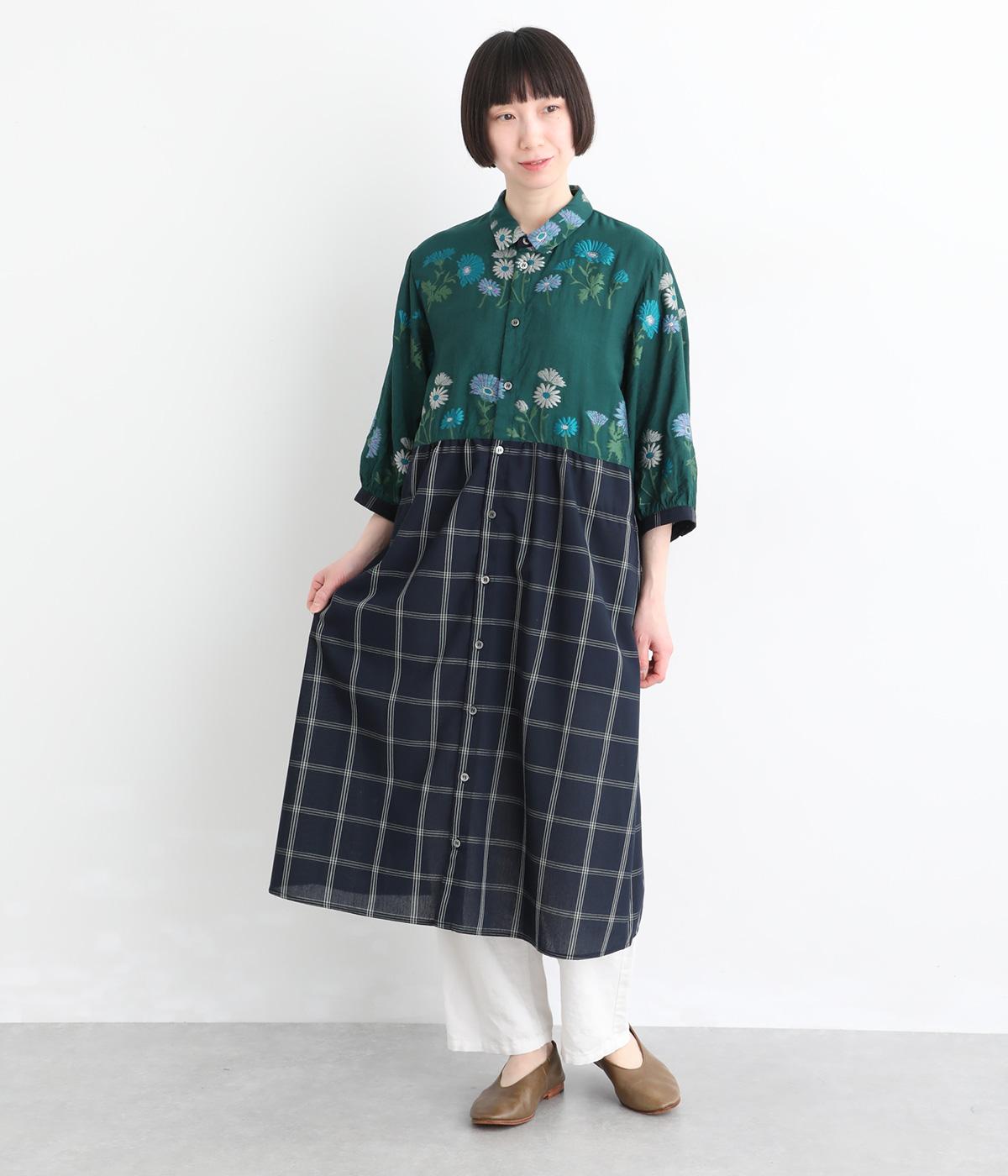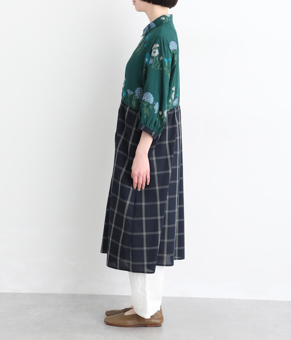 オリジナルのジャカード生地が映えるワンピースです。マーガレットモチーフは6色の糸を使い、織りによってレインボーのような奥行きを表現しました。スカート部分をチェック柄で切り替え、ほどよく上品な印象をプラス。一枚でコーディネートが完成するデザインです。