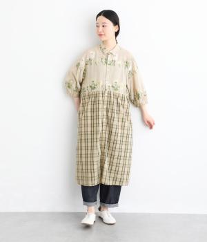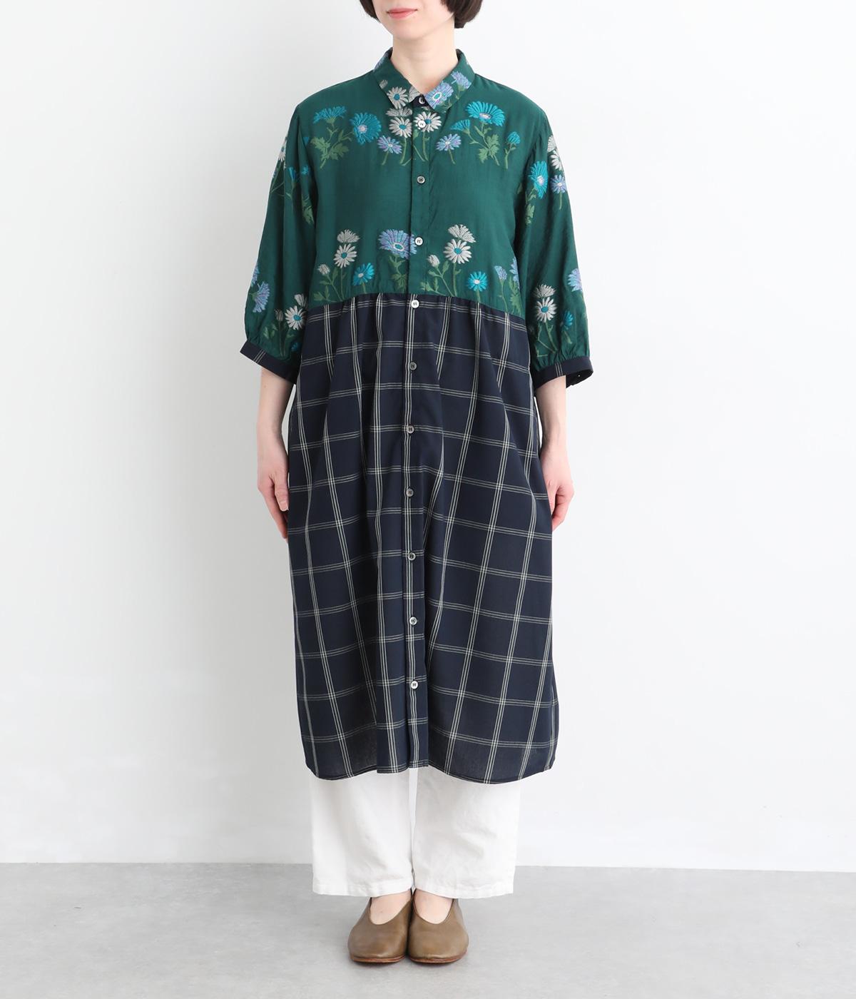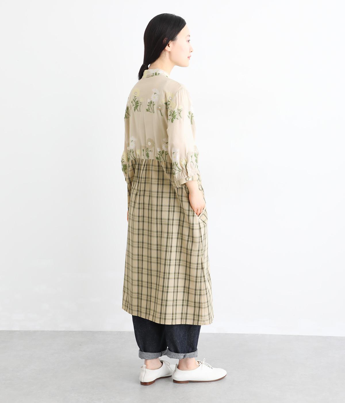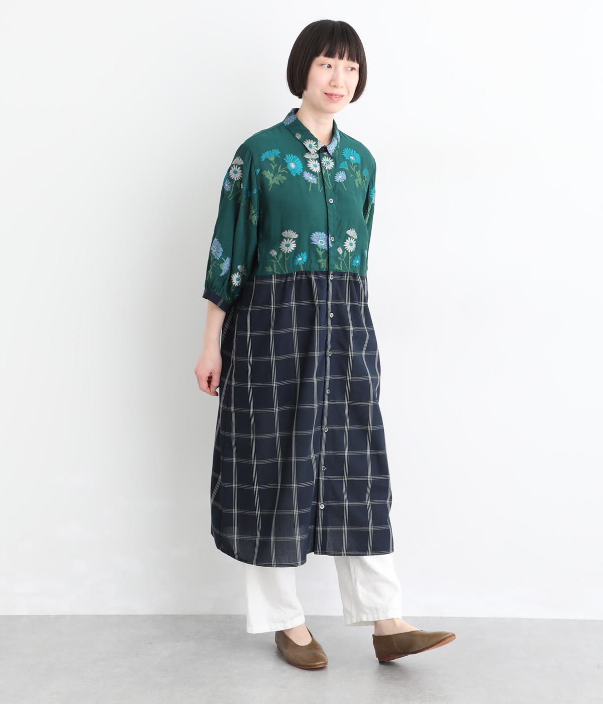 オリジナルのジャカード生地が映えるワンピースです。マーガレットモチーフは6色の糸を使い、織りによってレインボーのような奥行きを表現しました。スカート部分をチェック柄で切り替え、ほどよく上品な印象をプラス。一枚でコーディネートが完成するデザインです。