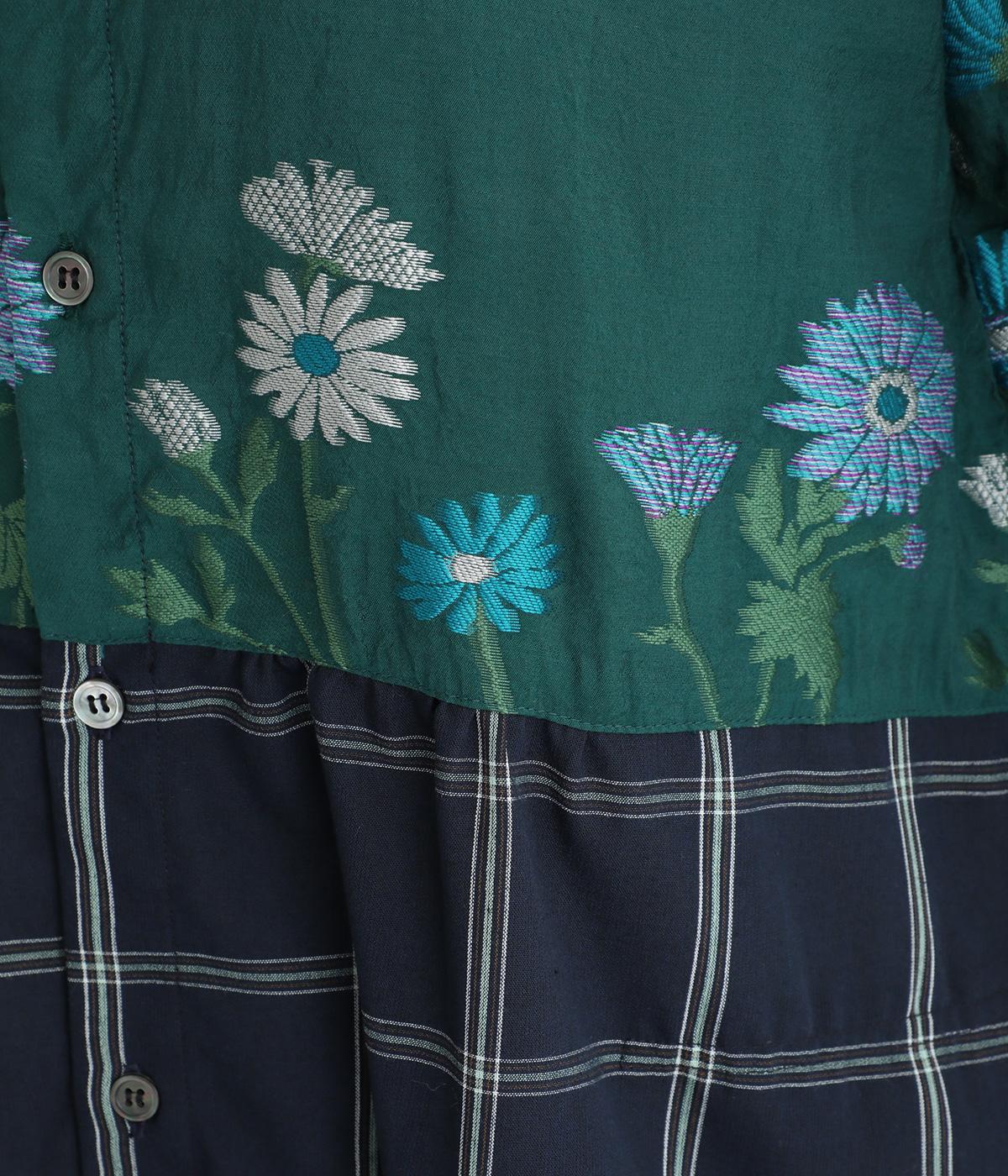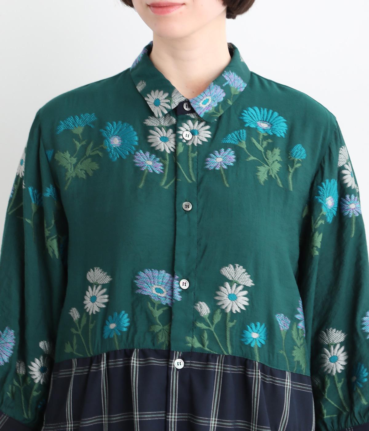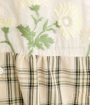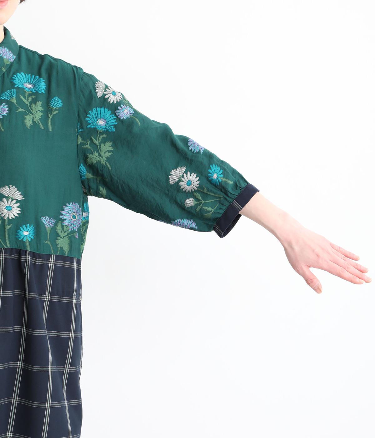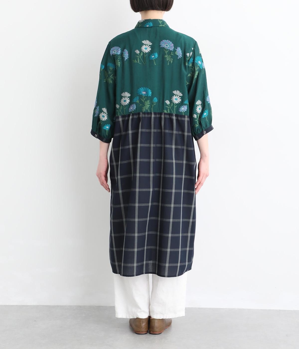 オリジナルのジャカード生地が映えるワンピースです。マーガレットモチーフは6色の糸を使い、織りによってレインボーのような奥行きを表現しました。スカート部分をチェック柄で切り替え、ほどよく上品な印象をプラス。一枚でコーディネートが完成するデザインです。