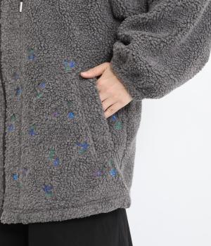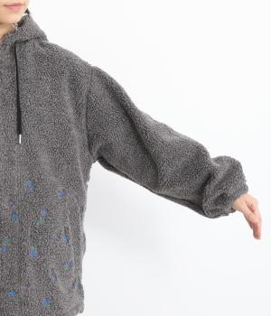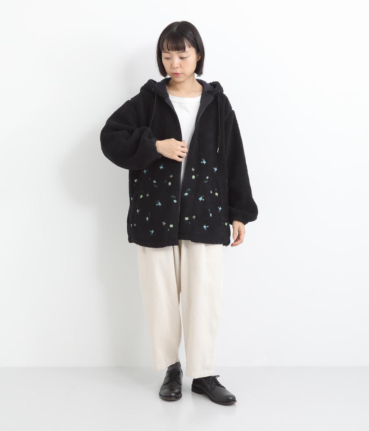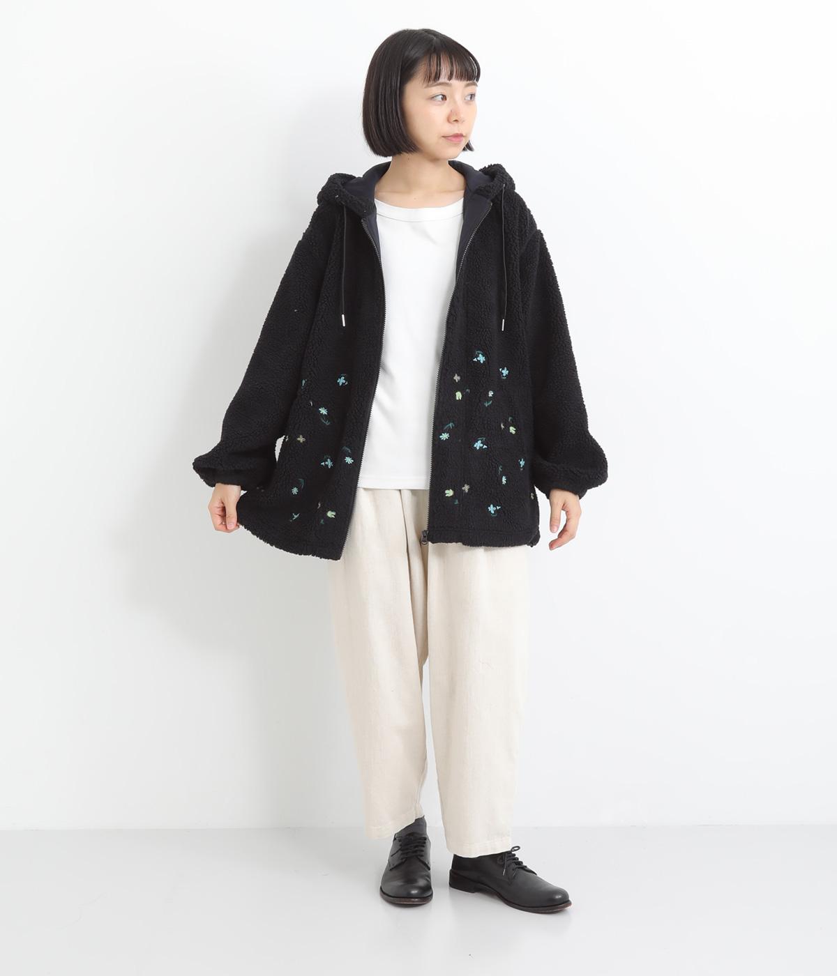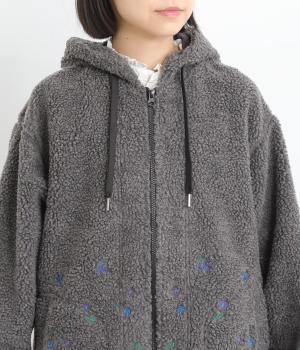 モコモコとしたまるみのあるシルエットとお花の刺しゅうがかわいいブルゾンです。少し大きめのフードはあたたかく包み込んでくれるような安心感。裾の両サイドには調節可能なゴム付きで、保温性を保ちつつ立体感も楽しめます。着ていて心弾むような一着です。