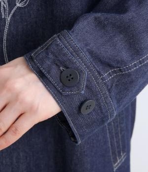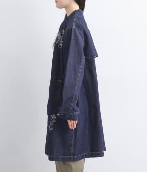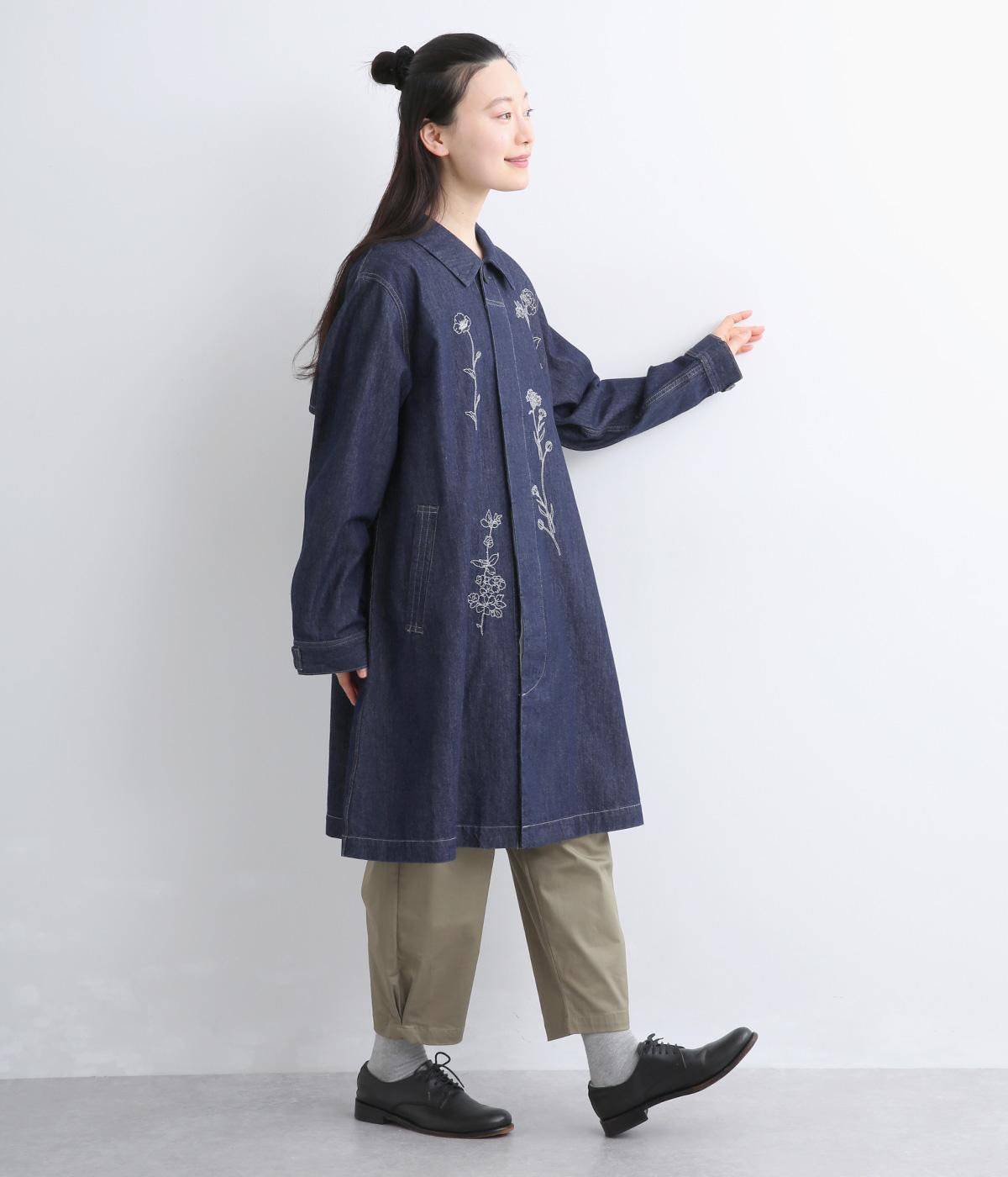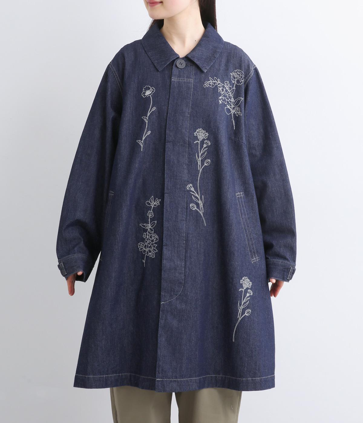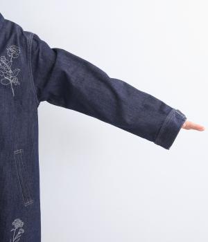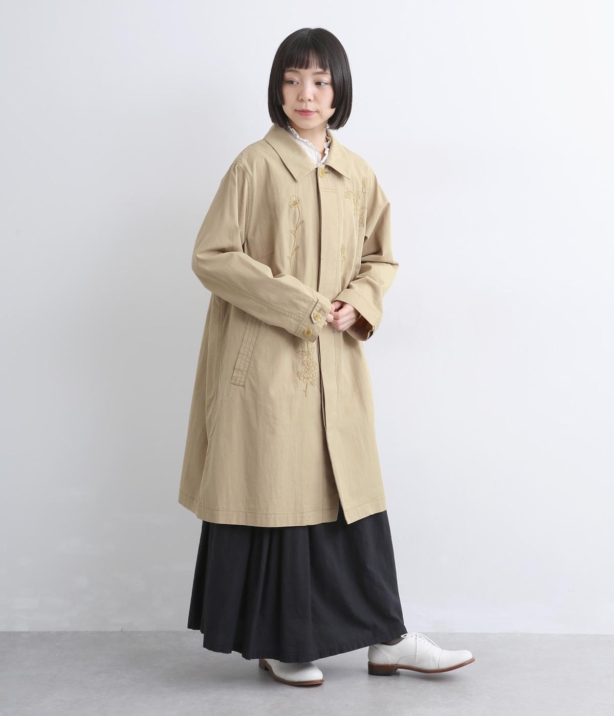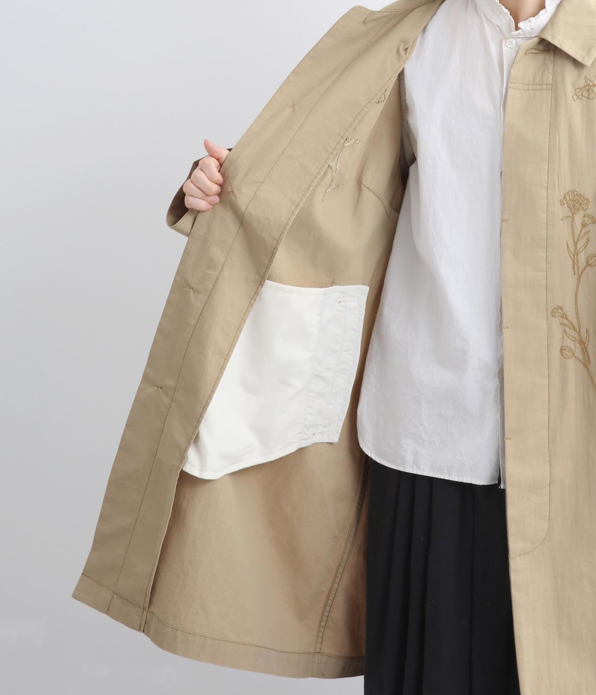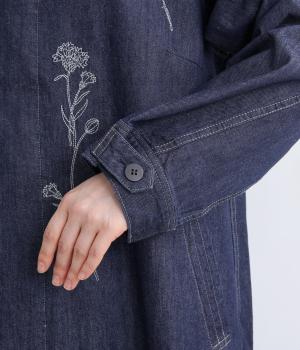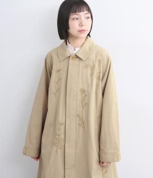 大きな線画の花刺しゅうを引き立てる比翼あきコート。後ろのアンブレラヨークにほどこしたセンターベンツとボタンがポイントです。袖のスリーブタブなど細部までこだわり、両サイドポケット付きで実用性も備えた一着です。