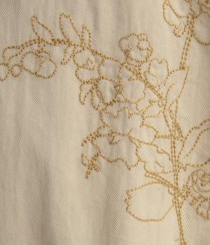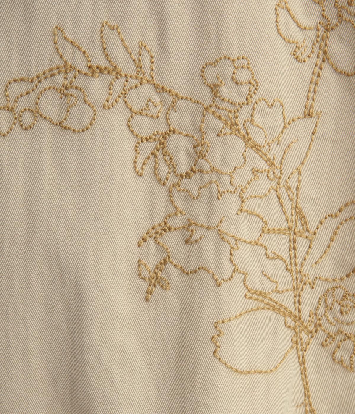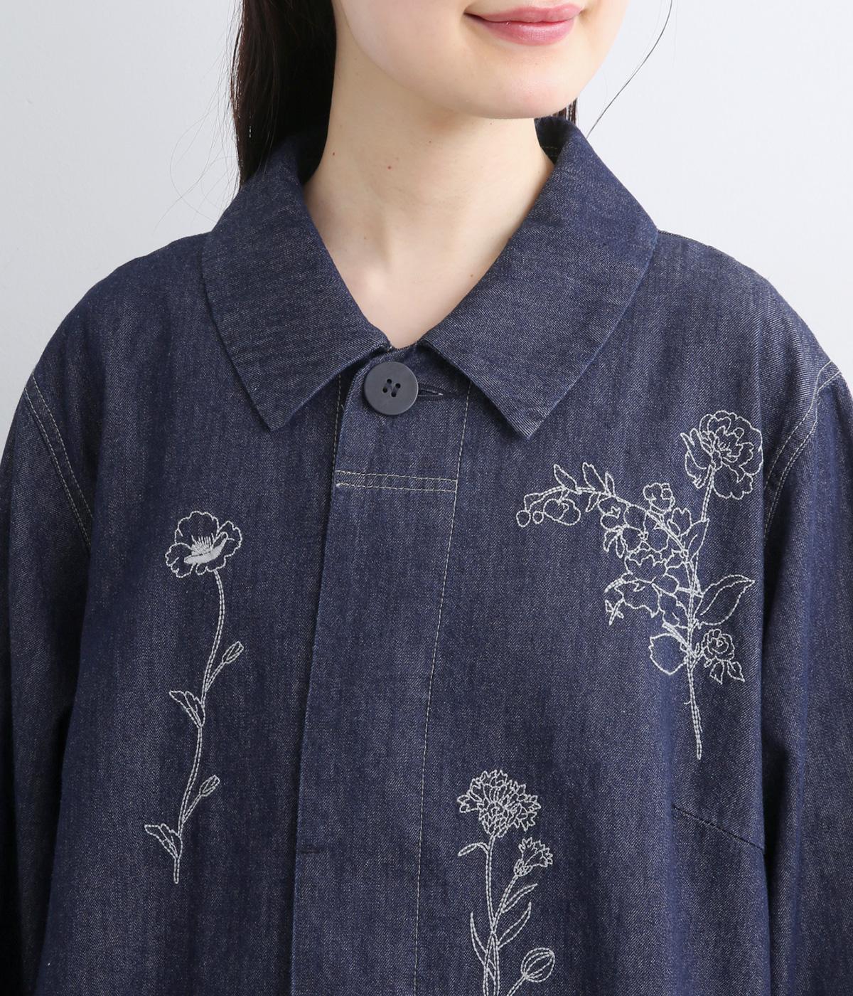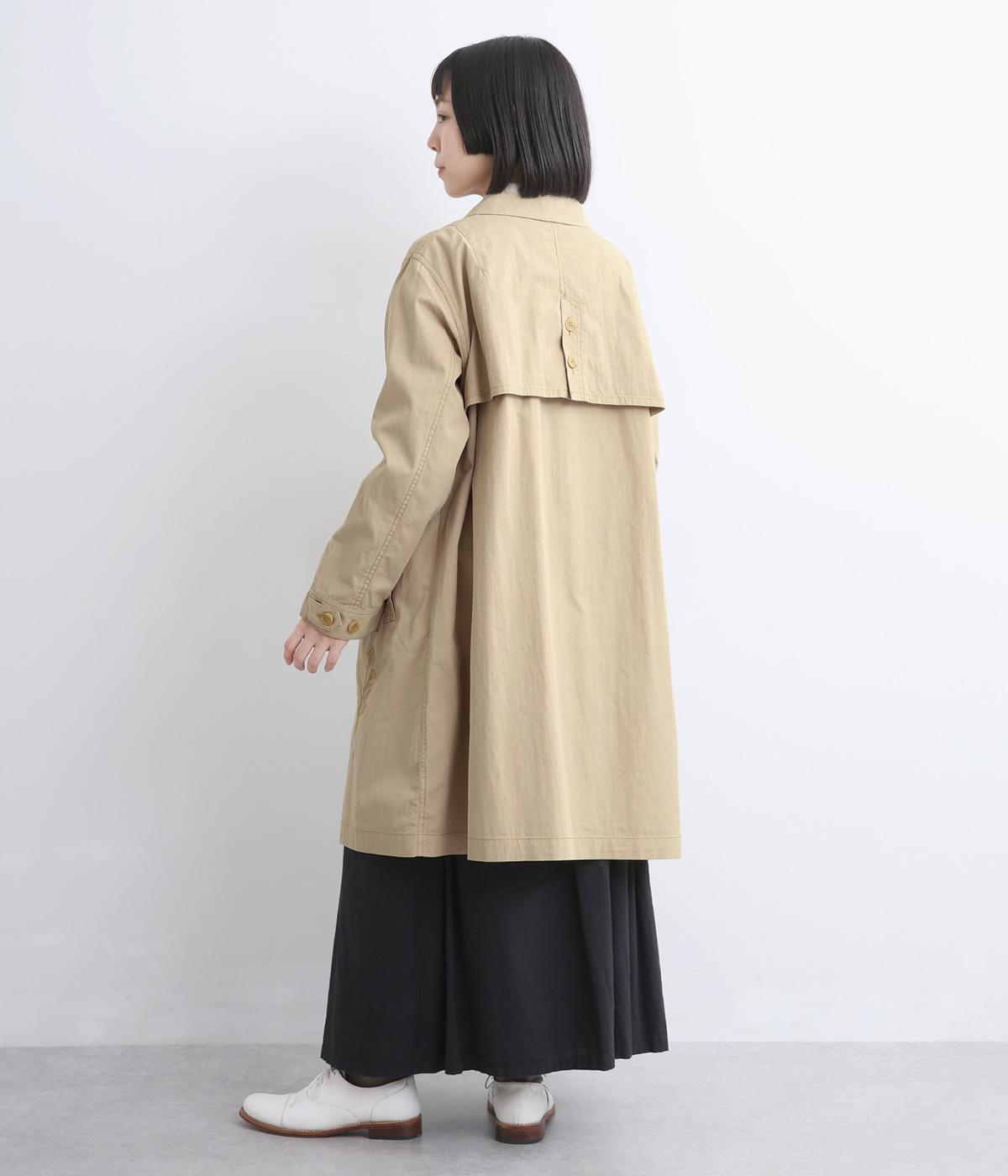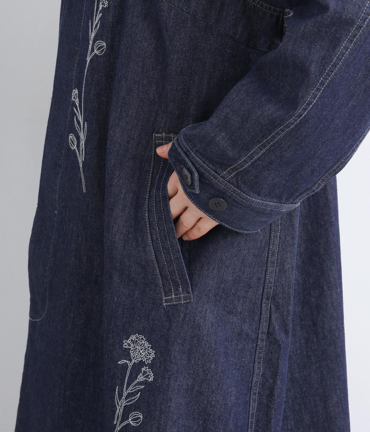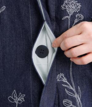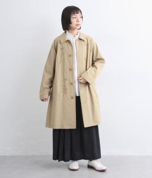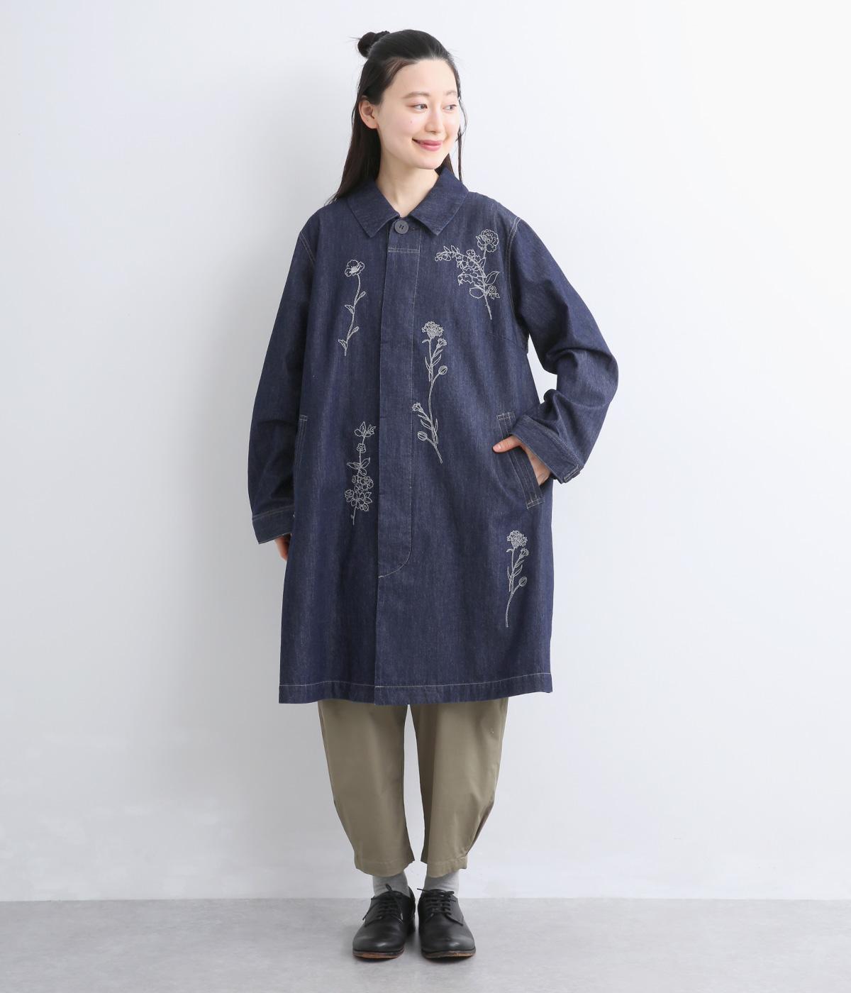 大きな線画の花刺しゅうを引き立てる比翼あきコート。後ろのアンブレラヨークにほどこしたセンターベンツとボタンがポイントです。袖のスリーブタブなど細部までこだわり、両サイドポケット付きで実用性も備えた一着です。