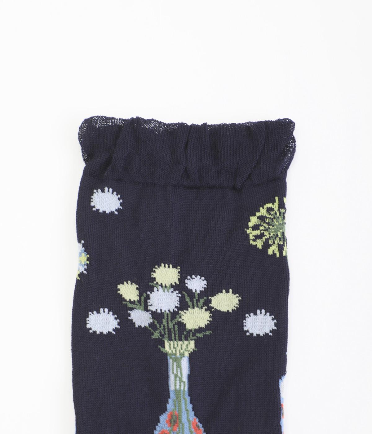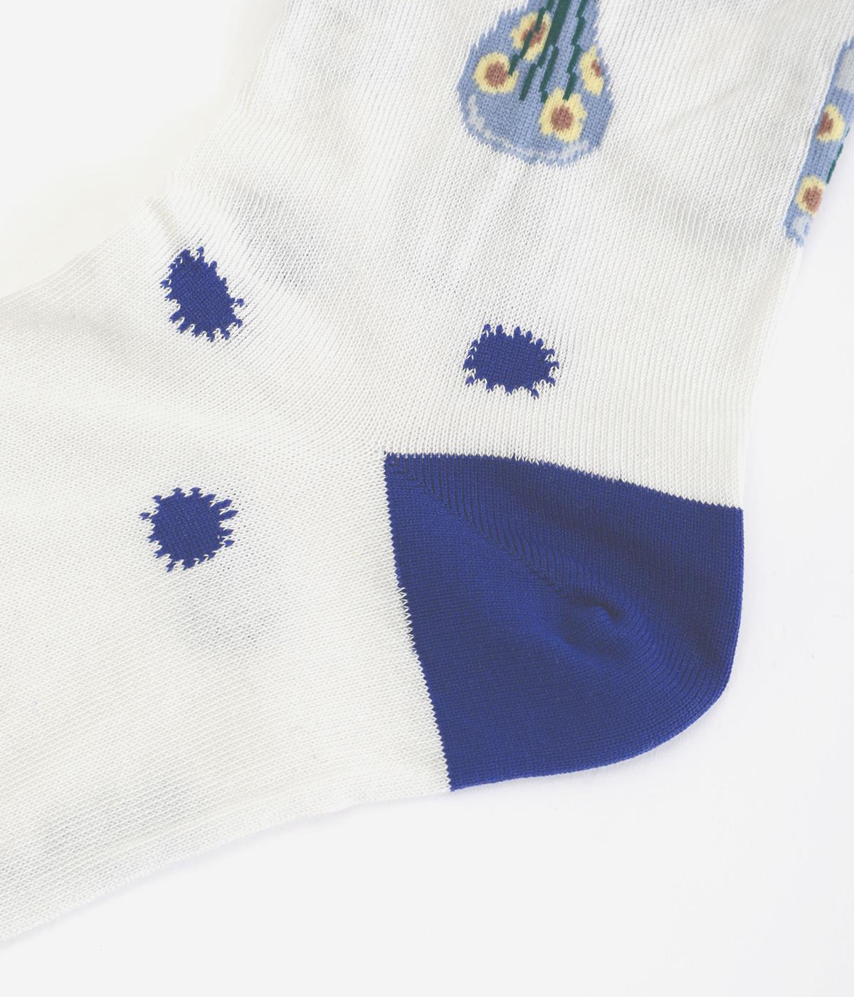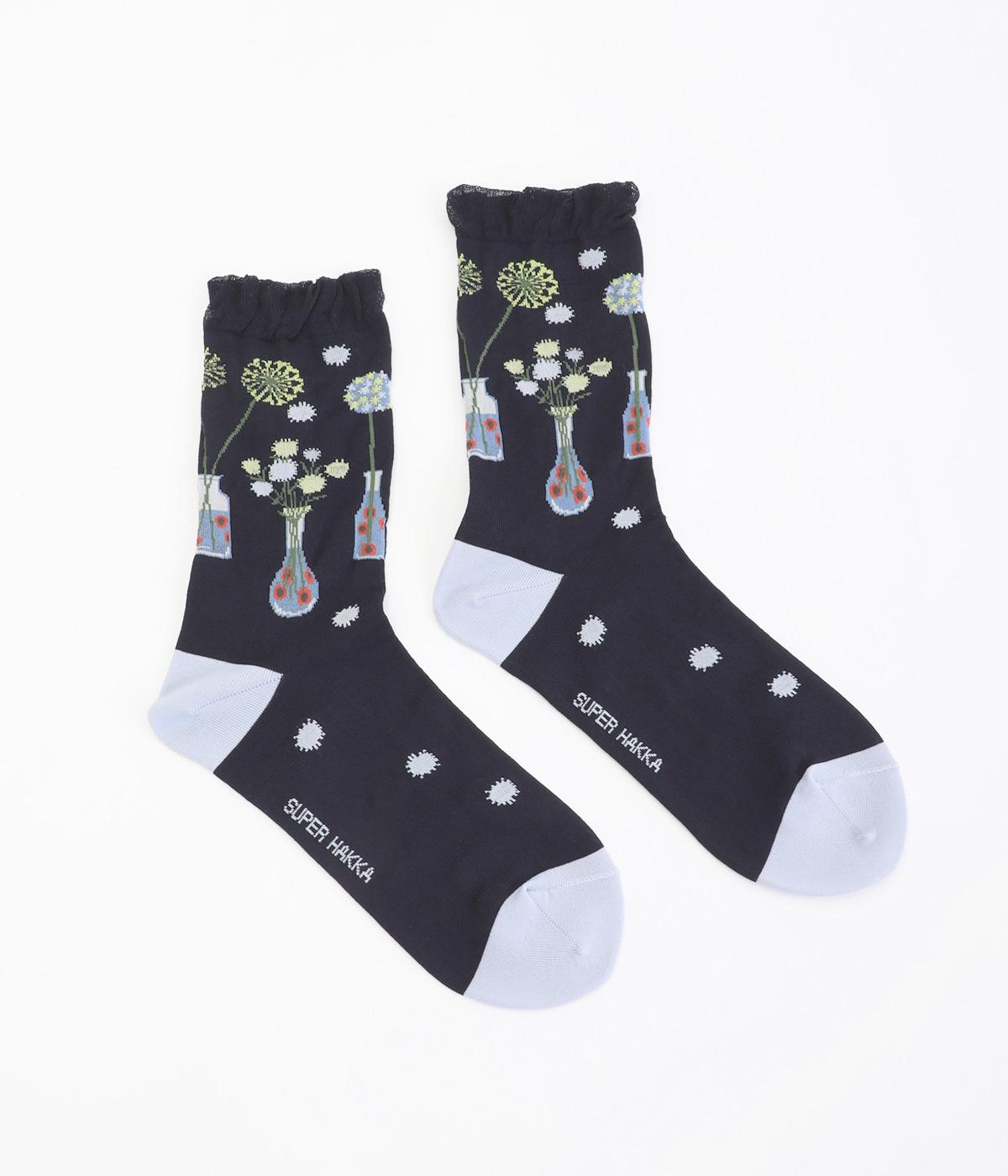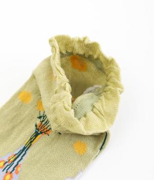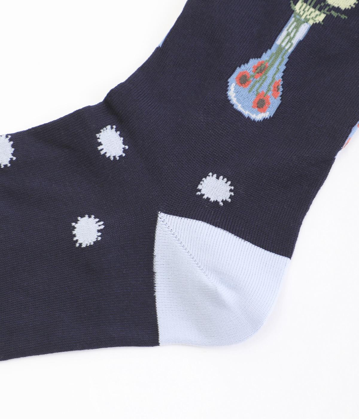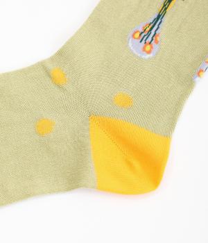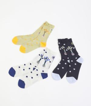 イラストレーター・マツモトヨーコさんとのコラボレーションによるデザインです。花瓶に入った花々のモチーフをぐるりとあしらい、やわらかな彩りをプラスしました。つま先やかかとには配色をきかせ、ドット柄をアクセントに。足元からコーディネートに華やかさ添えるアイテムです。