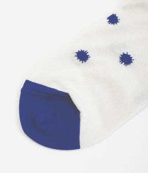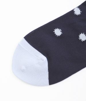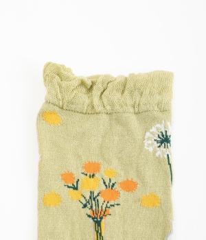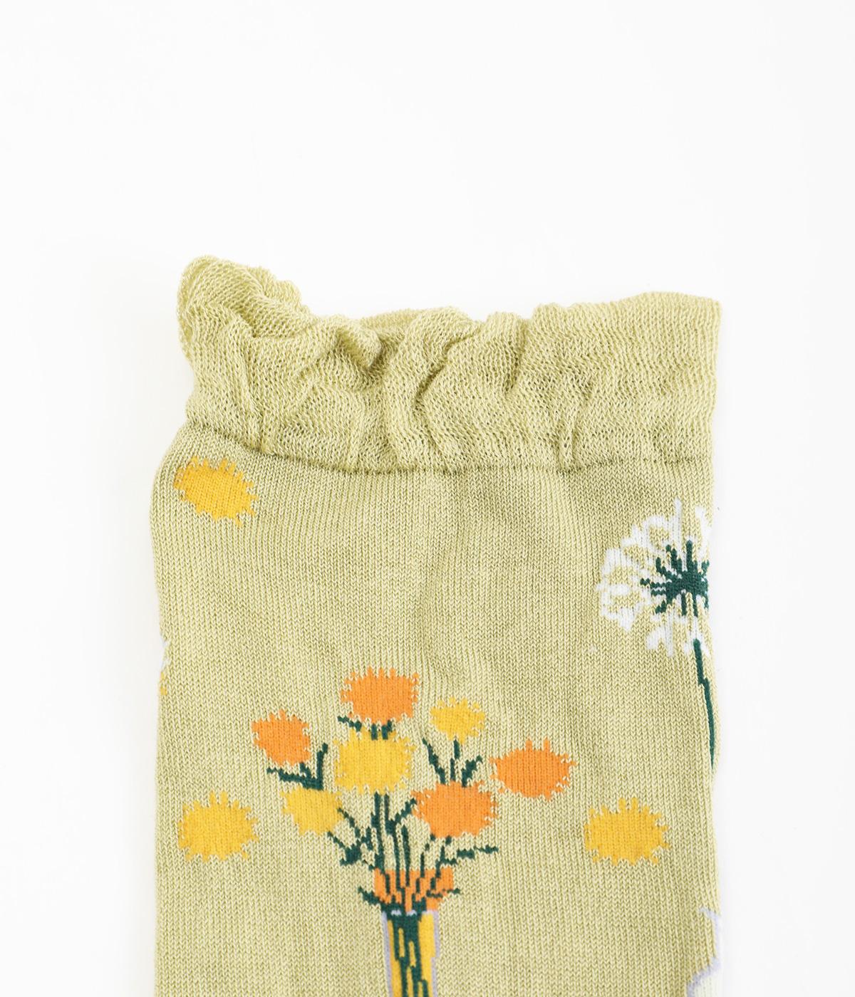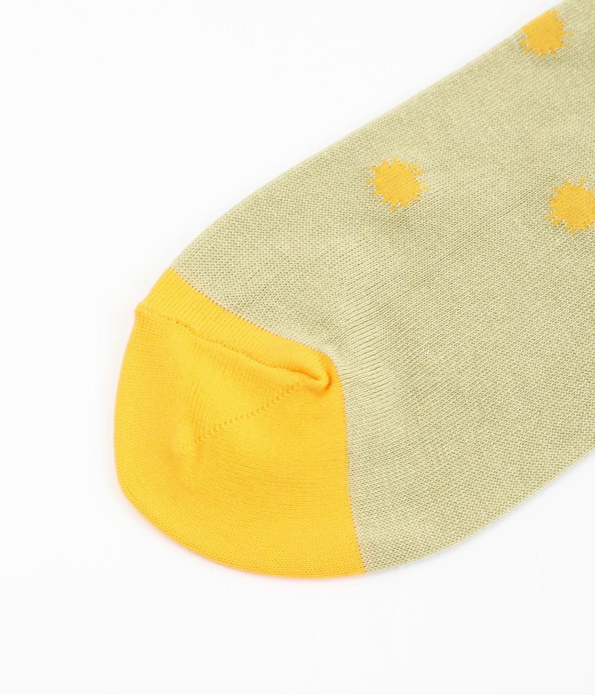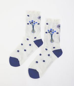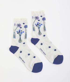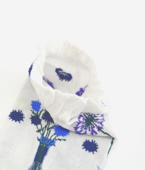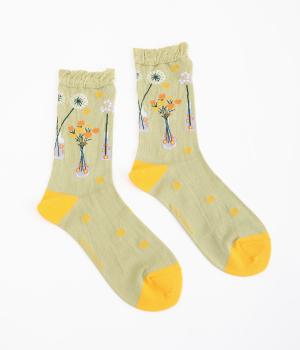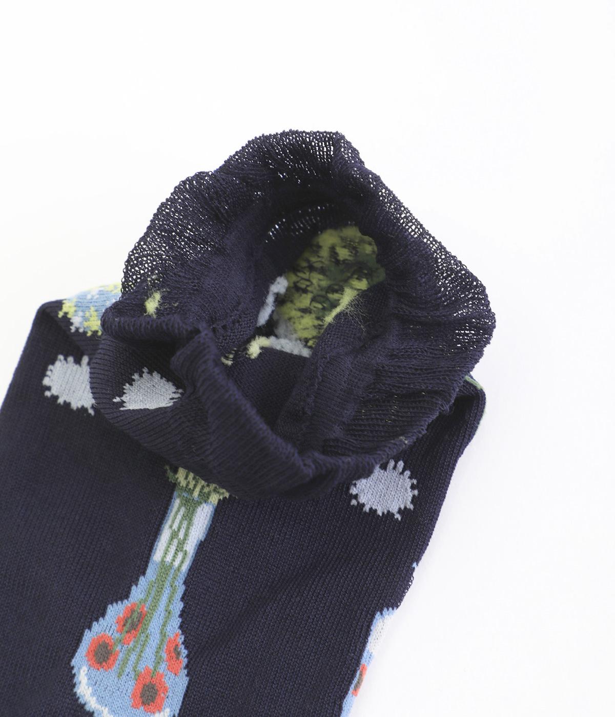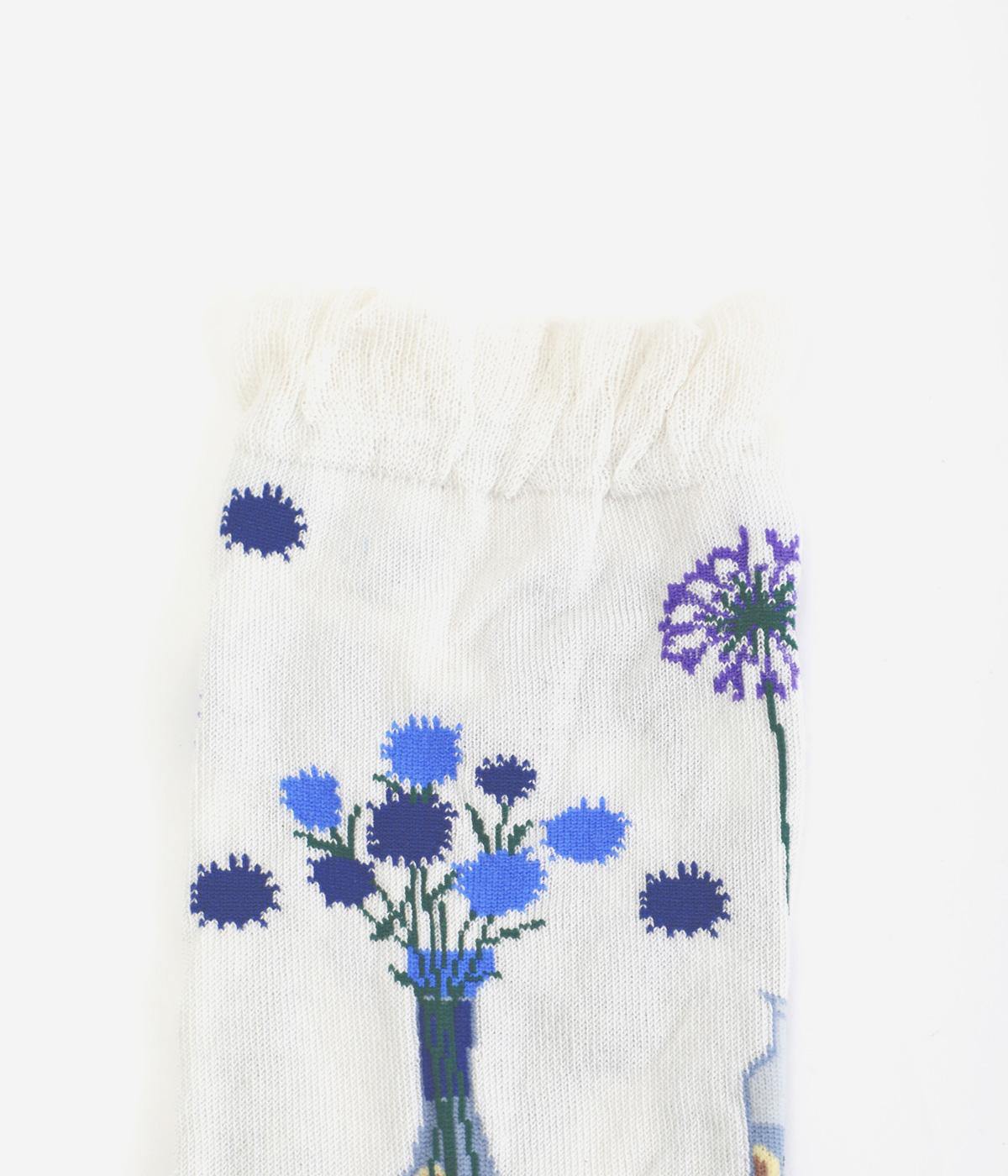 イラストレーター・マツモトヨーコさんとのコラボレーションによるデザインです。花瓶に入った花々のモチーフをぐるりとあしらい、やわらかな彩りをプラスしました。つま先やかかとには配色をきかせ、ドット柄をアクセントに。足元からコーディネートに華やかさ添えるアイテムです。