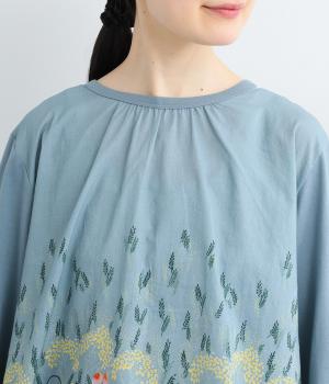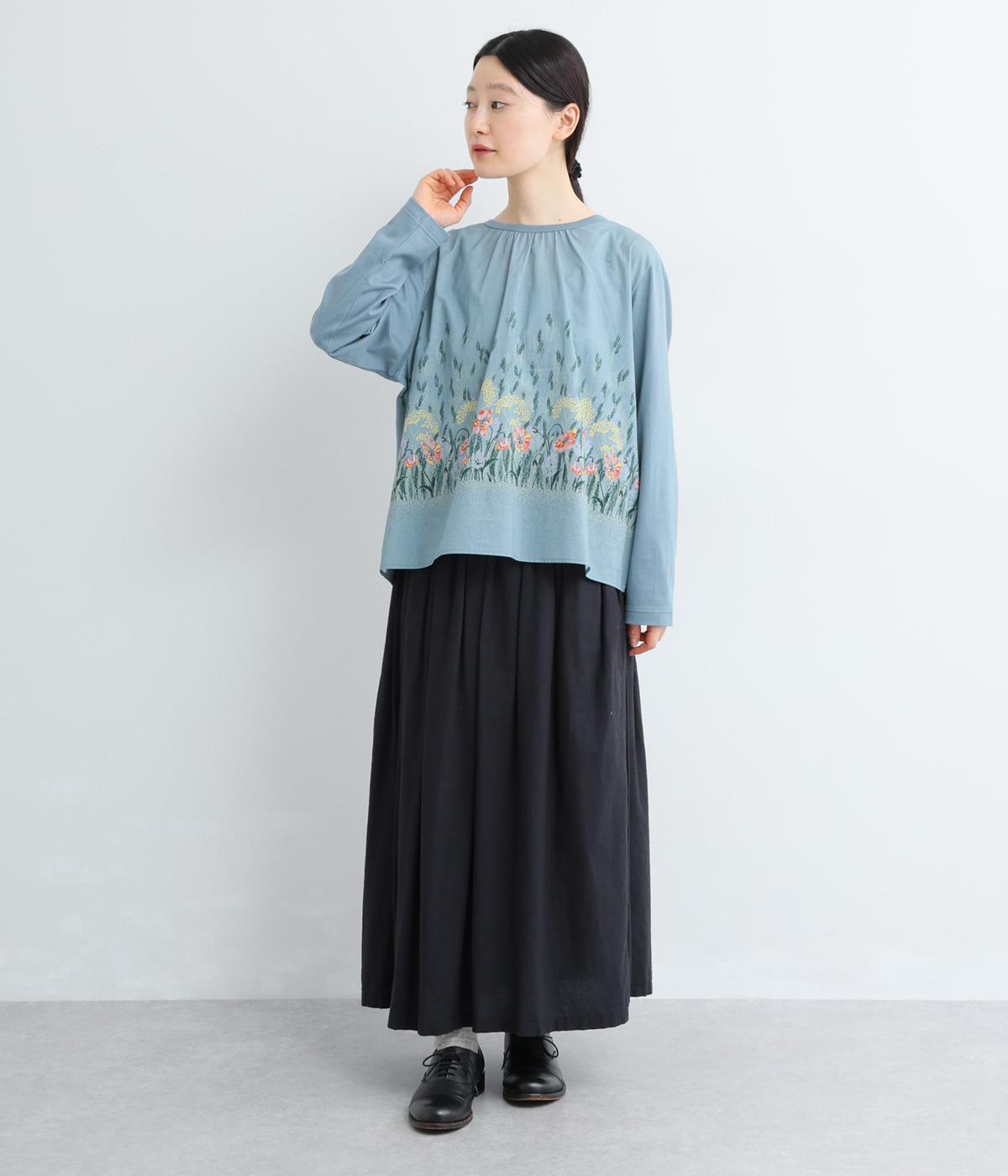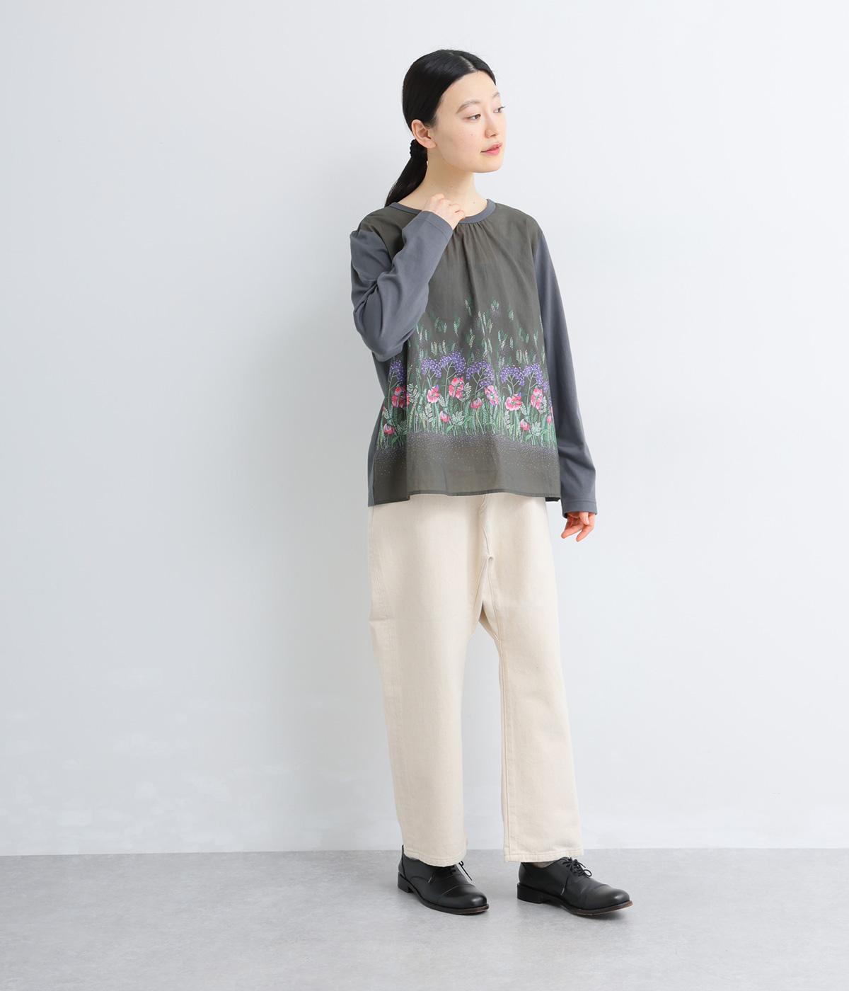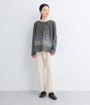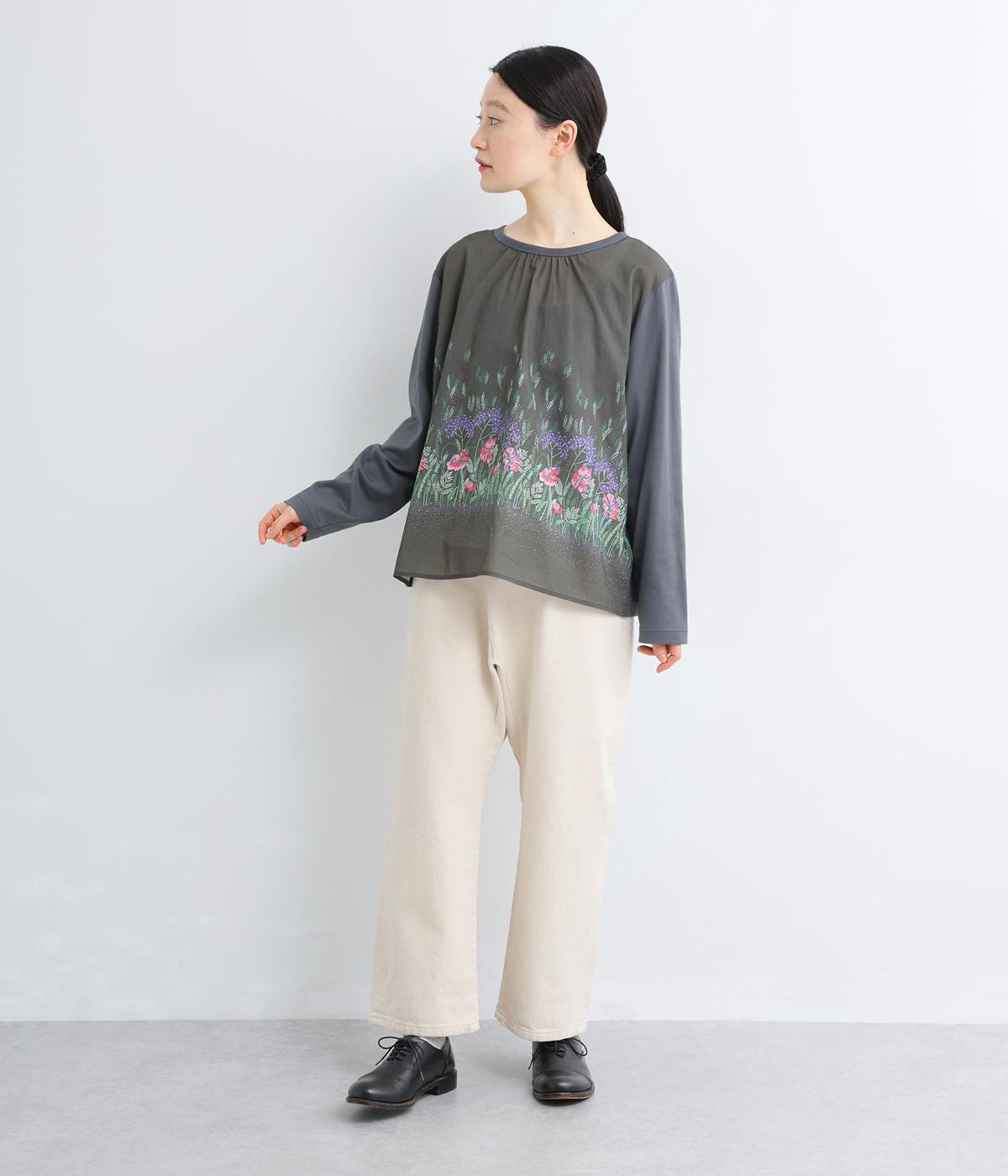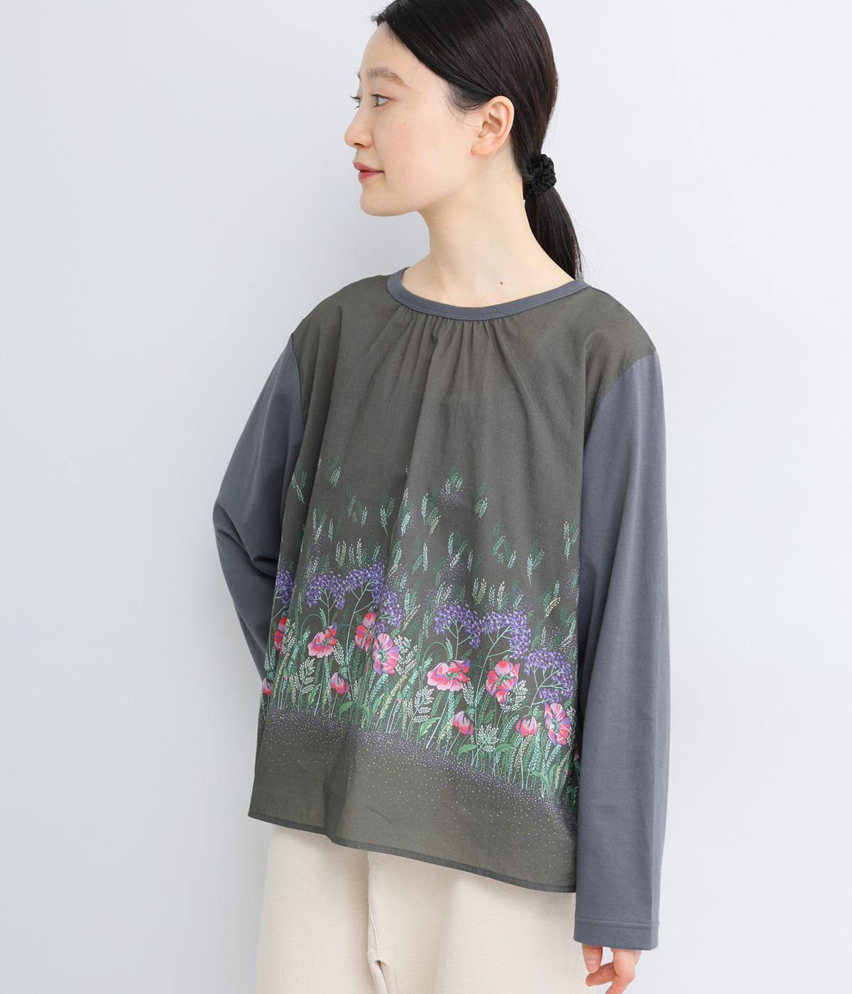 幻想的なお花のプリントが目を引くプルオーバー。ソフト天竺とコットンローンを組み合わせ、軽やかな着心地に。襟元のほんのりギャザーが優しい表情を添える、一枚でサマになるトップスです。