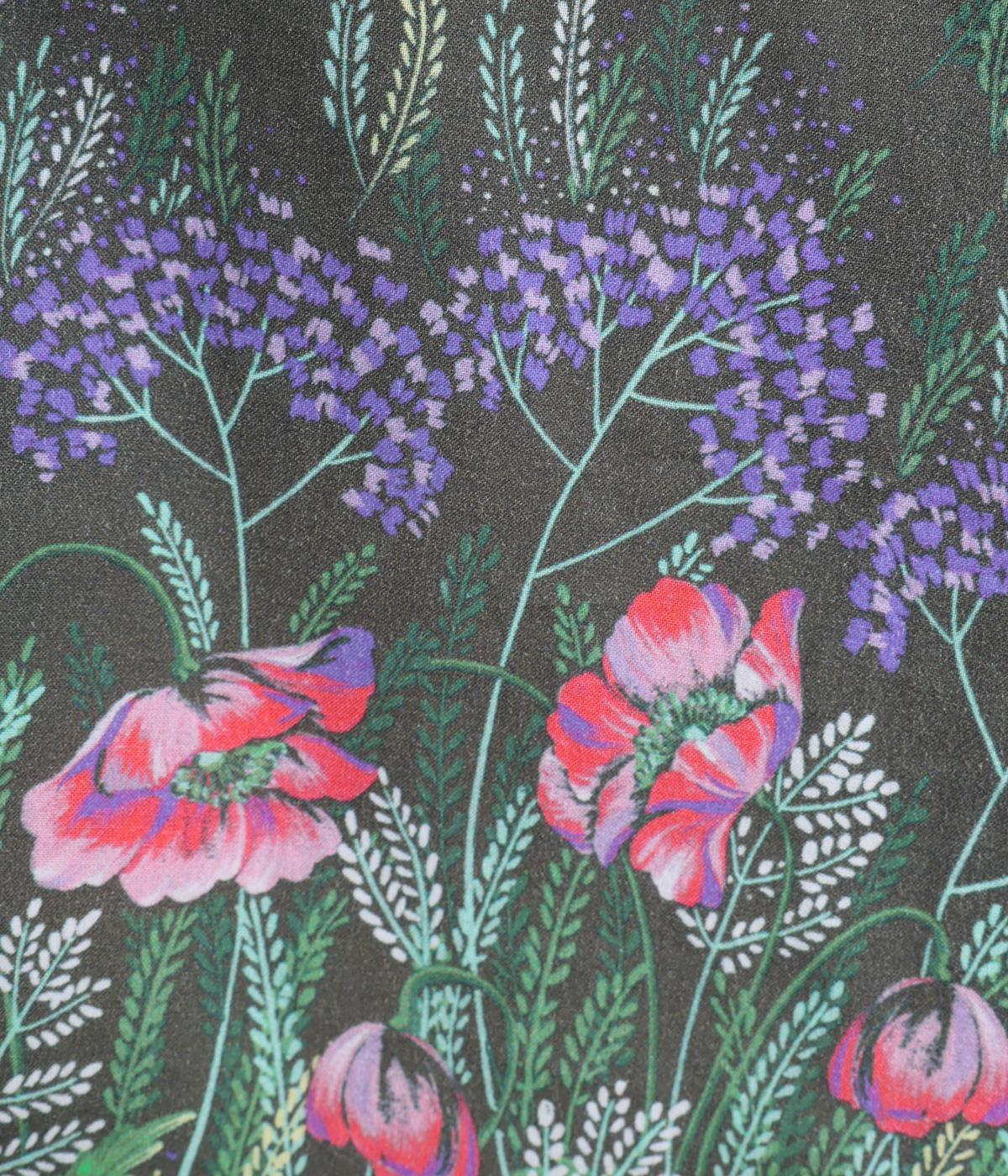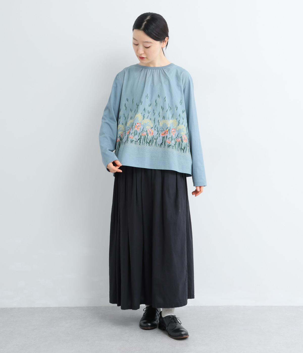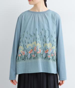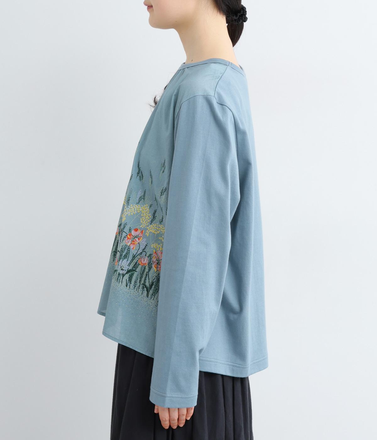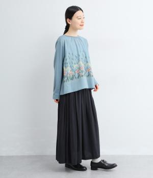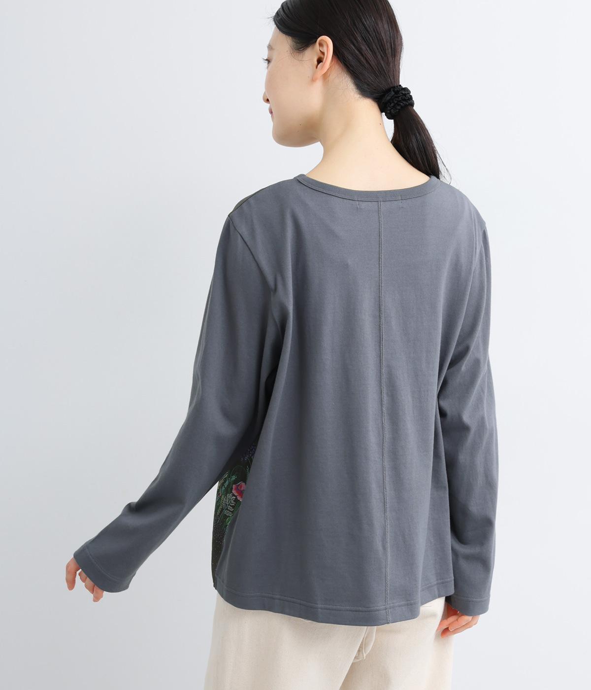 幻想的なお花のプリントが目を引くプルオーバー。ソフト天竺とコットンローンを組み合わせ、軽やかな着心地に。襟元のほんのりギャザーが優しい表情を添える、一枚でサマになるトップスです。