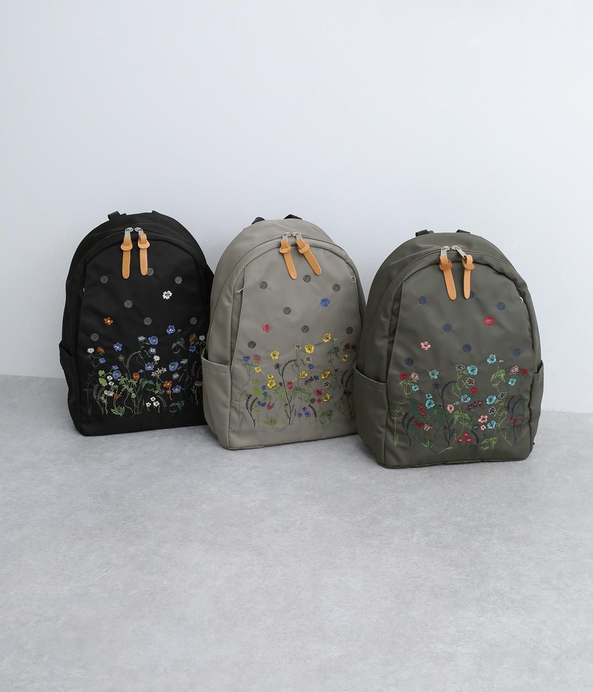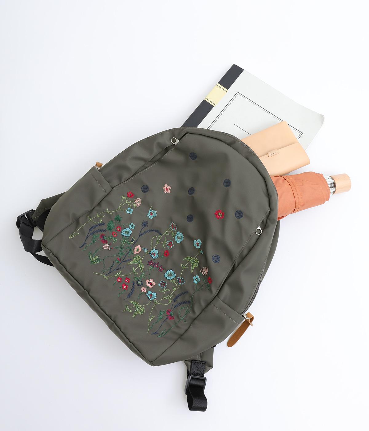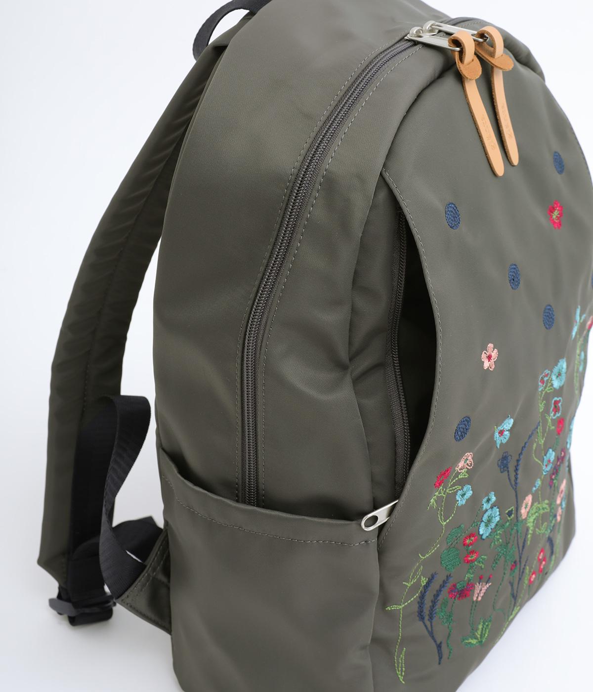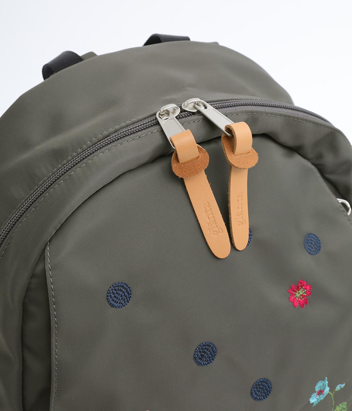 丸くラウンドしたリュックサックに、ドットやくねくねとしたラインが可愛らしいお花の刺しゅうをほどこしてガーリーテイストにアップデート。カラフルな糸使いも華やか。ポケットが多く機能性も抜群で、大きすぎず小さすぎないほどよいサイズ感に仕上げました。