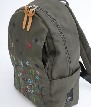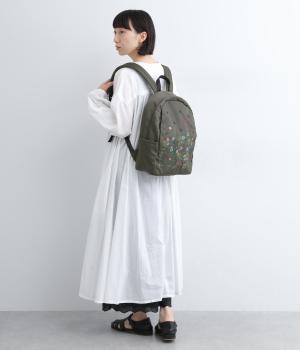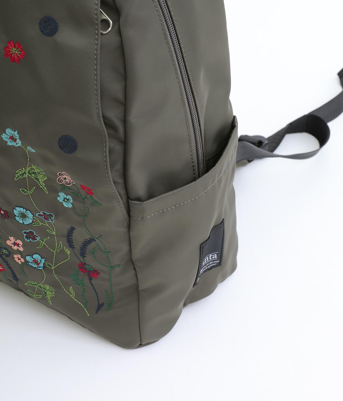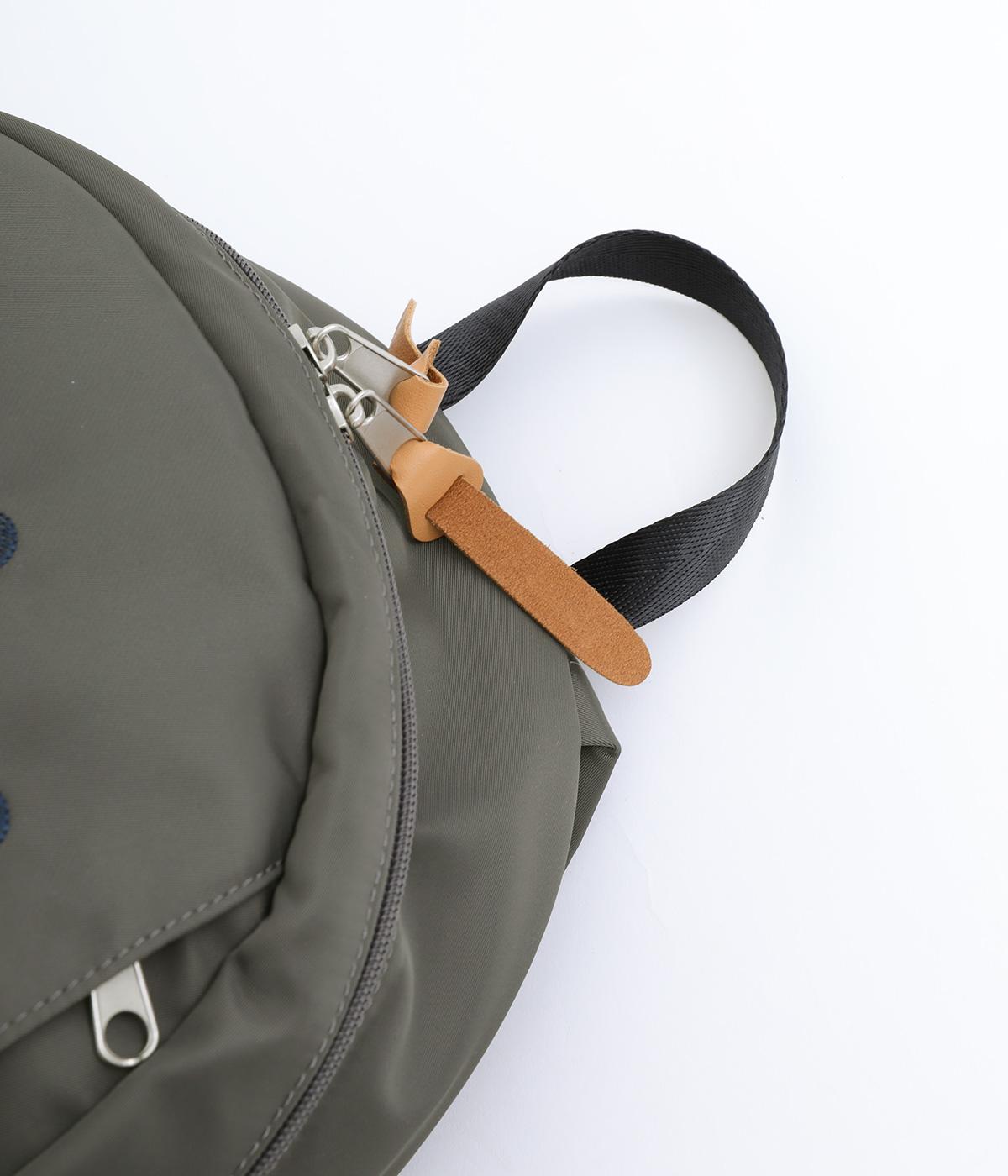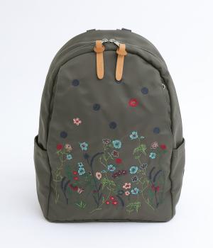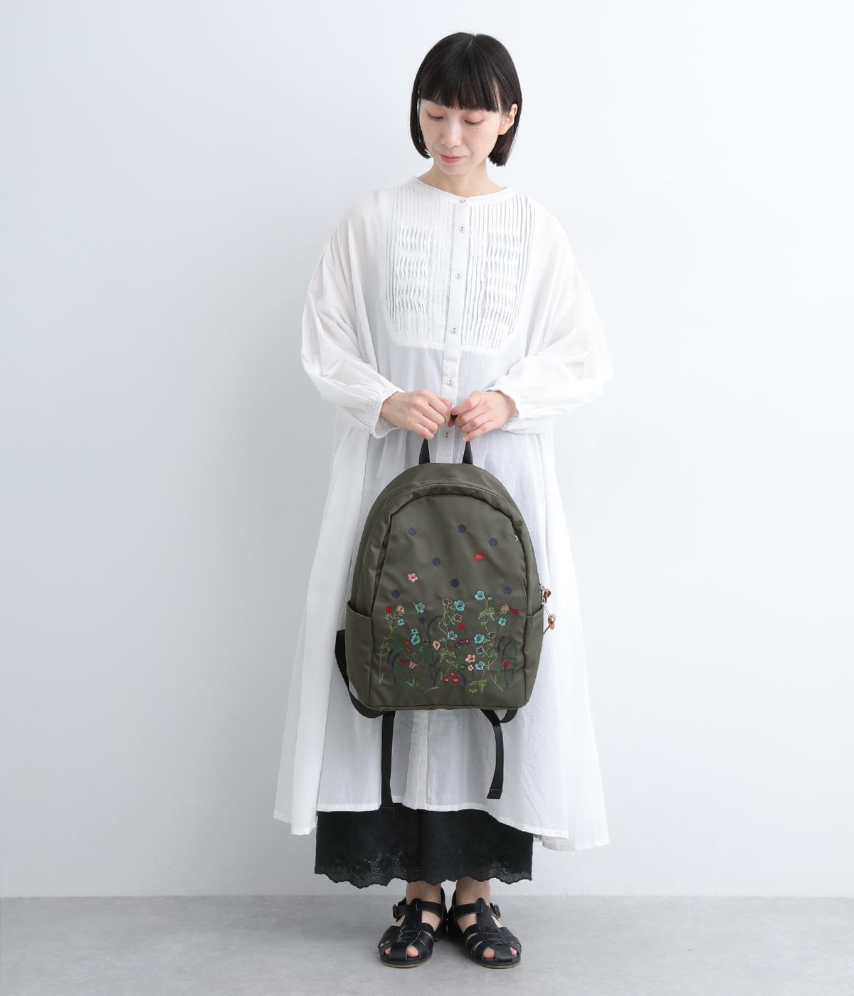 丸くラウンドしたリュックサックに、ドットやくねくねとしたラインが可愛らしいお花の刺しゅうをほどこしてガーリーテイストにアップデート。カラフルな糸使いも華やか。ポケットが多く機能性も抜群で、大きすぎず小さすぎないほどよいサイズ感に仕上げました。
