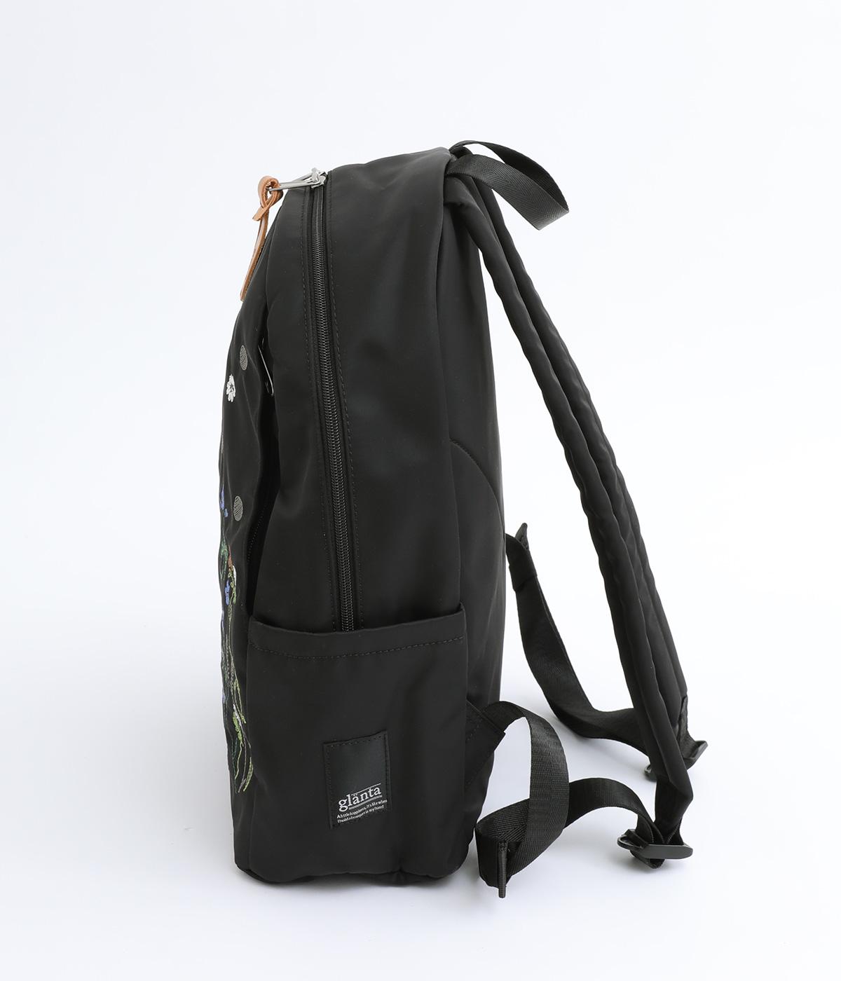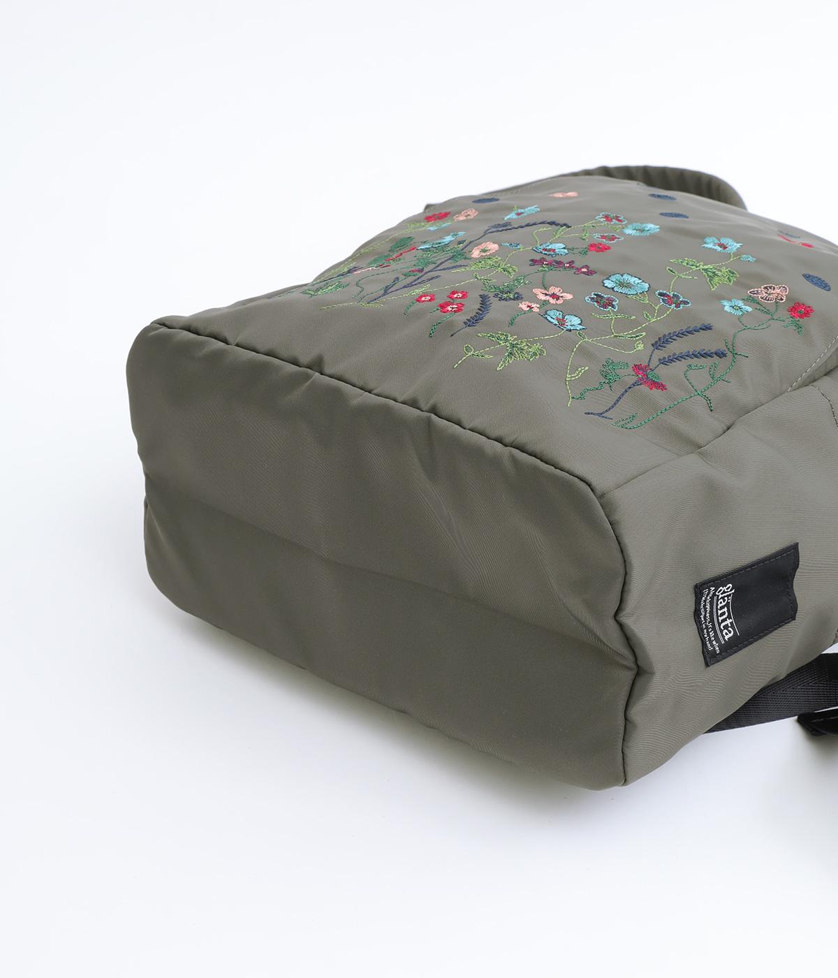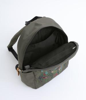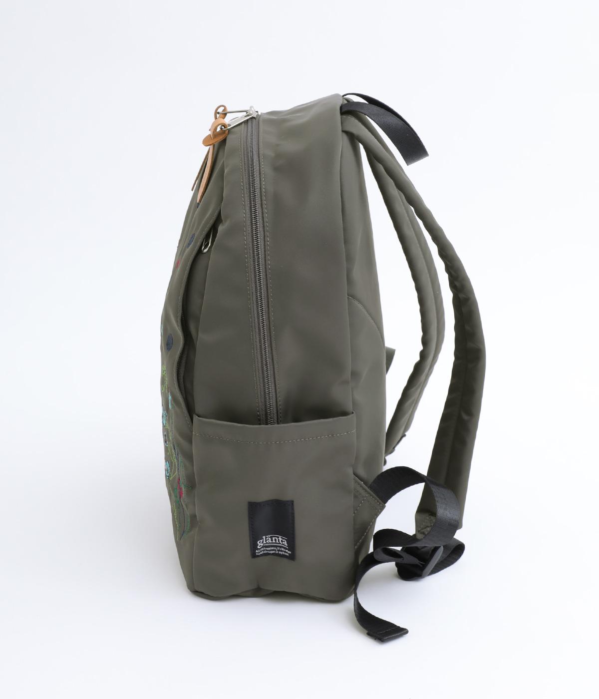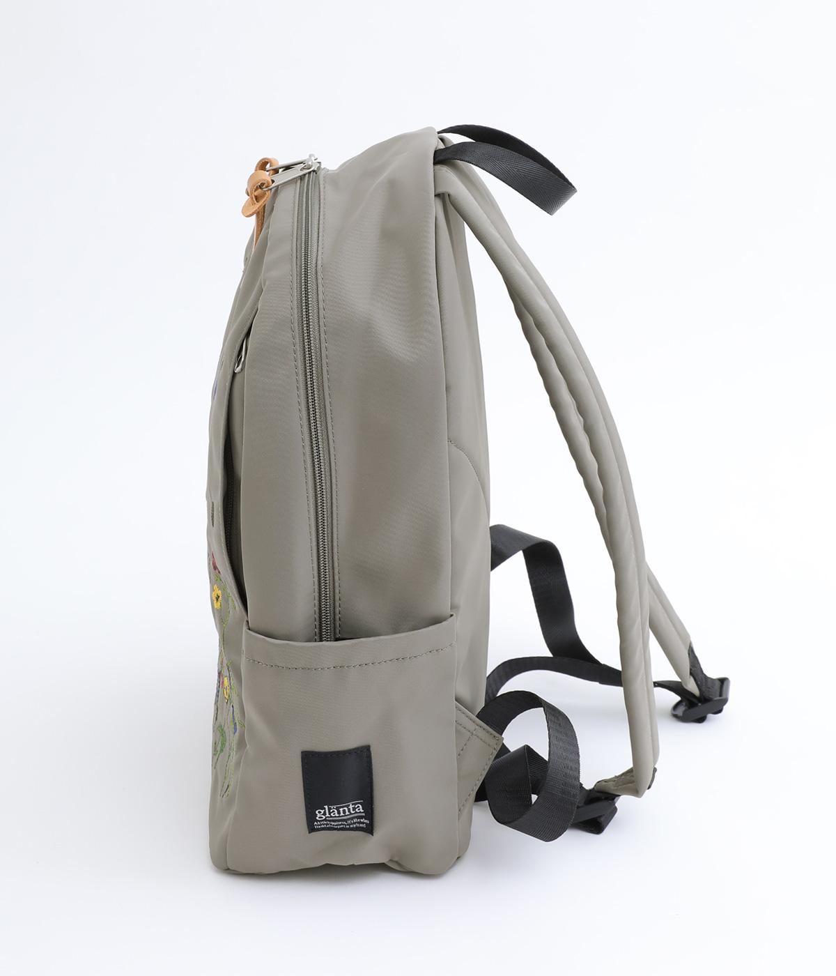丸くラウンドしたリュックサックに、ドットやくねくねとしたラインが可愛らしいお花の刺しゅうをほどこしてガーリーテイストにアップデート。カラフルな糸使いも華やか。ポケットが多く機能性も抜群で、大きすぎず小さすぎないほどよいサイズ感に仕上げました。