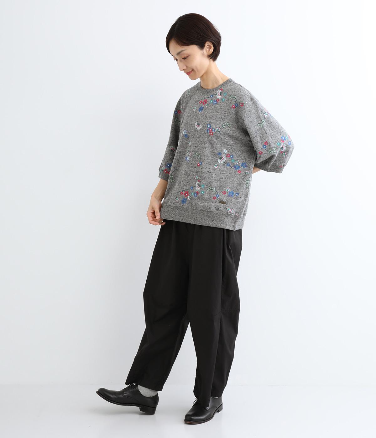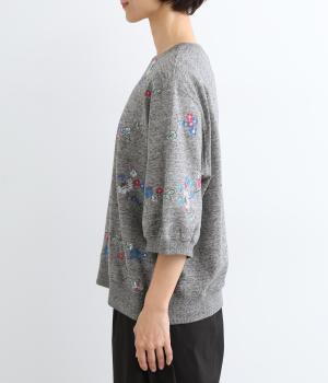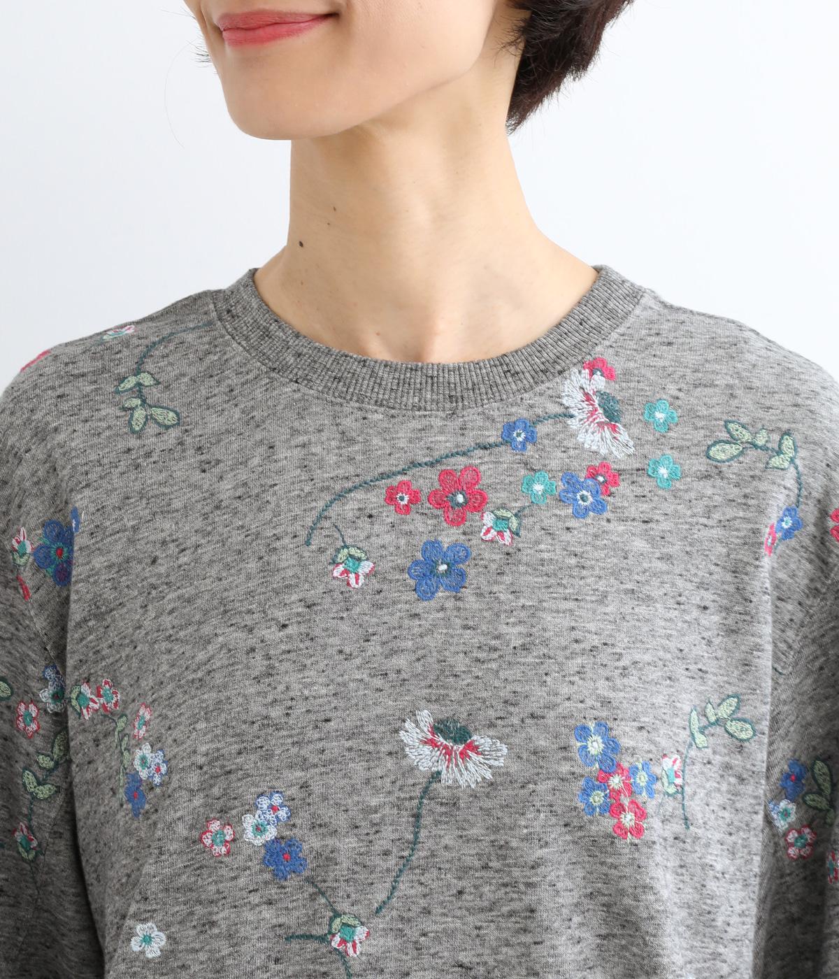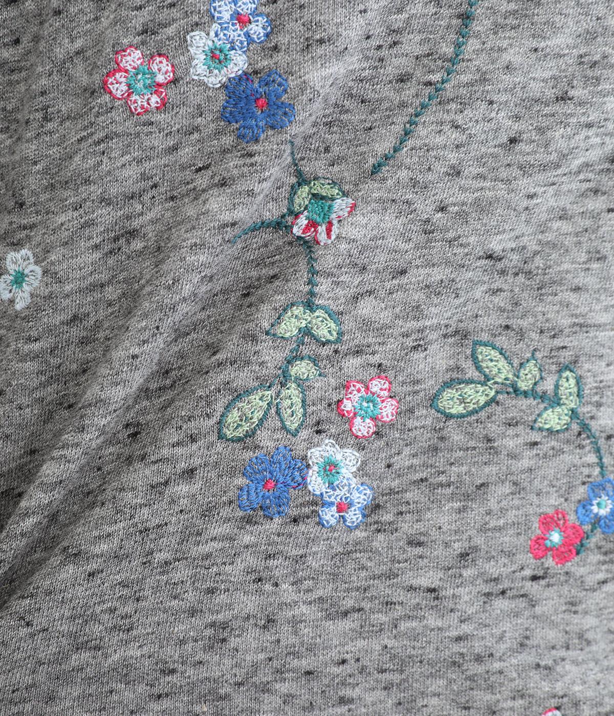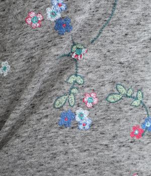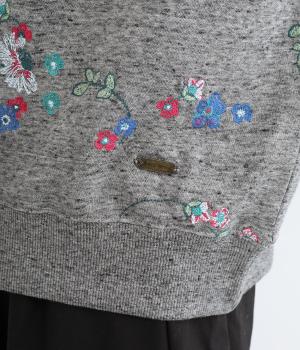 季節の変わり目にも丁度良い薄手の軽やかなコットン裏毛素材。杢糸を使用した奥行きのある色合いがポイントです。小さなお花をカラフルな刺繍で表現しました。