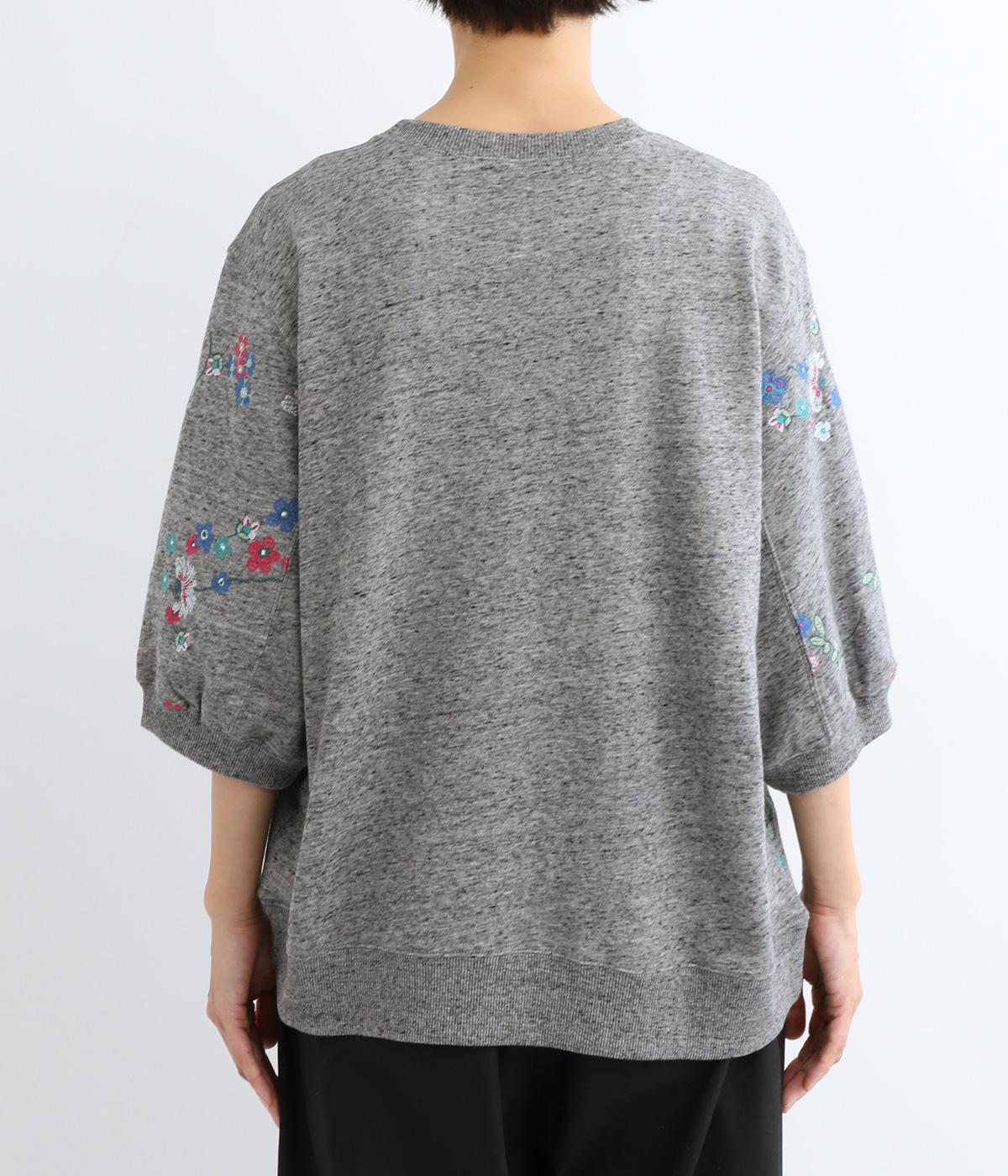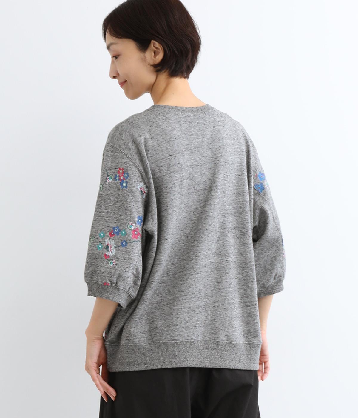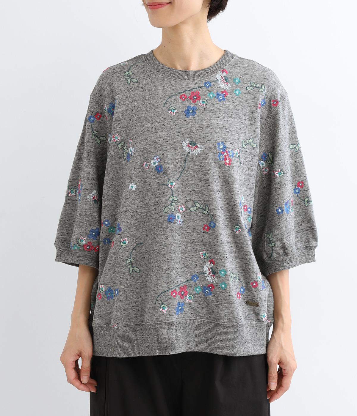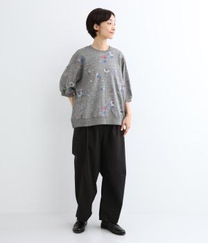 季節の変わり目にも丁度良い薄手の軽やかなコットン裏毛素材。杢糸を使用した奥行きのある色合いがポイントです。小さなお花をカラフルな刺繍で表現しました。