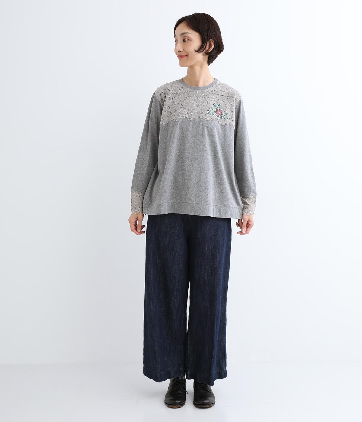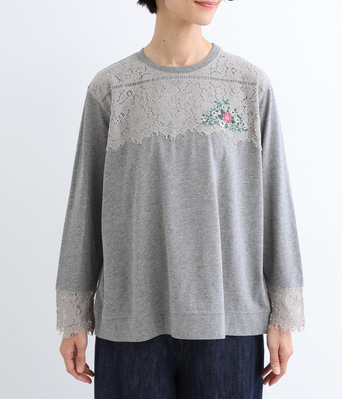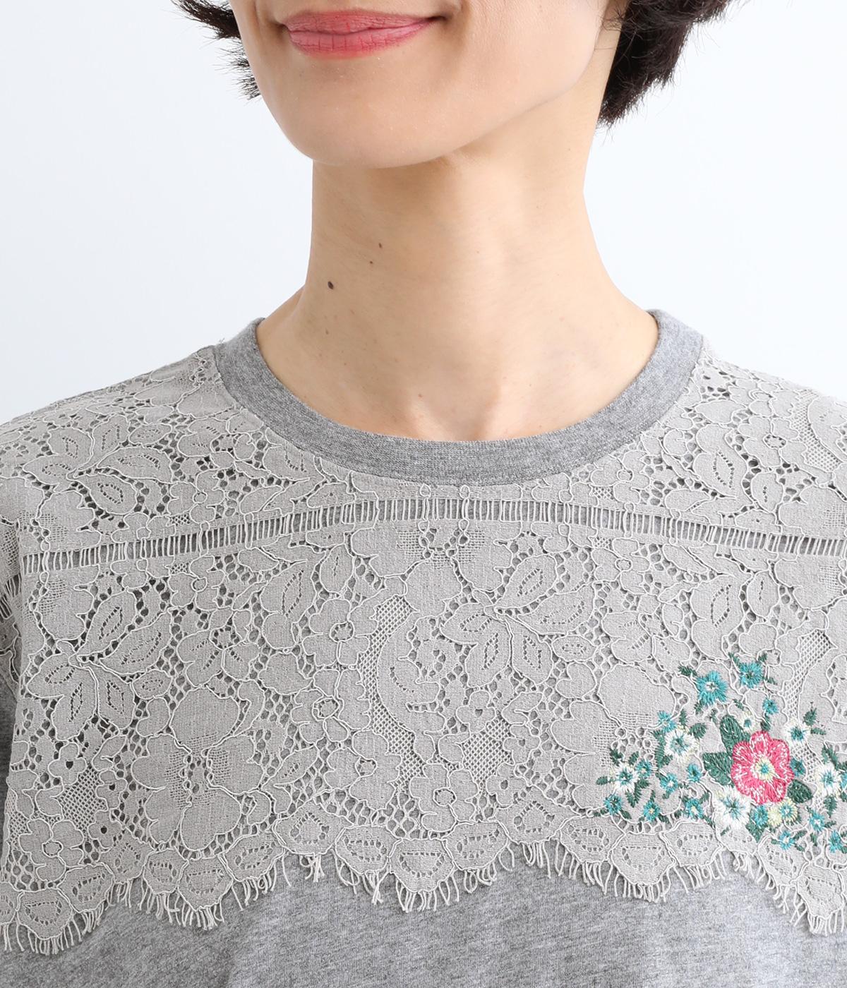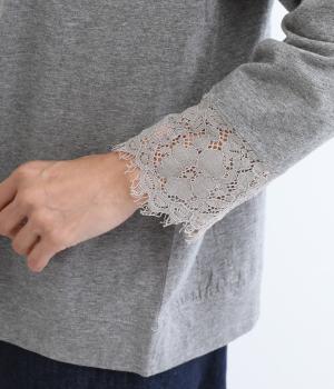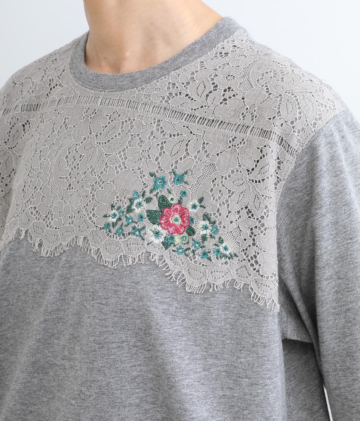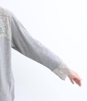 前身頃と袖にレースをプラスしたフェミニンなカットソー。胸元にはプリザードフラワーのワンポイント刺しゅうをあしらいました。レースの透け感がたのしめる袖口も素敵。一枚ではもちろん、インナーとして袖口のレースを見せるスタイリングもおすすめです。