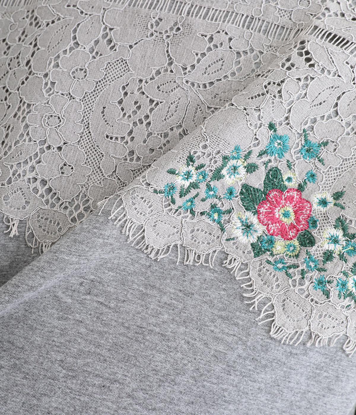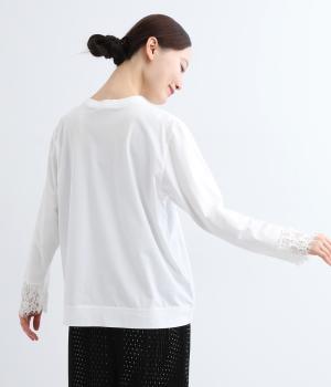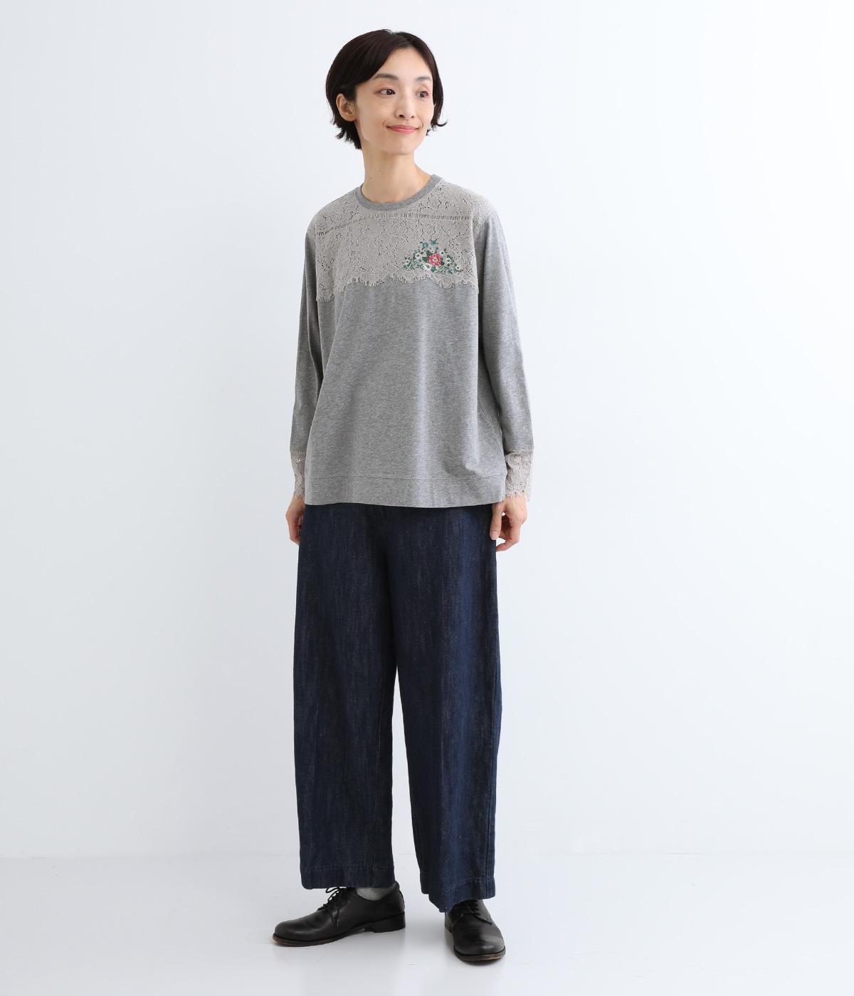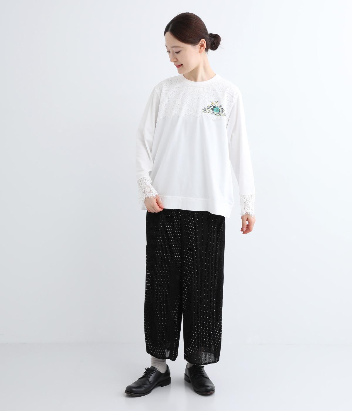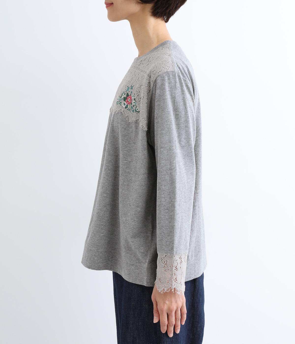 前身頃と袖にレースをプラスしたフェミニンなカットソー。胸元にはプリザードフラワーのワンポイント刺しゅうをあしらいました。レースの透け感がたのしめる袖口も素敵。一枚ではもちろん、インナーとして袖口のレースを見せるスタイリングもおすすめです。