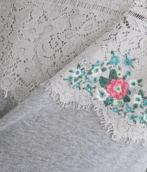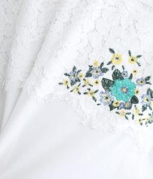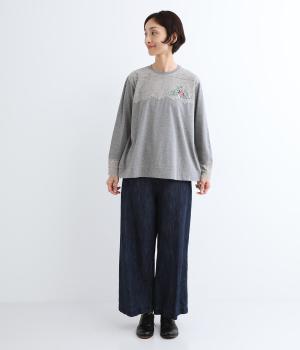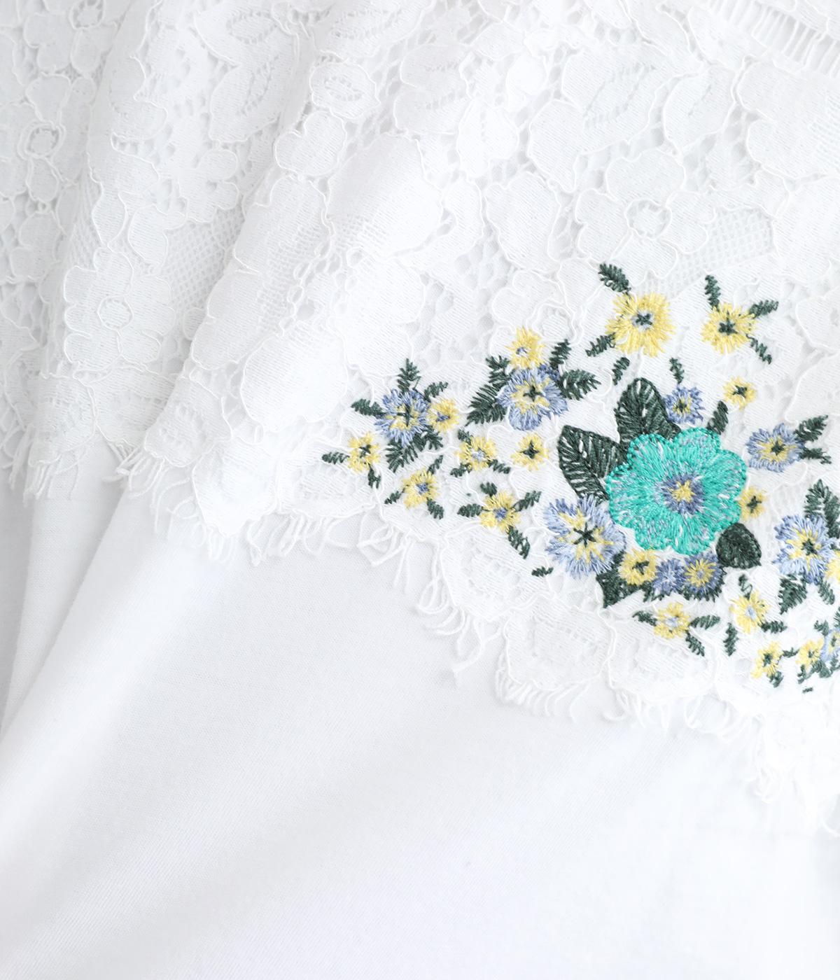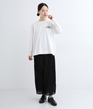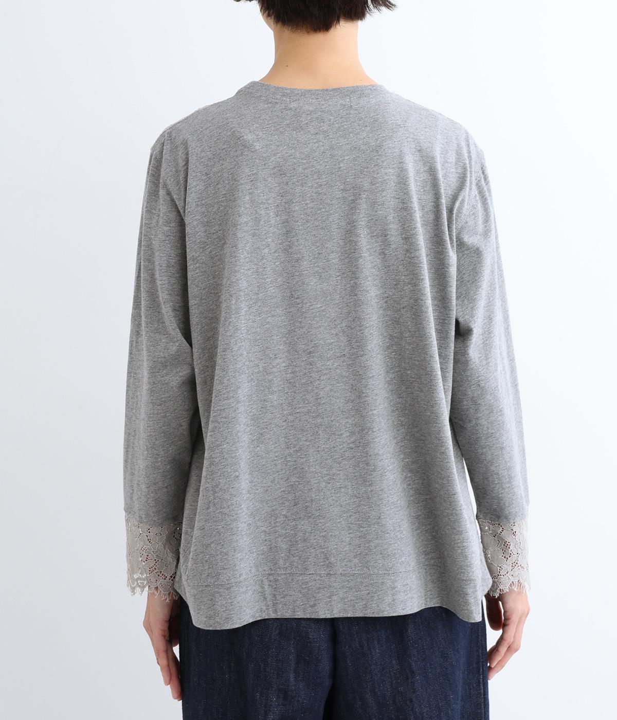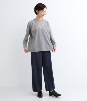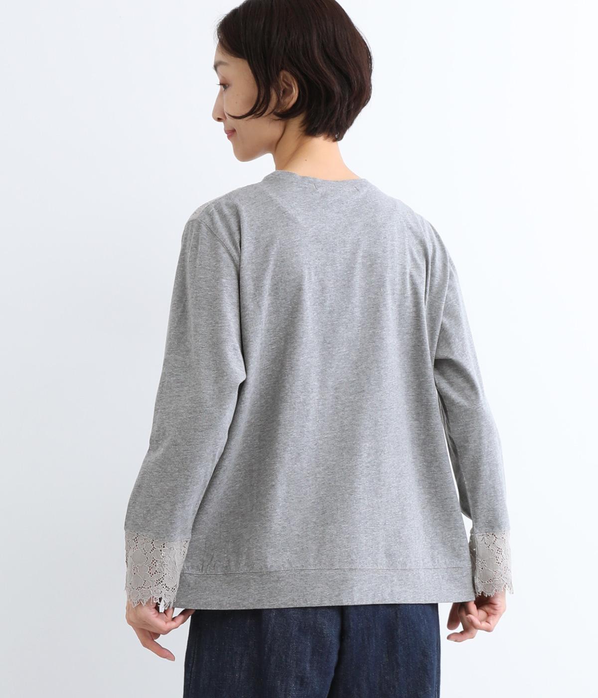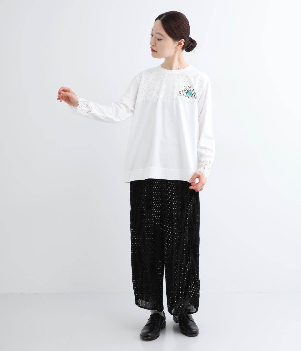 前身頃と袖にレースをプラスしたフェミニンなカットソー。胸元にはプリザードフラワーのワンポイント刺しゅうをあしらいました。レースの透け感がたのしめる袖口も素敵。一枚ではもちろん、インナーとして袖口のレースを見せるスタイリングもおすすめです。