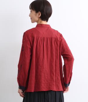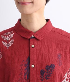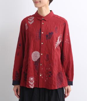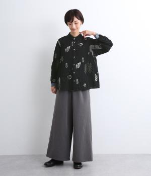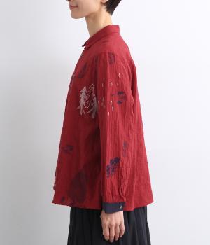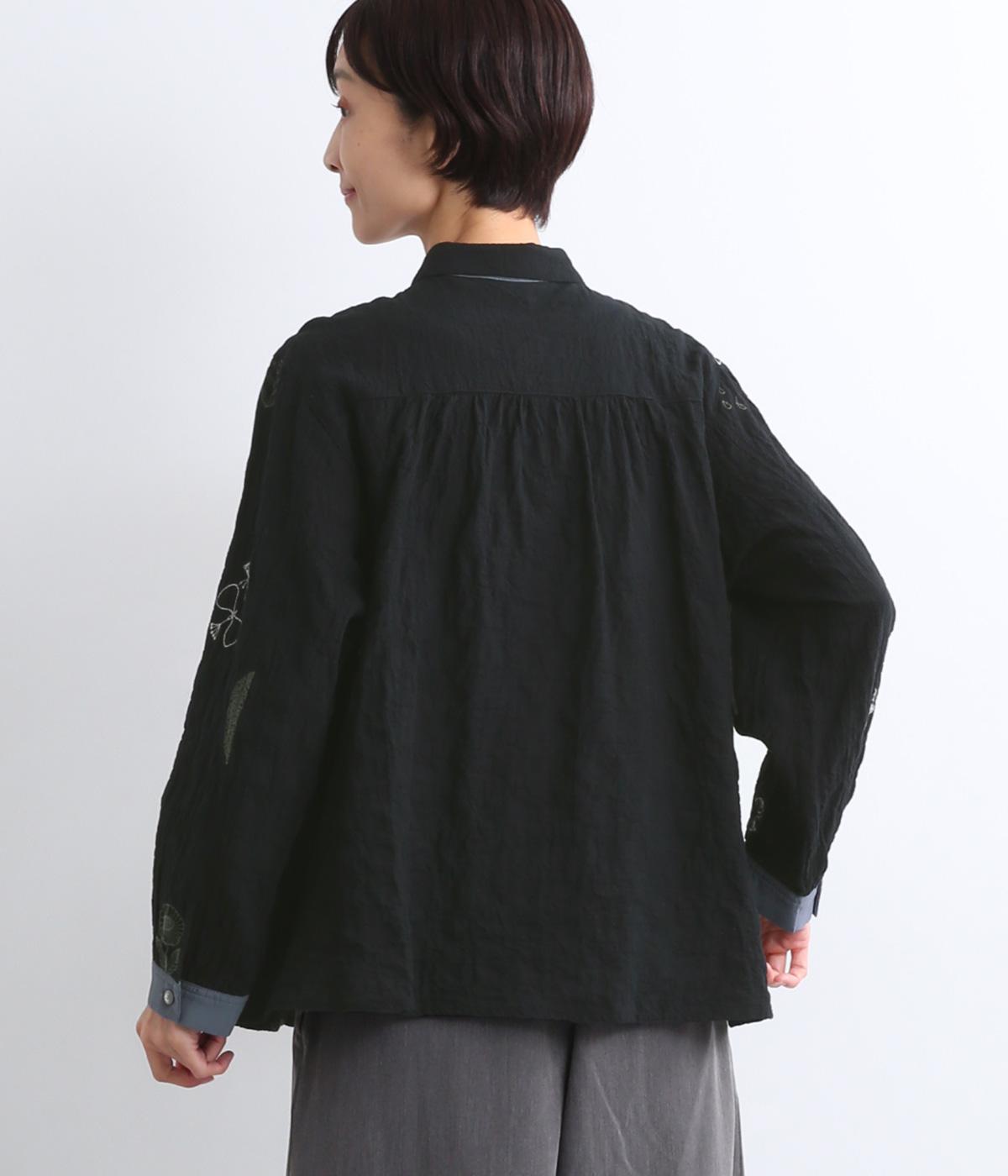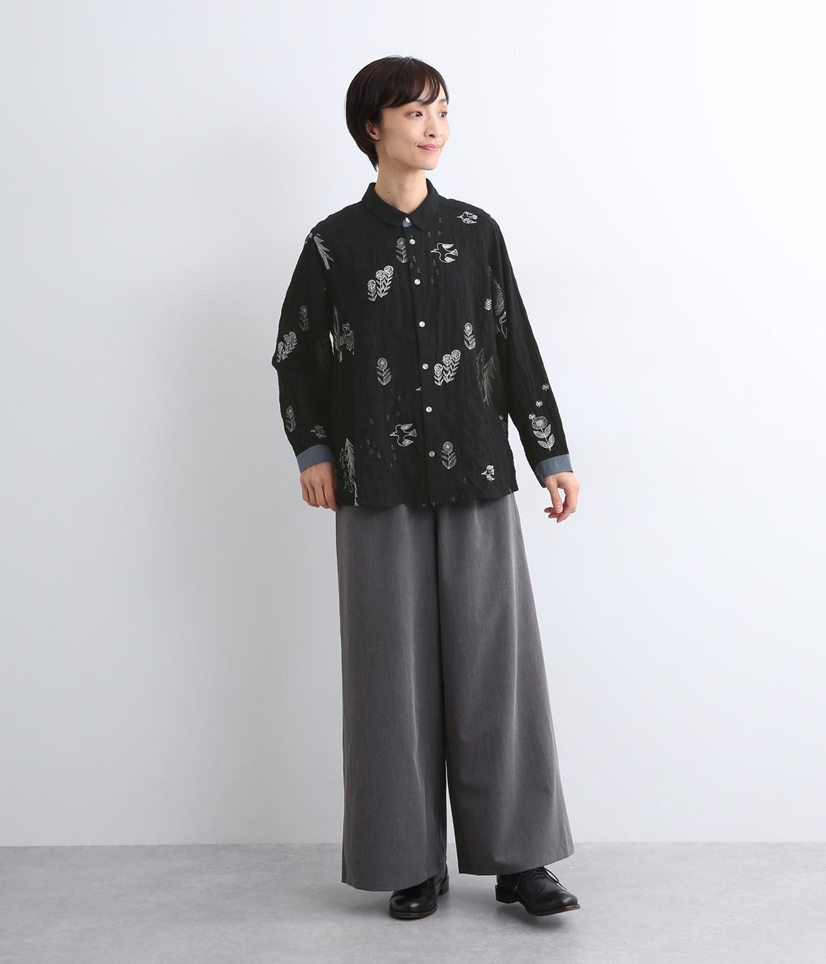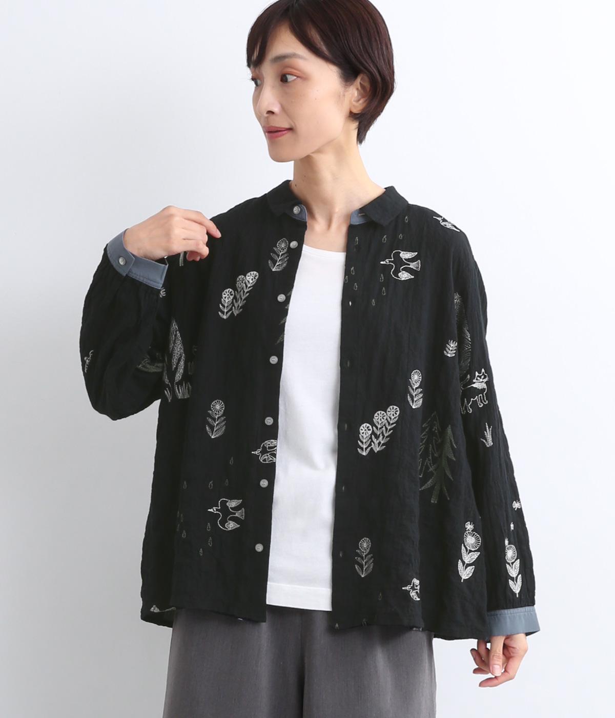 銅版画家、保坂優子さんの描く動物や木々のモチーフをMIXさせ、総刺しゅうで表現しました。袖口や後ろヨークにギャザーをあしらい生地をたっぷりと使用した、かわいらしいデザイン。カフスと台襟には配色の別地を使用してアクセントにしています。