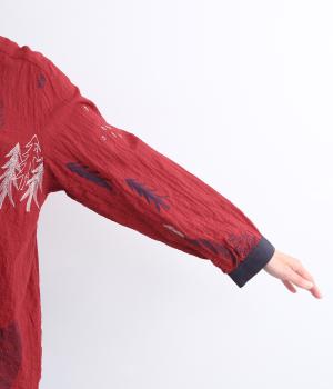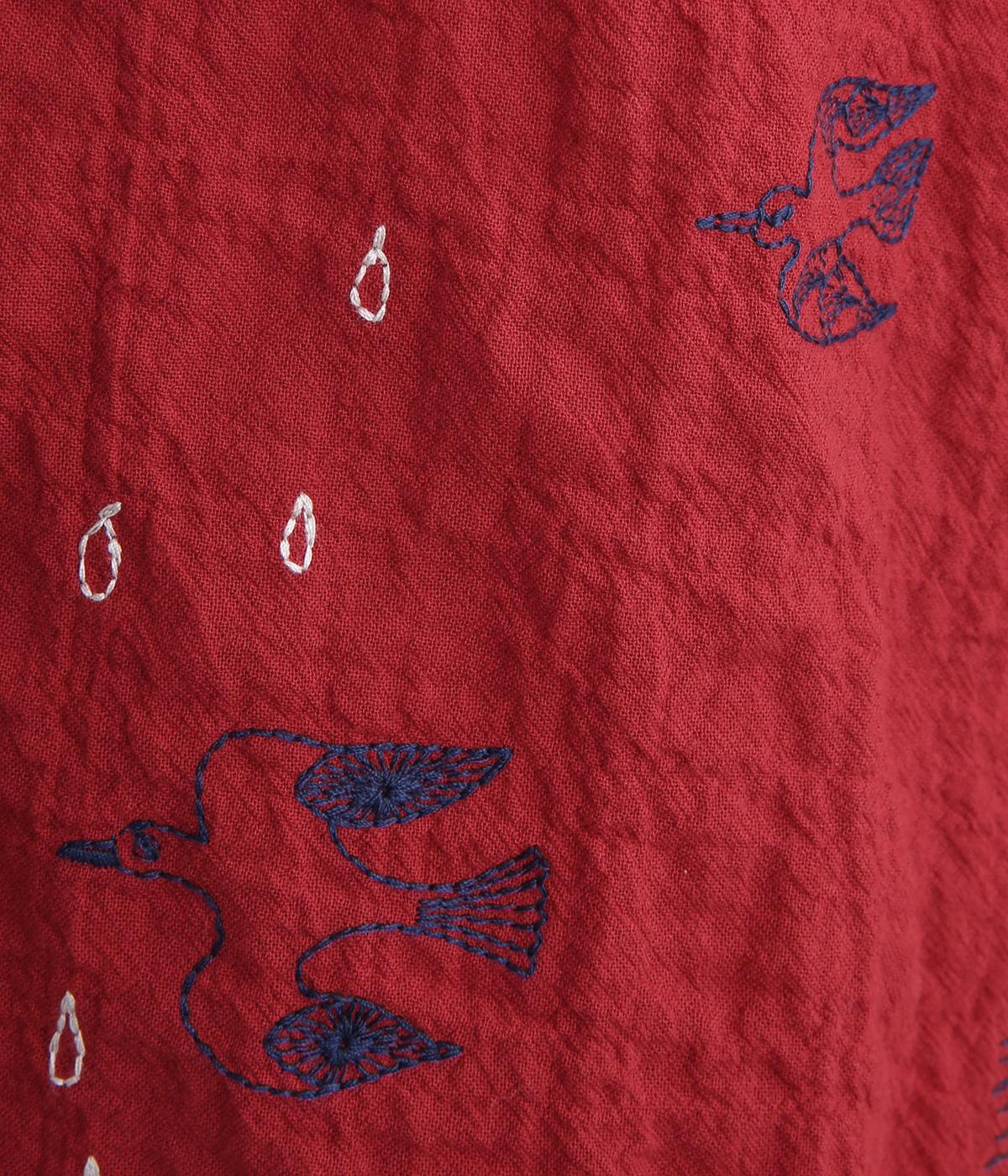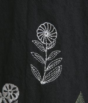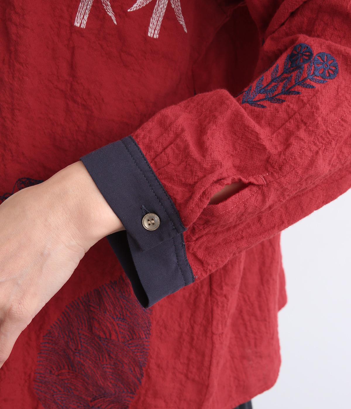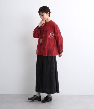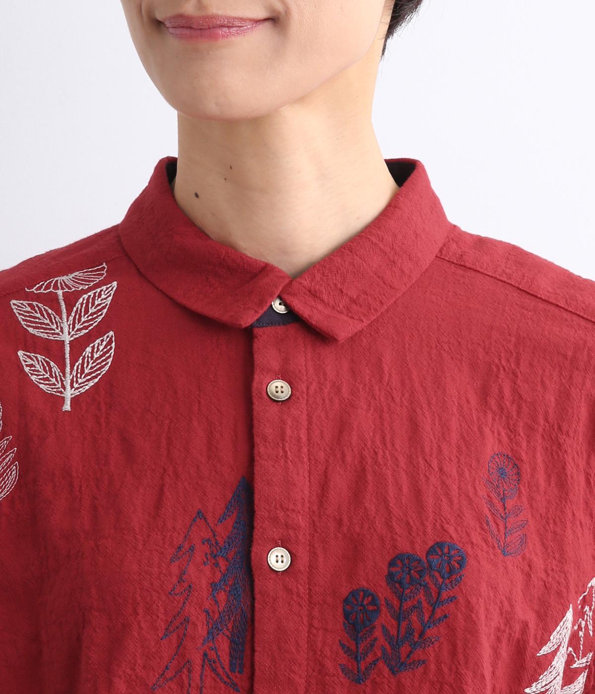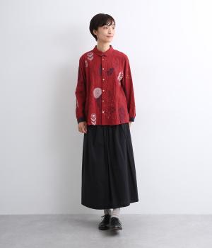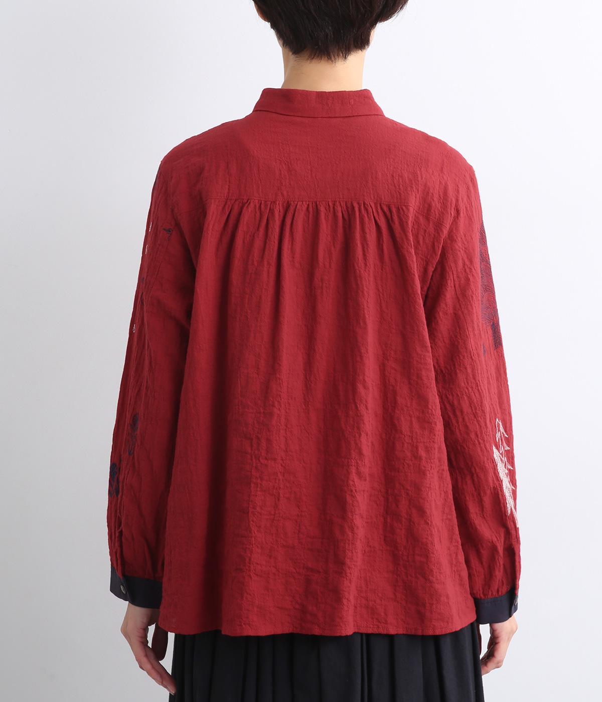 銅版画家、保坂優子さんの描く動物や木々のモチーフをMIXさせ、総刺しゅうで表現しました。袖口や後ろヨークにギャザーをあしらい生地をたっぷりと使用した、かわいらしいデザイン。カフスと台襟には配色の別地を使用してアクセントにしています。