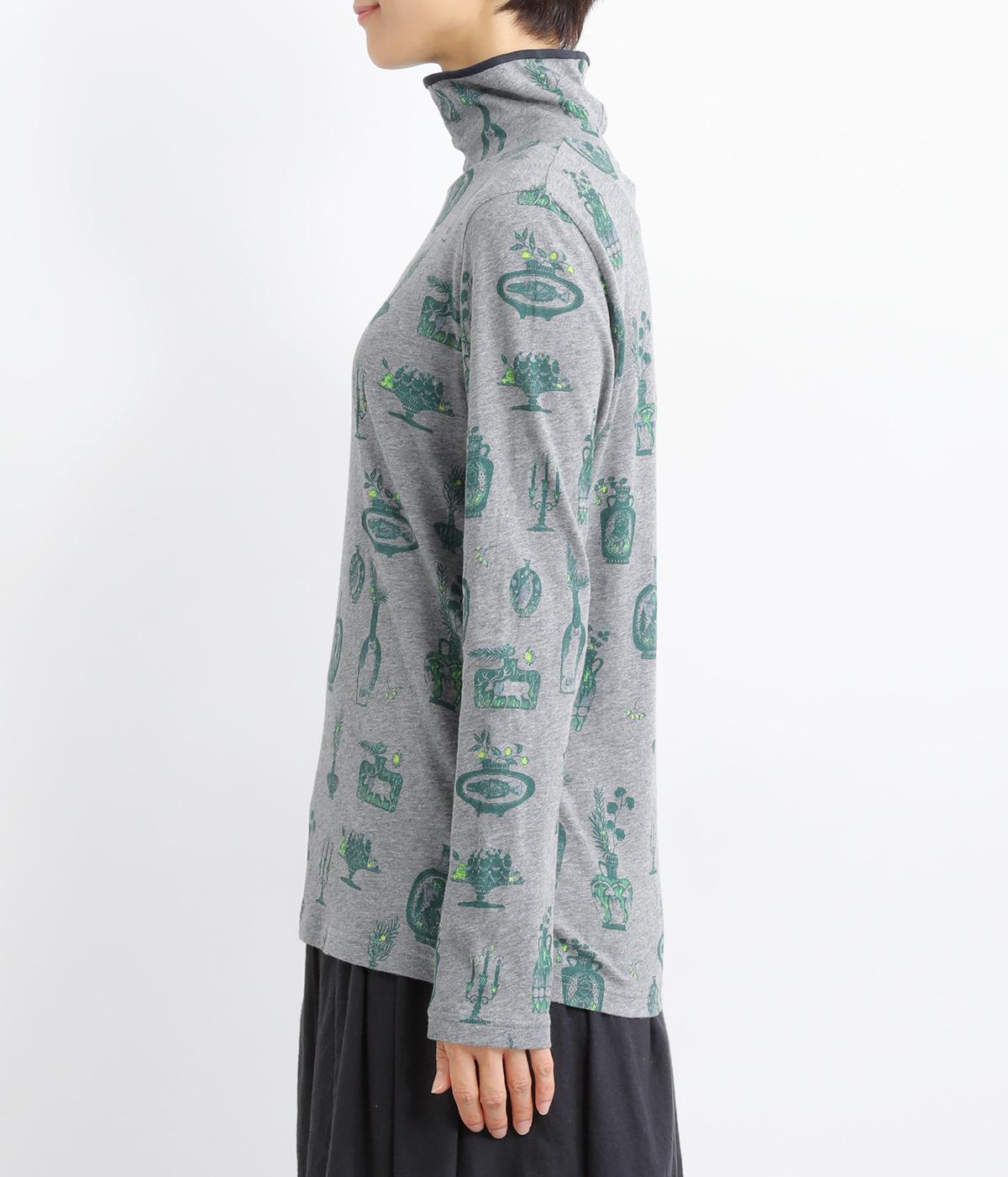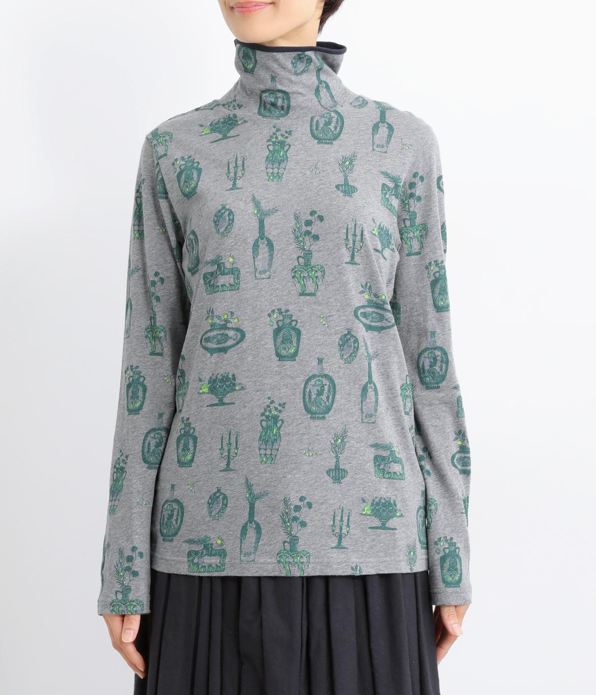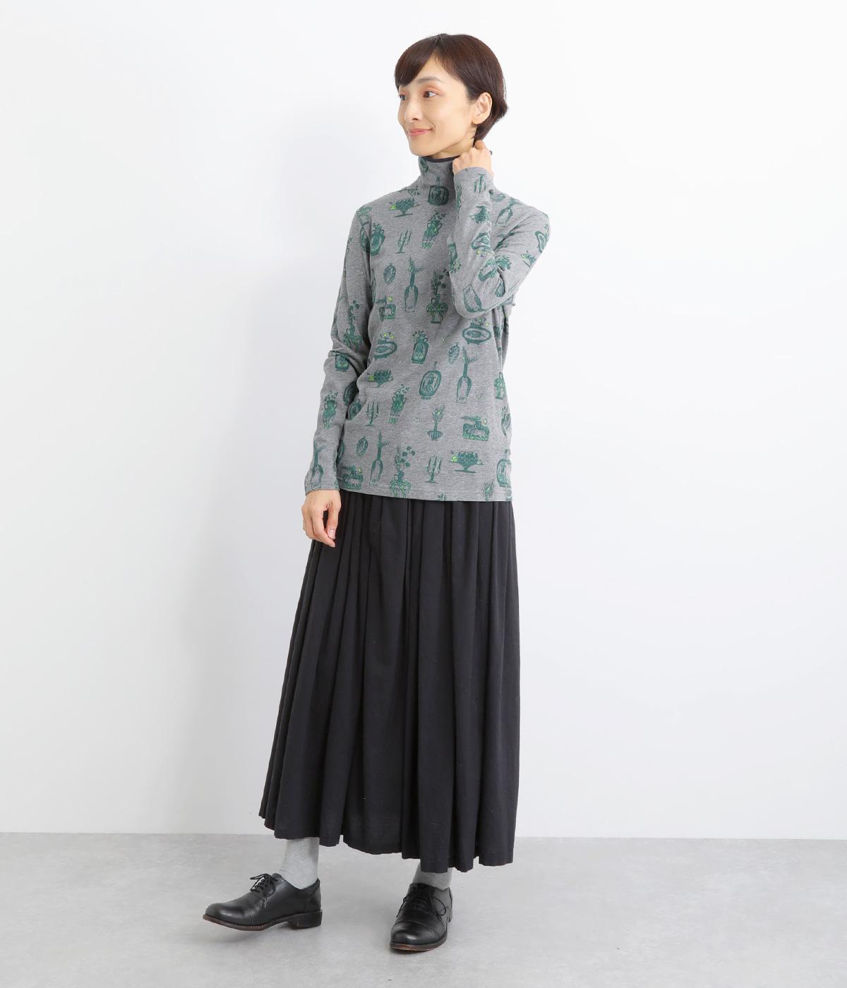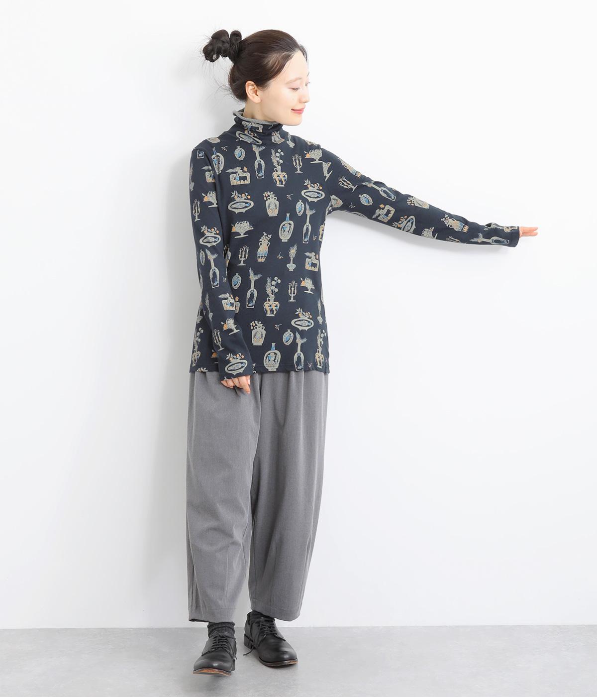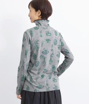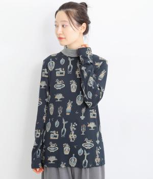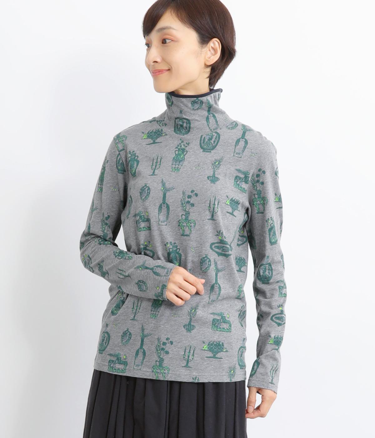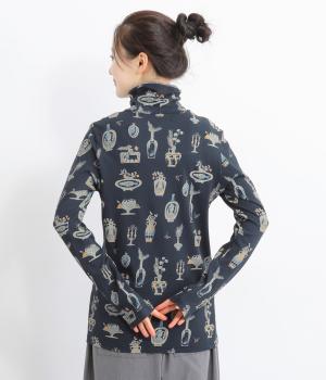 銅版画家の保坂優子さんとコラボレーションしたタートルネックカットソー。魚や猫などが隠れたかわいらしいボトルモチーフを染料プリントしています。襟の内側を無地の配色にしているので、折り返して中の色味を見せるスタイルも素敵です。