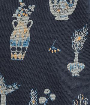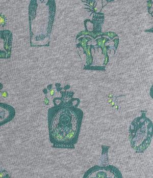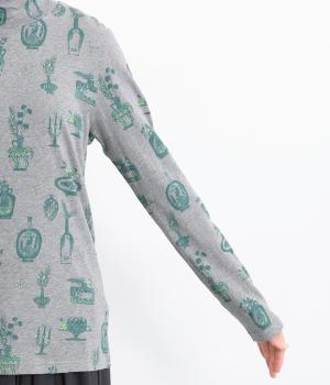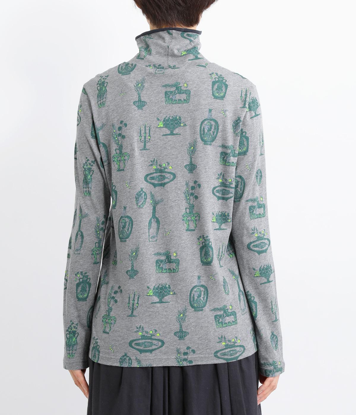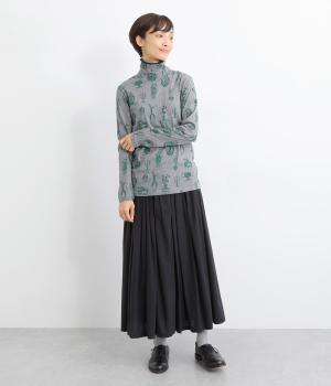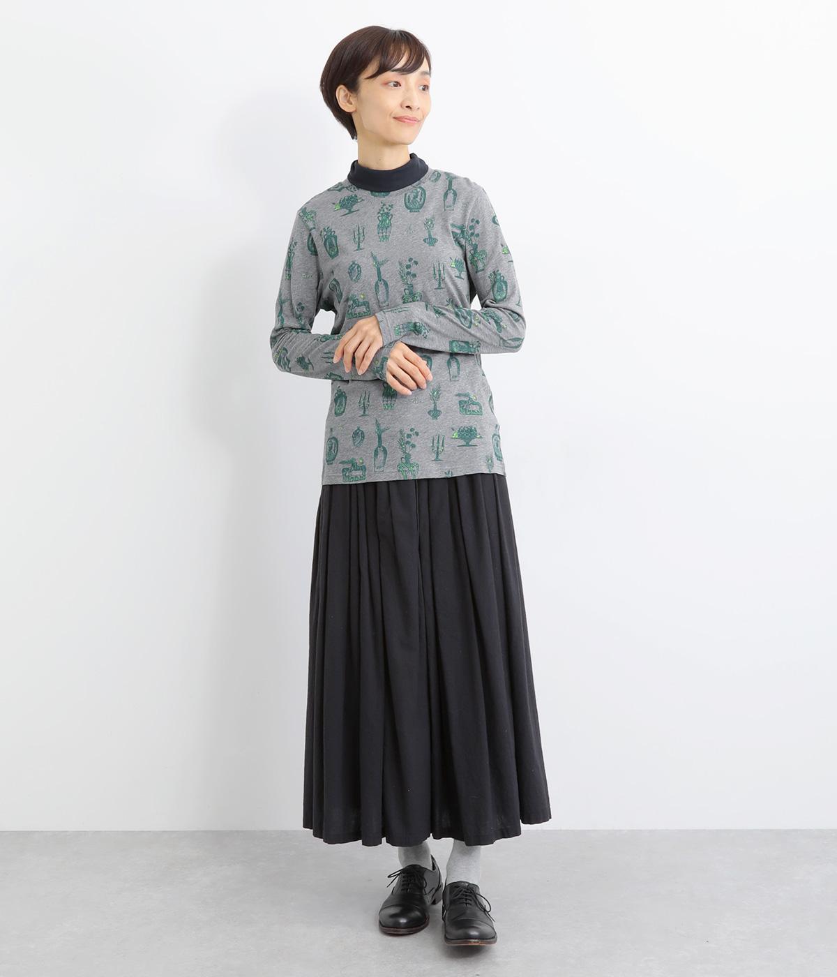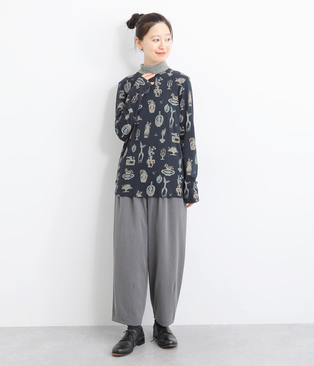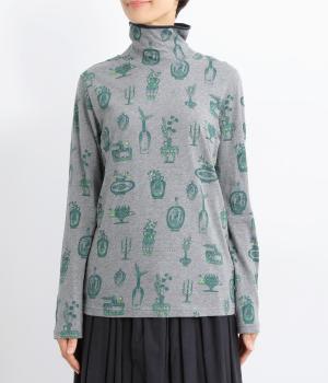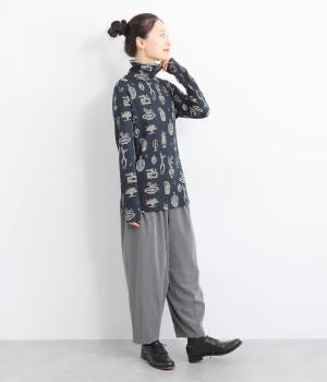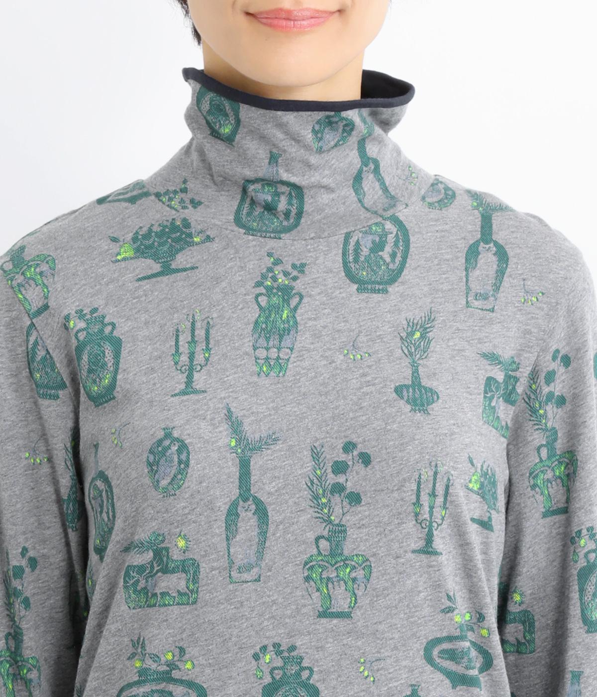 銅版画家の保坂優子さんとコラボレーションしたタートルネックカットソー。魚や猫などが隠れたかわいらしいボトルモチーフを染料プリントしています。襟の内側を無地の配色にしているので、折り返して中の色味を見せるスタイルも素敵です。