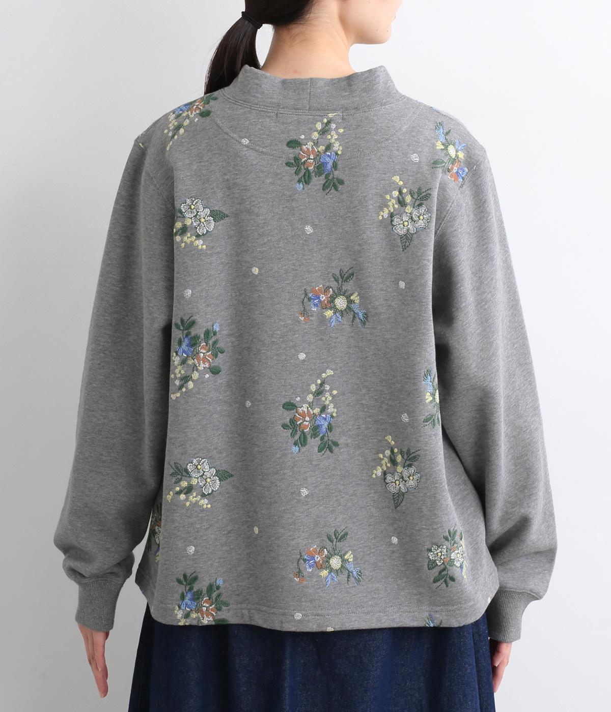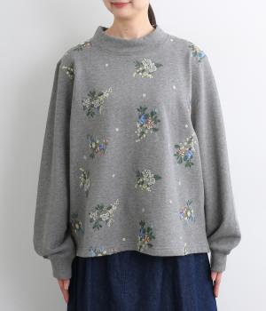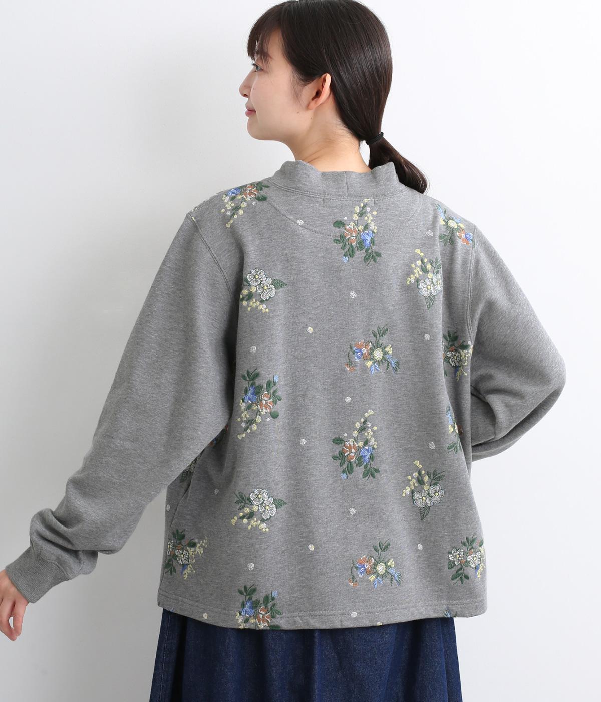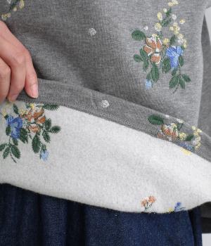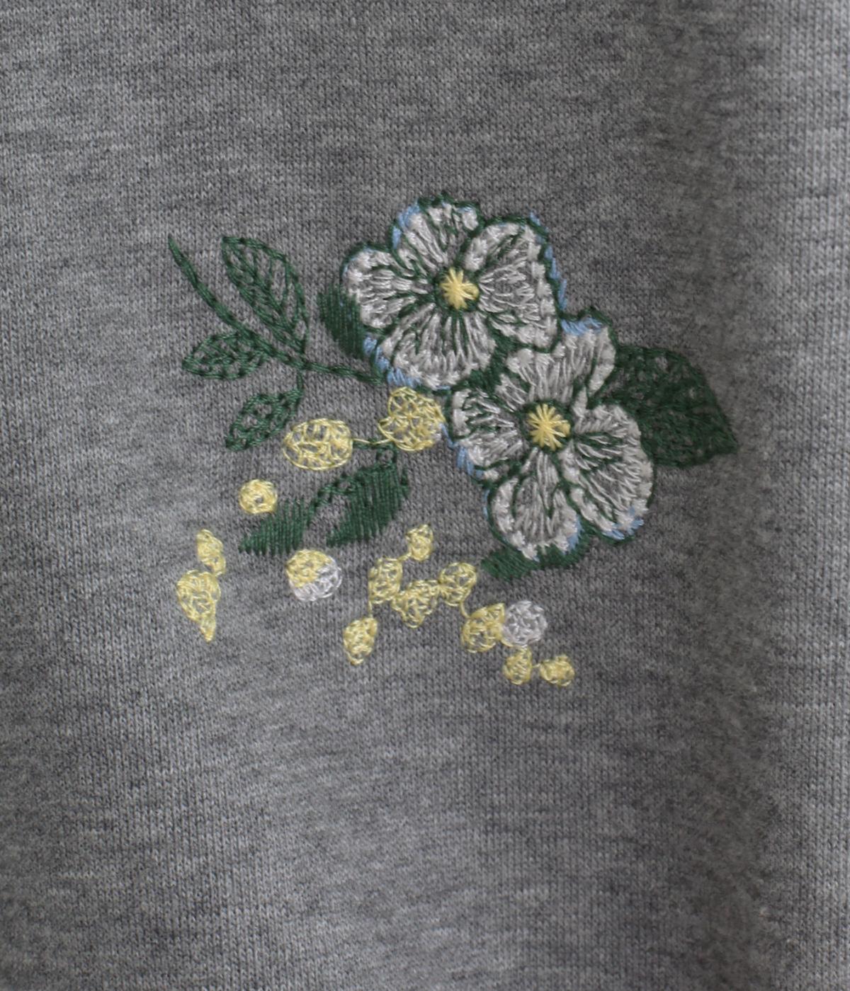 中厚地の40/20裏毛に、小花柄&ドット刺しゅうをほどこしました。カジュアルになりがちなスウェット地を刺しゅうで女性らしく華やかに表現しました。