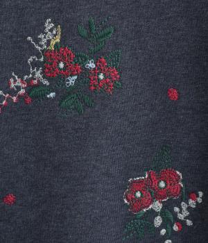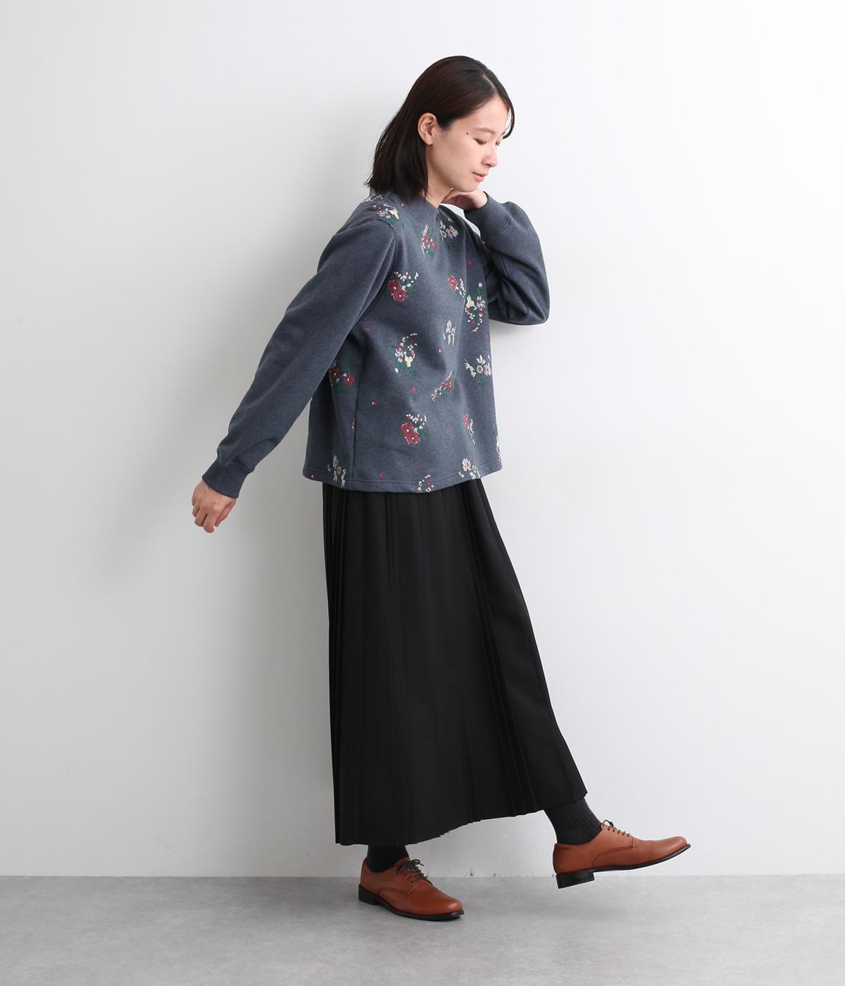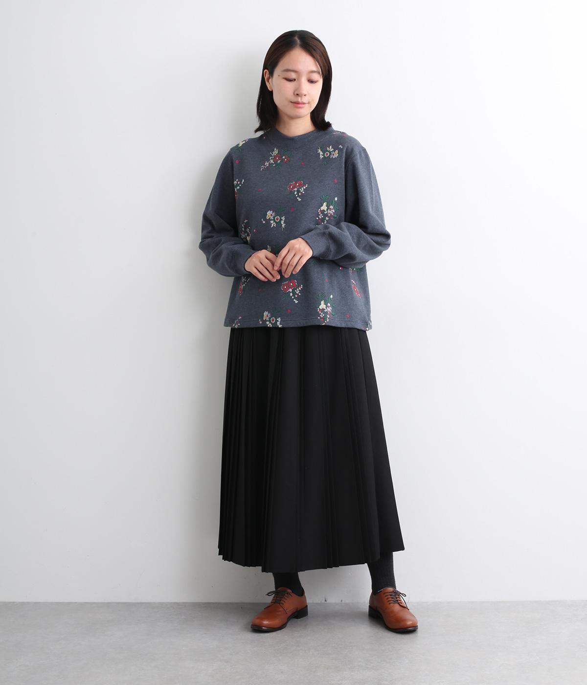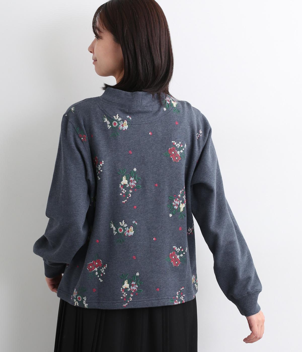 中厚地の40/20裏毛に、小花柄&ドット刺しゅうをほどこしました。カジュアルになりがちなスウェット地を刺しゅうで女性らしく華やかに表現しました。