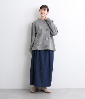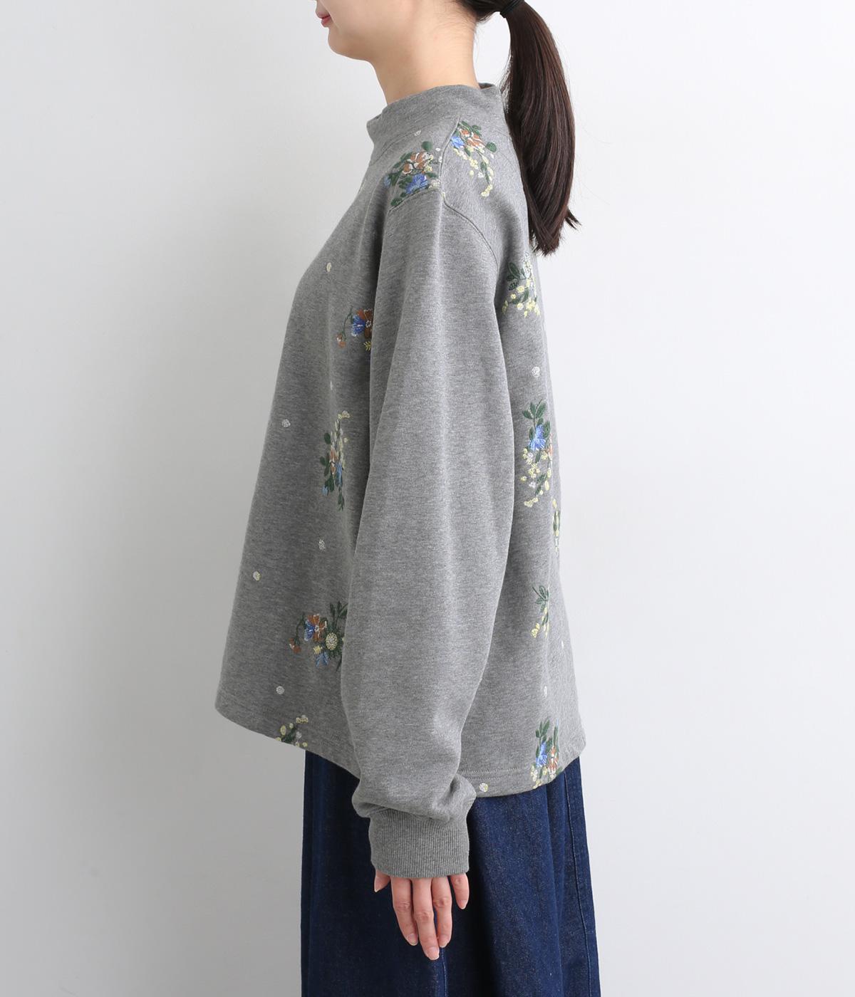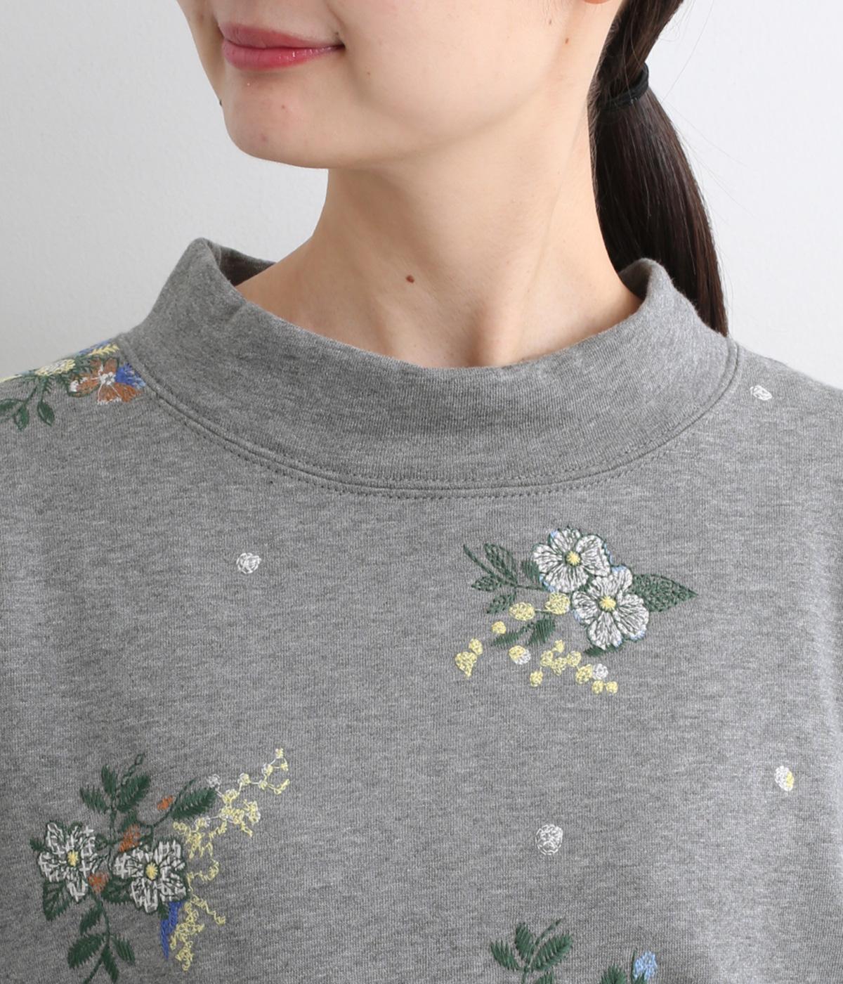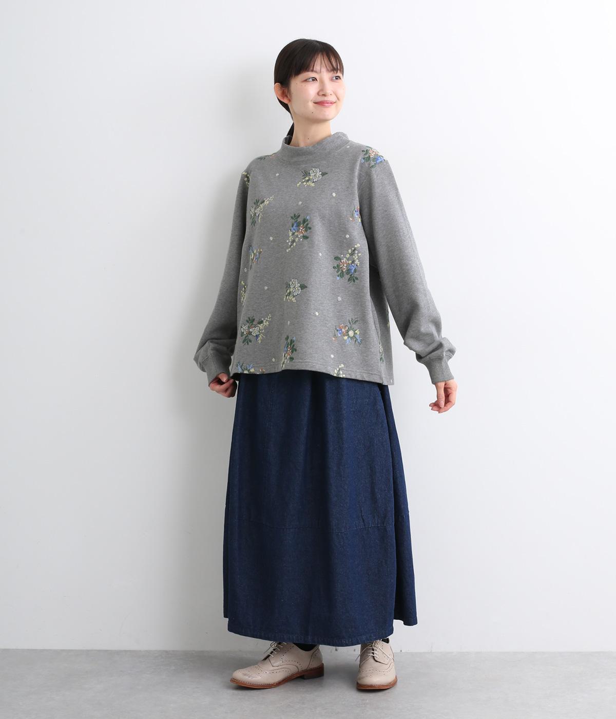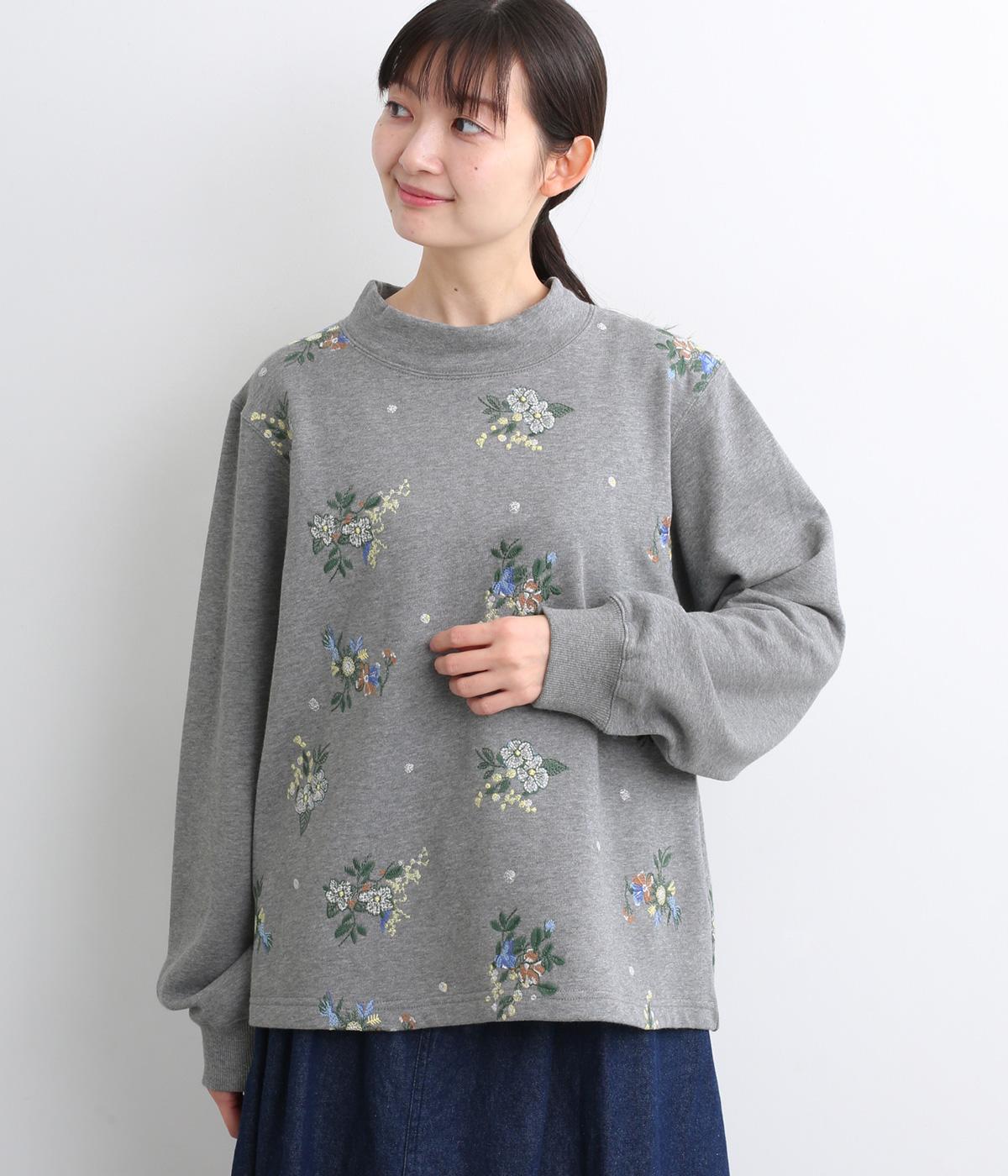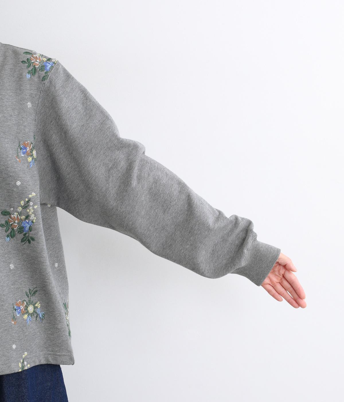 ドットと小花柄の刺しゅうが目を引く、クラフト感あふれるスウェットプルオーバーです。やや高めのネックライン、ぽわっと膨らむ袖で品のあるムードをプラス。裾はあえてリブを入れず、リラクシーなシルエットにしました。