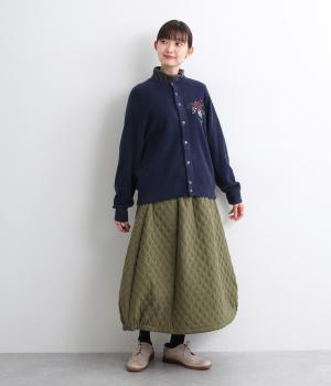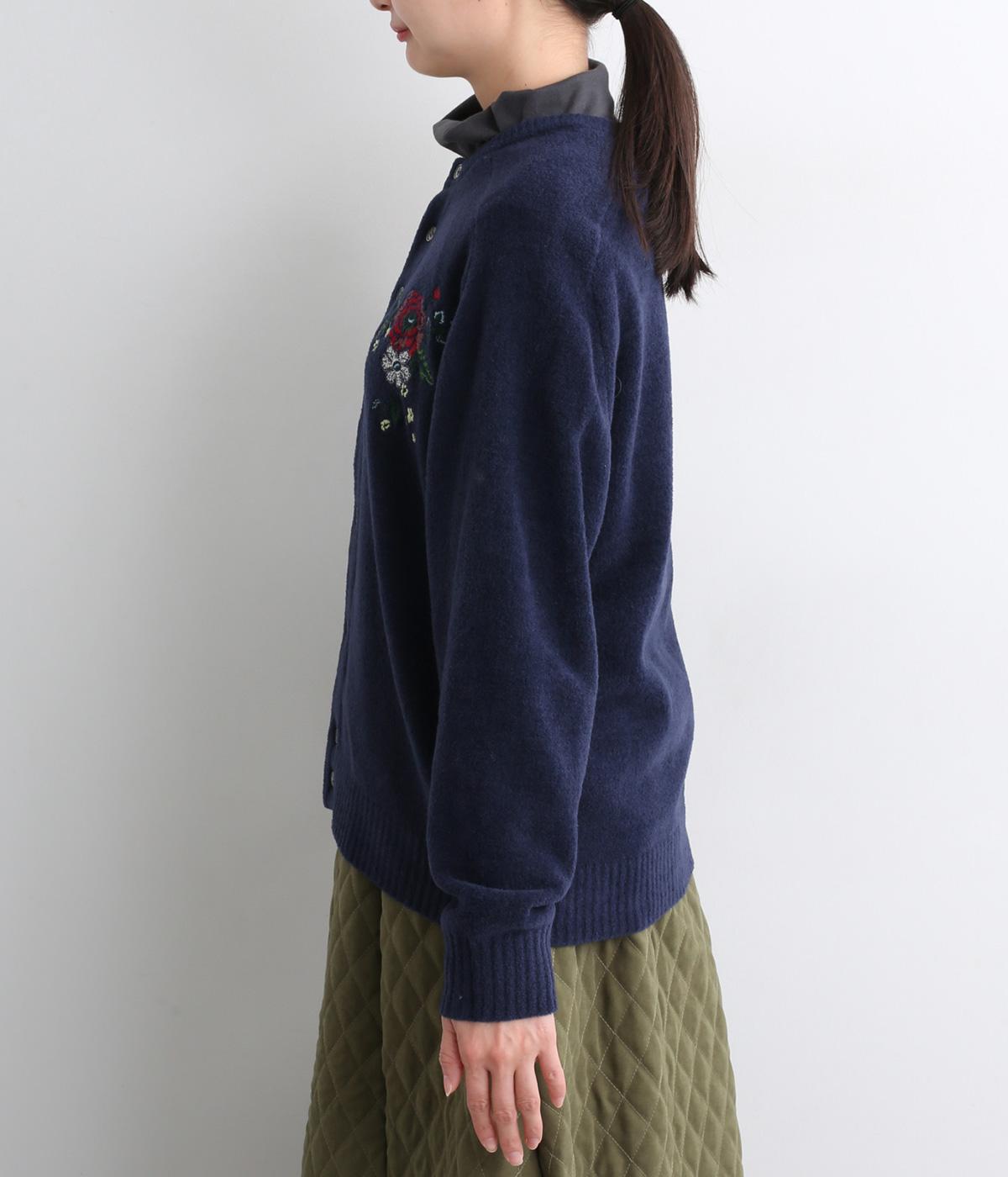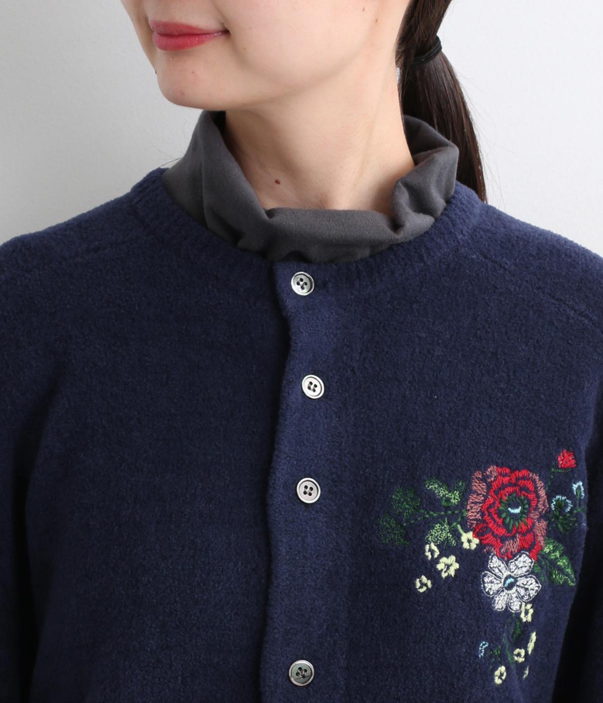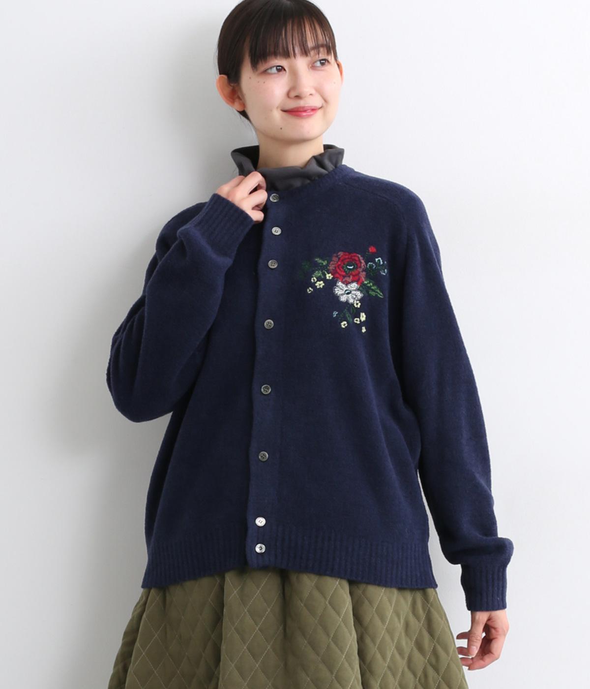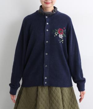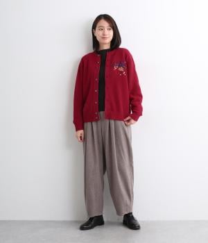 ベーシックなシルエットのカーディガンに、ヒメツバキと小花の刺しゅうをほどこしオリジナリティをプラス。適度にゆとりのある形で、前が開くのでさまざまなレイヤードを楽しめます。