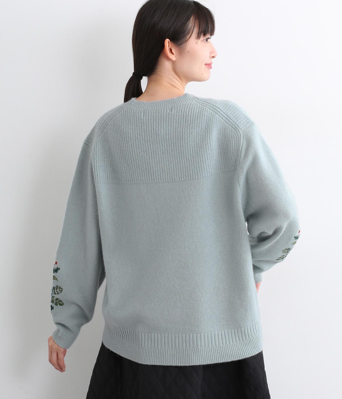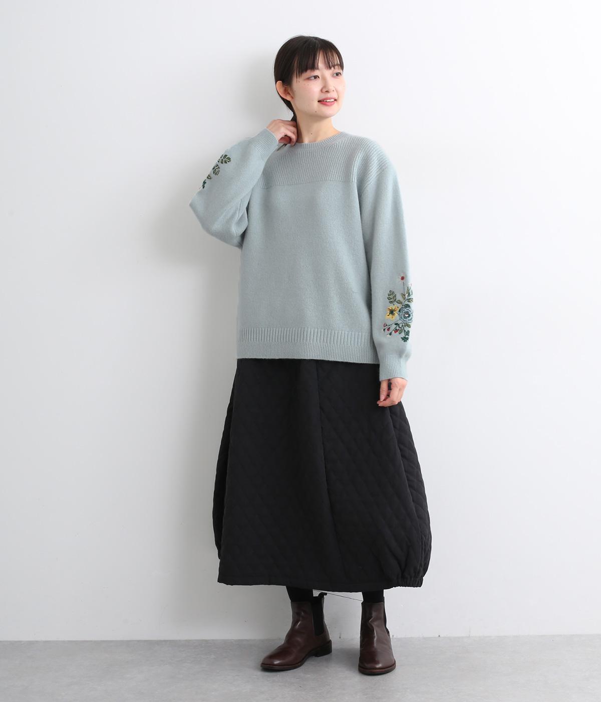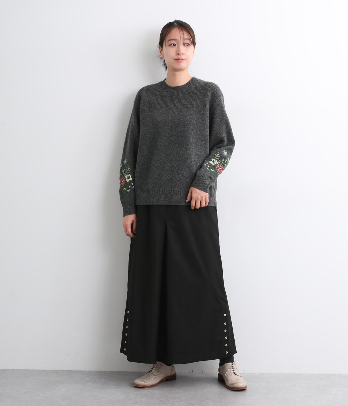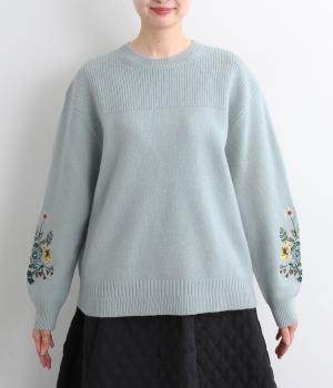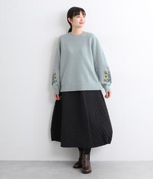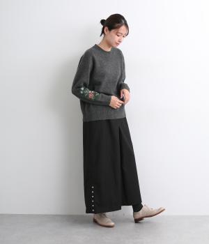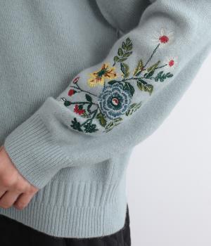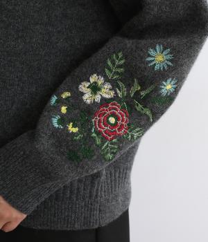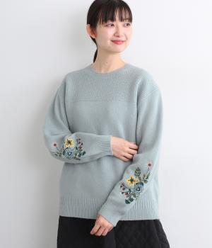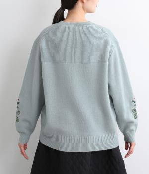 両袖にヒメツバキと小花を刺しゅうした、目にも楽しいデザインニット。ヨーク切り替えのような畦編みもポイントです。体のラインを拾いにくい絶妙なゆとりと、ほどよい丈感で幅広いボトムに合わせていただけます。