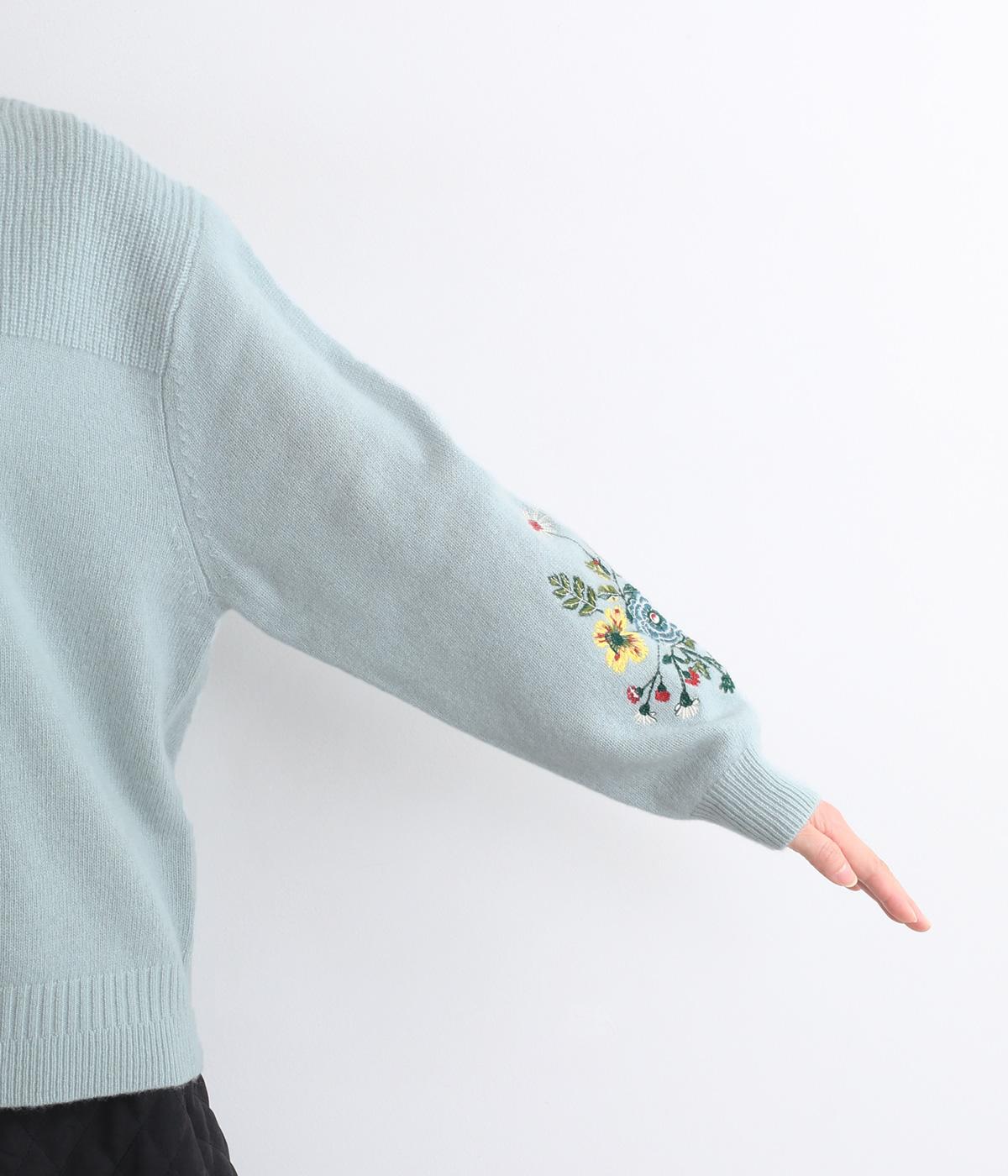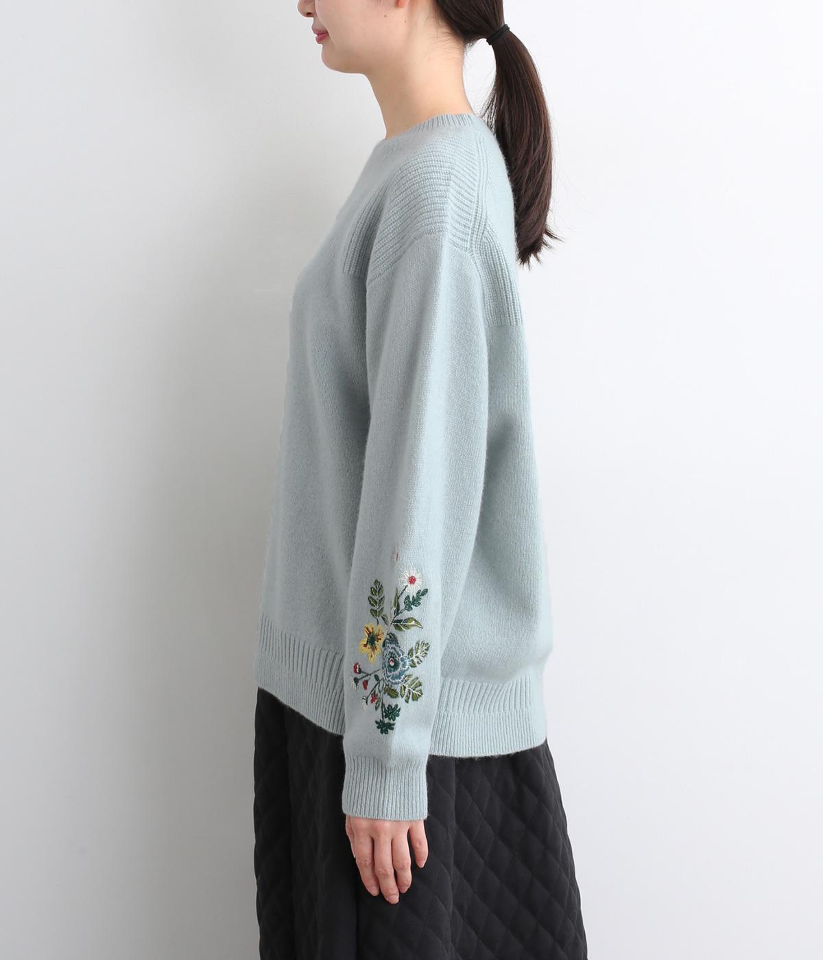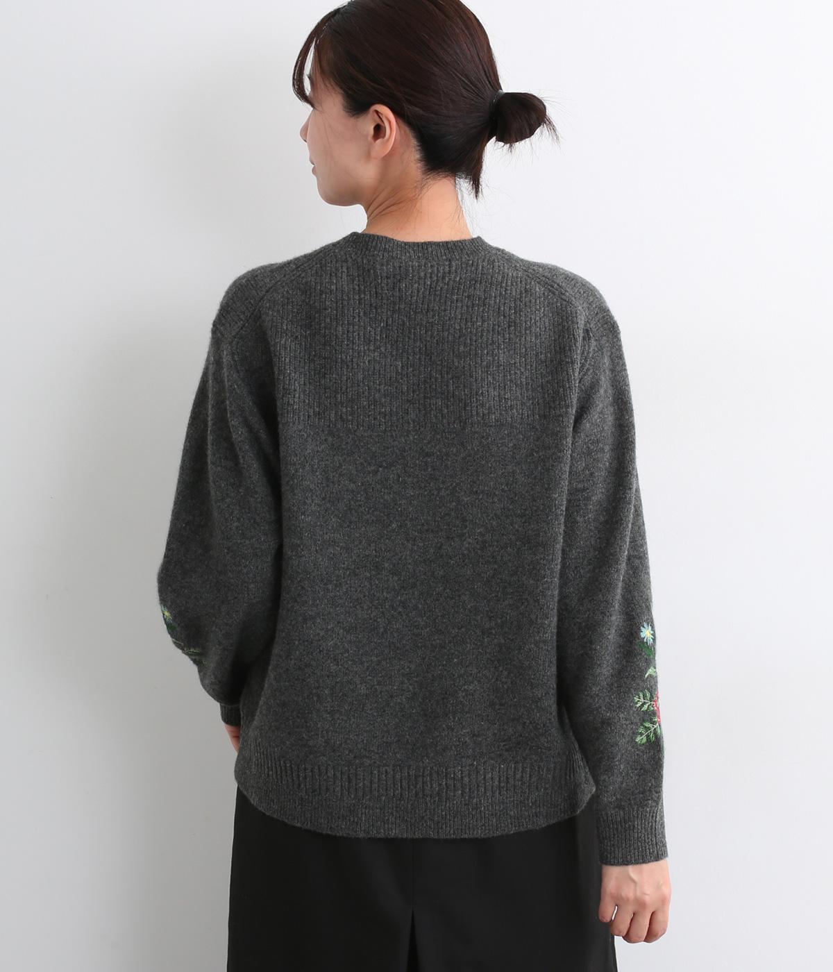 両袖にヒメツバキと小花を刺しゅうした、目にも楽しいデザインニット。ヨーク切り替えのような畦編みもポイントです。体のラインを拾いにくい絶妙なゆとりと、ほどよい丈感で幅広いボトムに合わせていただけます。