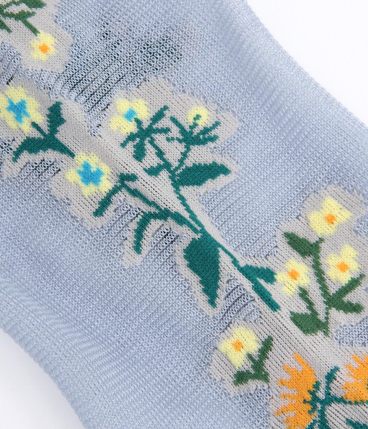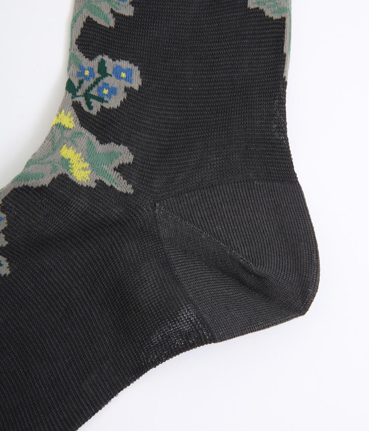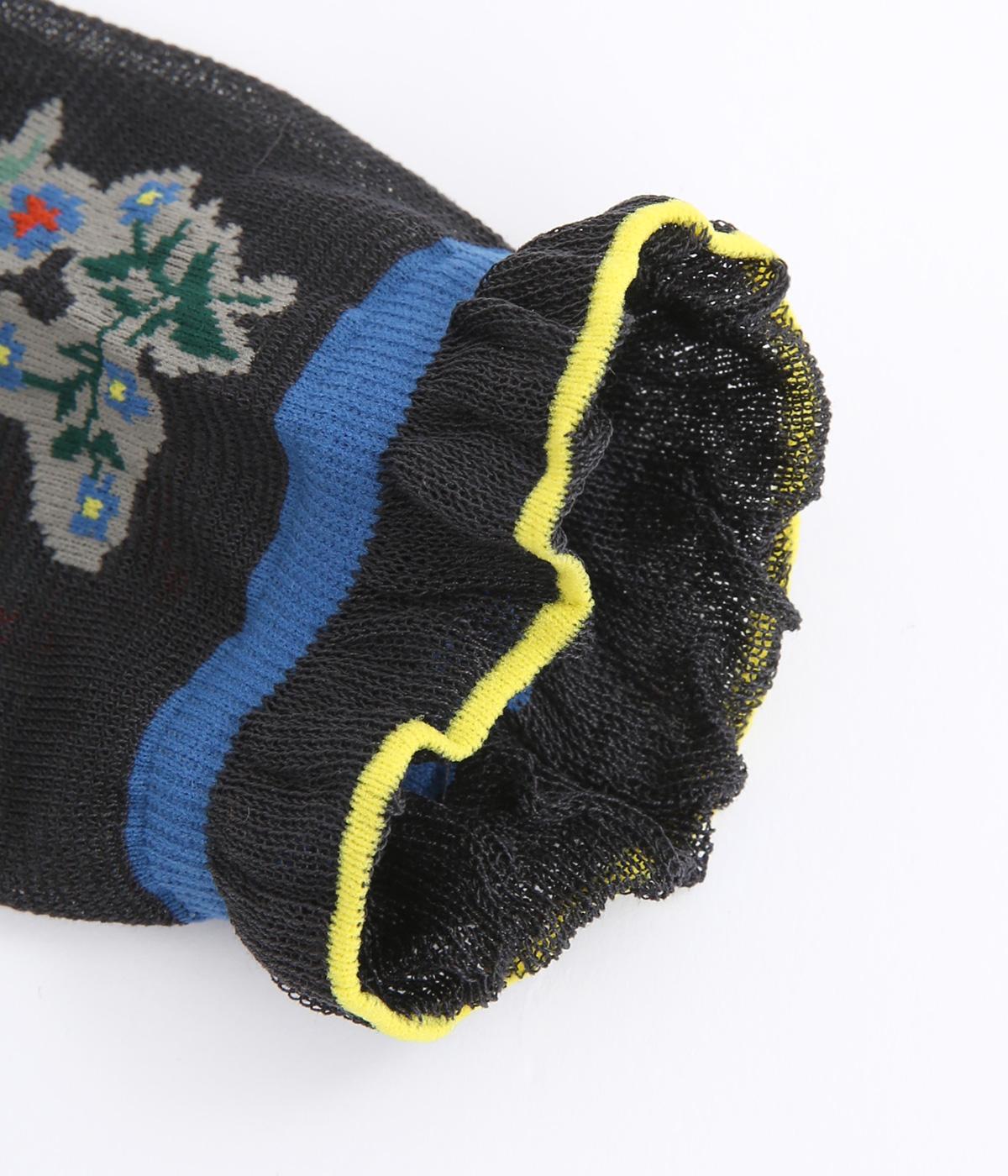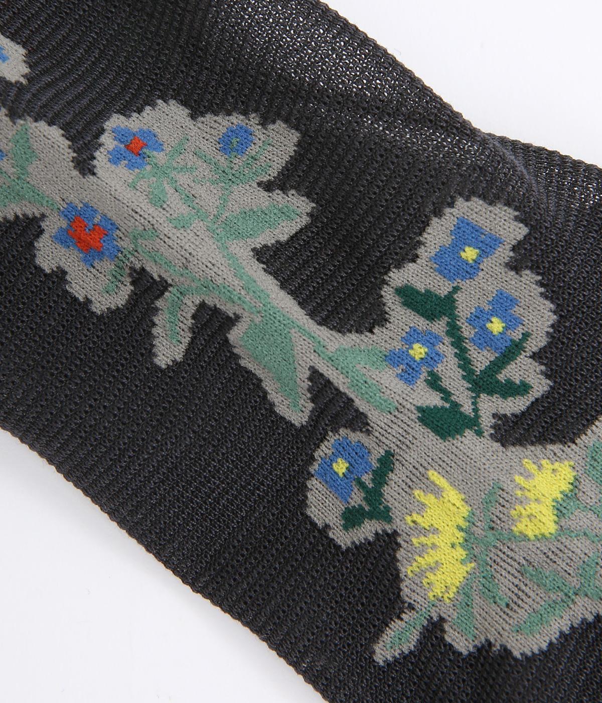 ライン状に並ぶ花々を、フロント部分にジャカードで表現したソックスです。背面にもポイントで柄が入っているので、ローカットのシューズなどに合わせると柄がきれいに見えておすすめです。