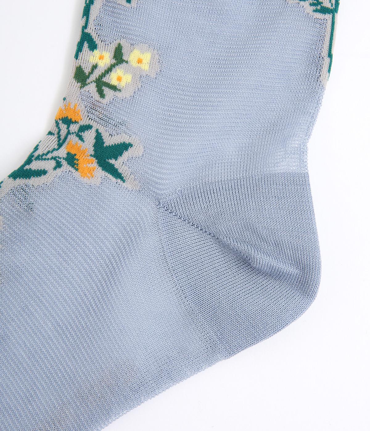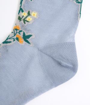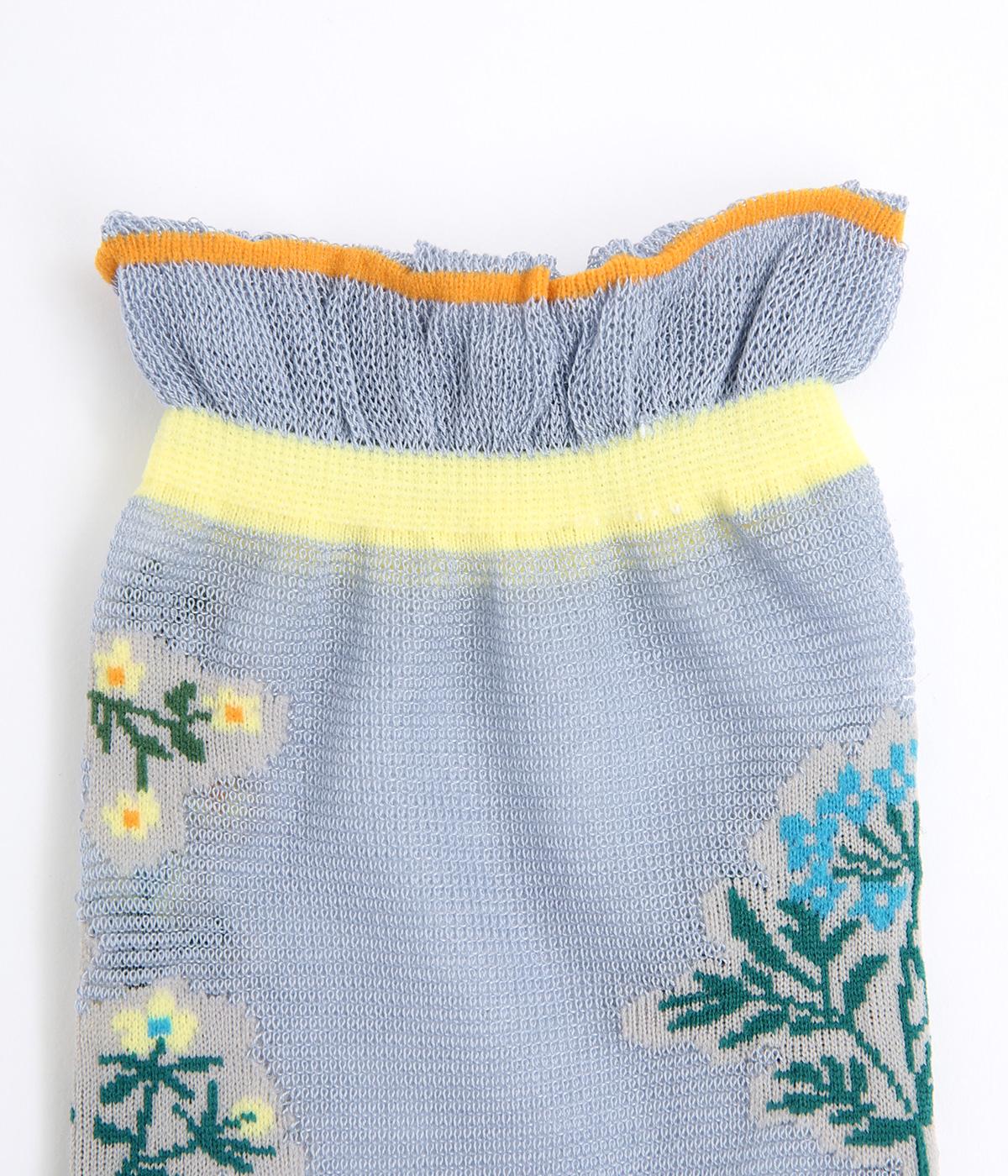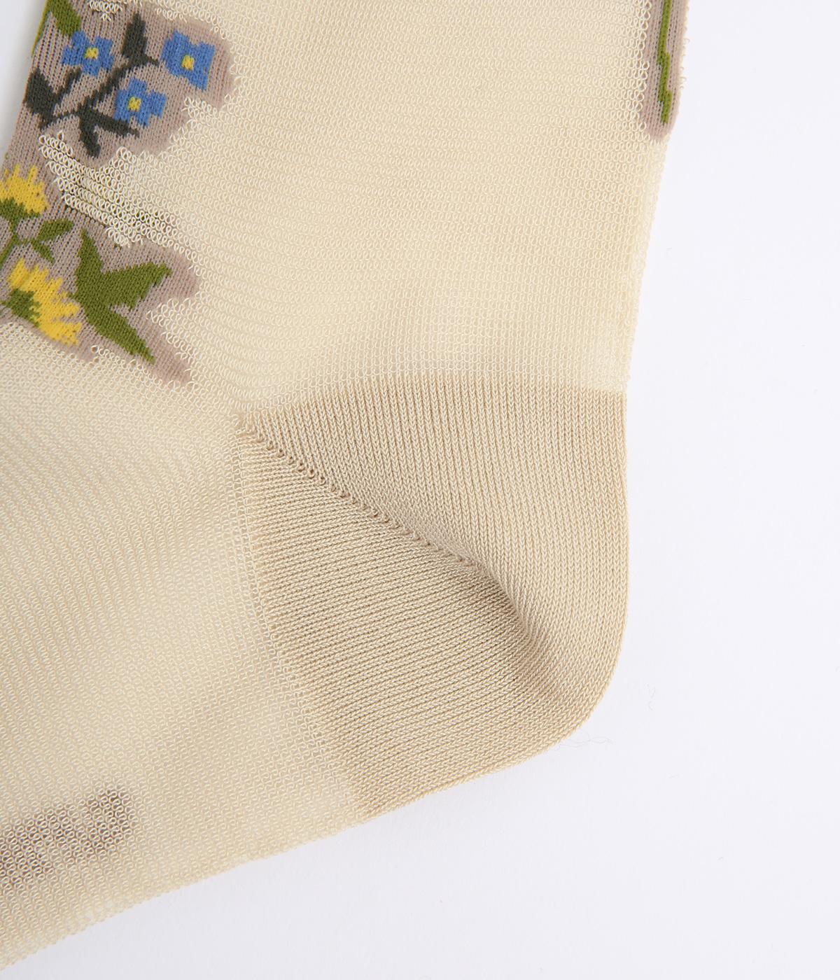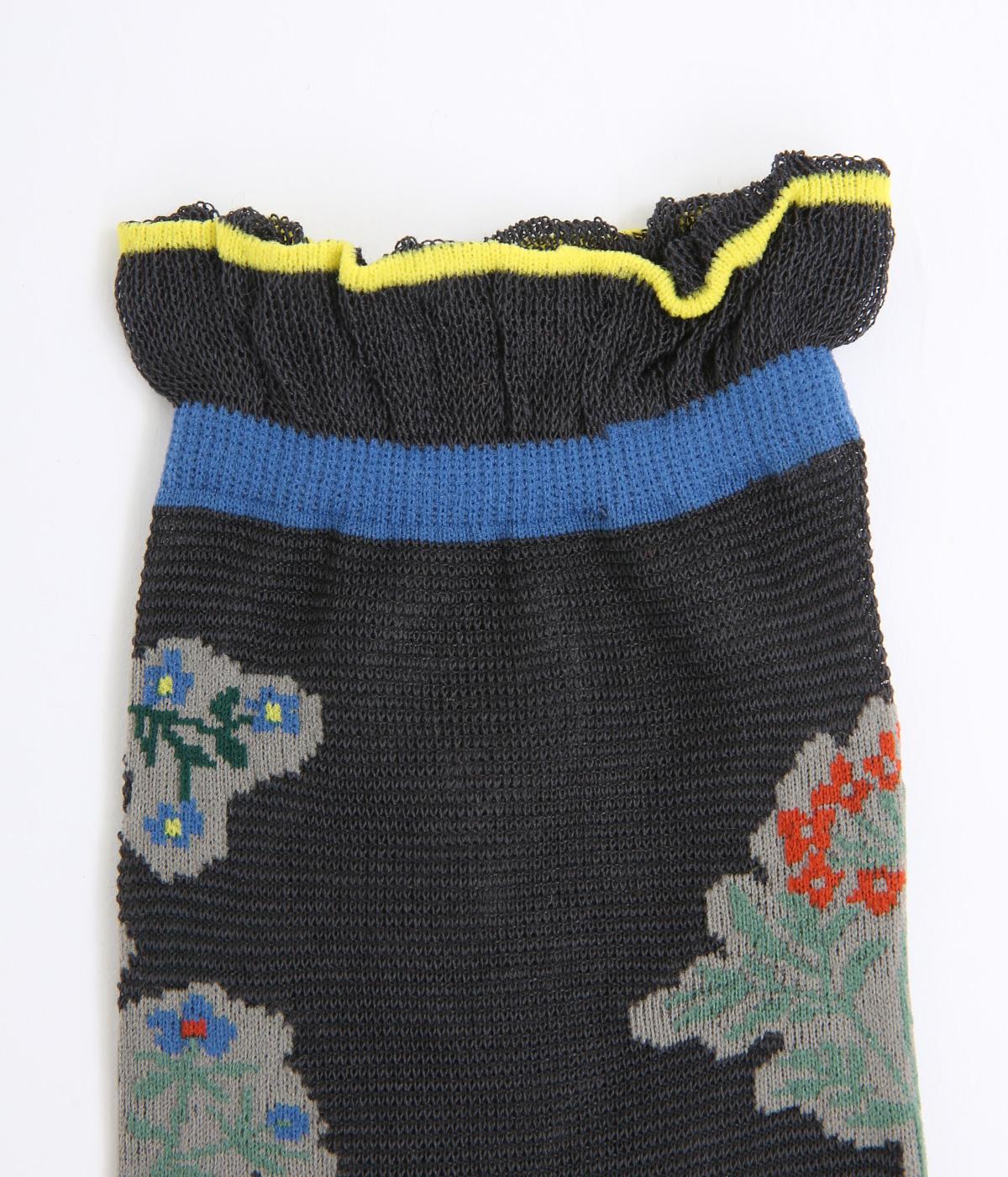 ライン状に並ぶ花々を、フロント部分にジャカードで表現したソックスです。背面にもポイントで柄が入っているので、ローカットのシューズなどに合わせると柄がきれいに見えておすすめです。