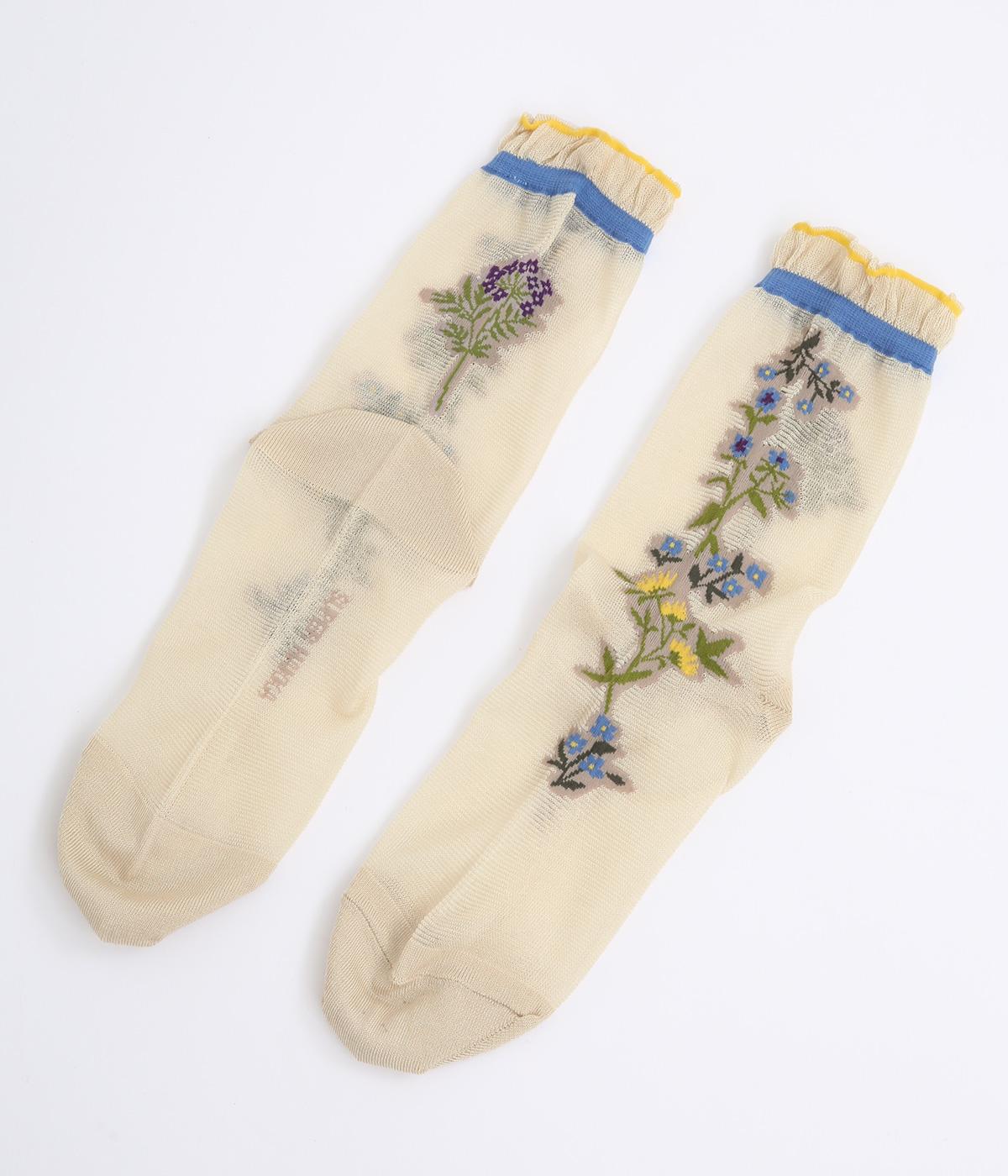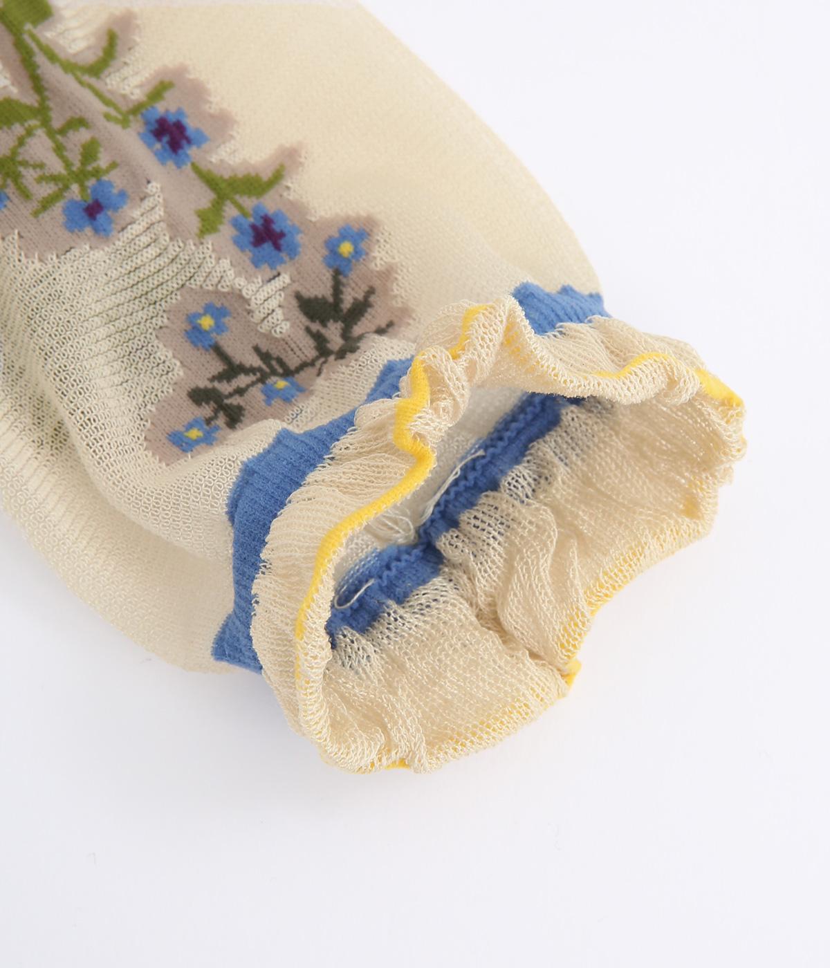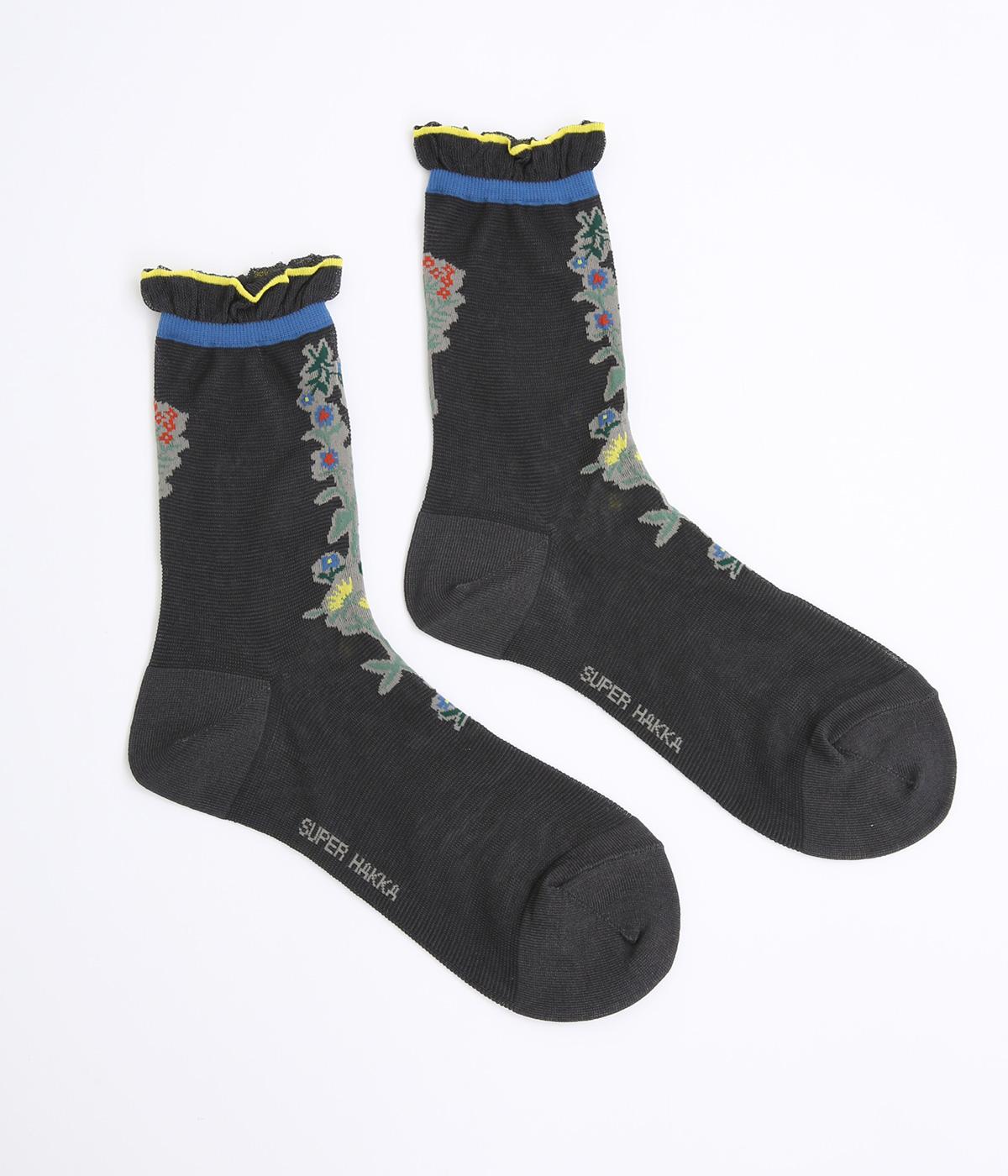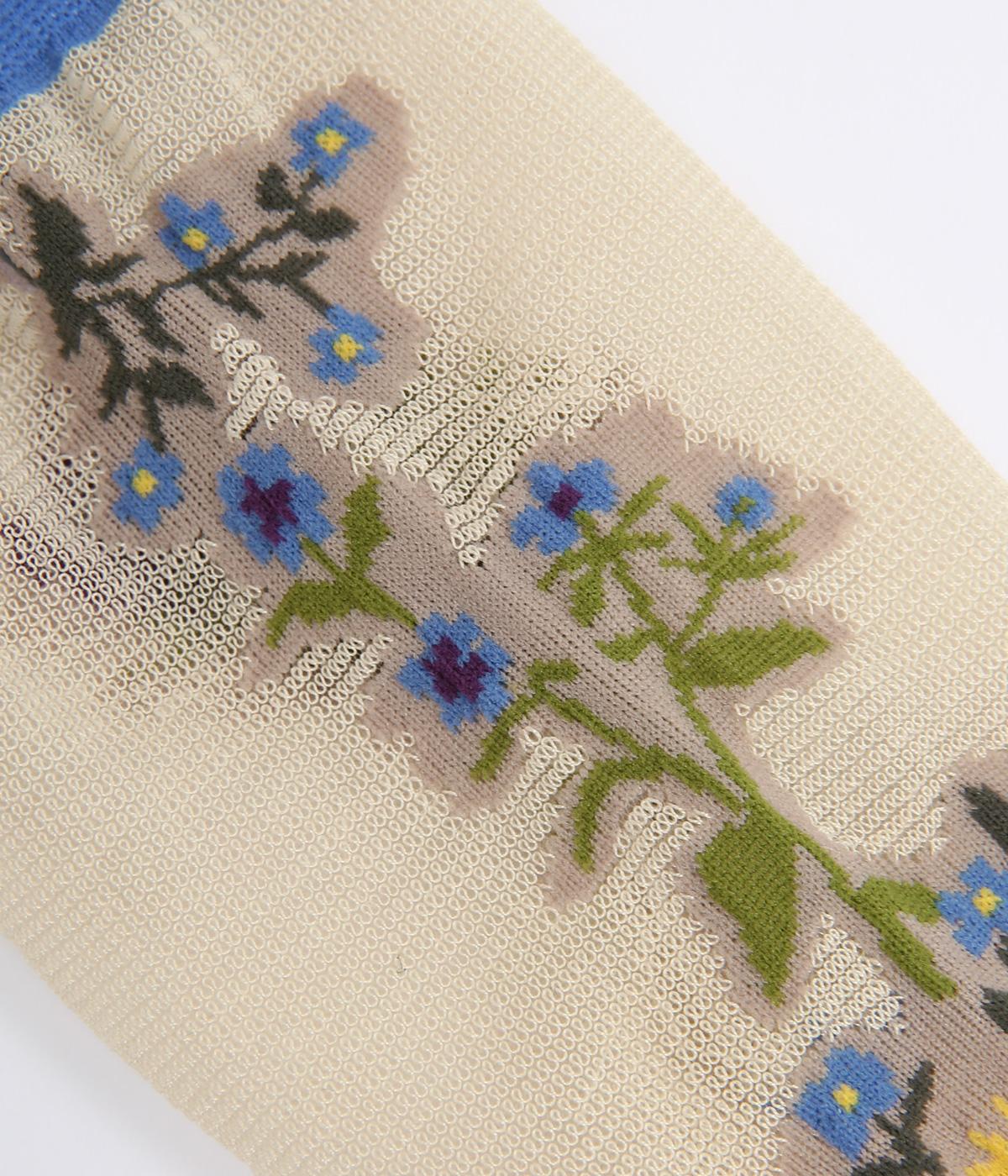 ライン状に並ぶ花々を、フロント部分にジャカードで表現したソックスです。背面にもポイントで柄が入っているので、ローカットのシューズなどに合わせると柄がきれいに見えておすすめです。