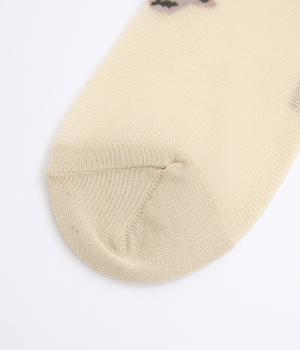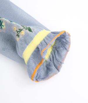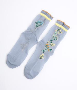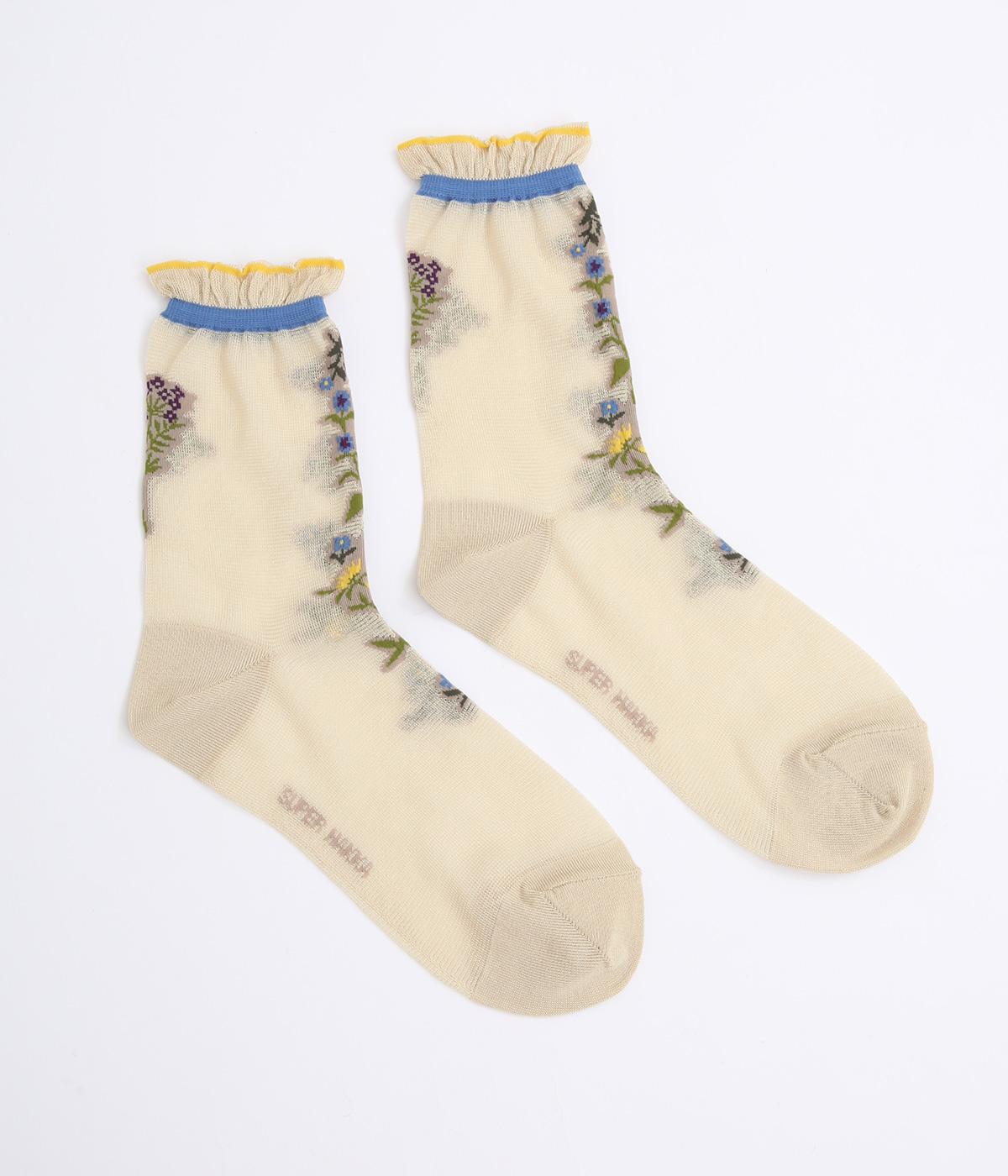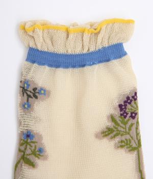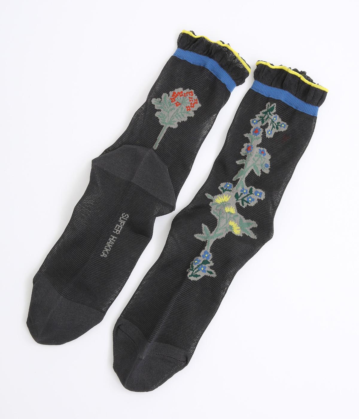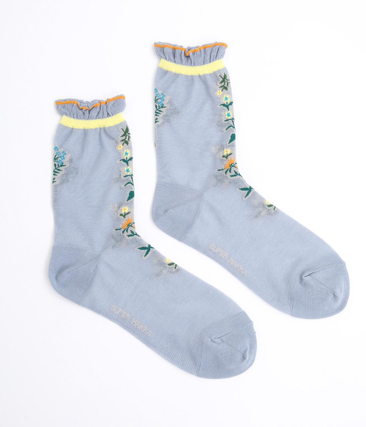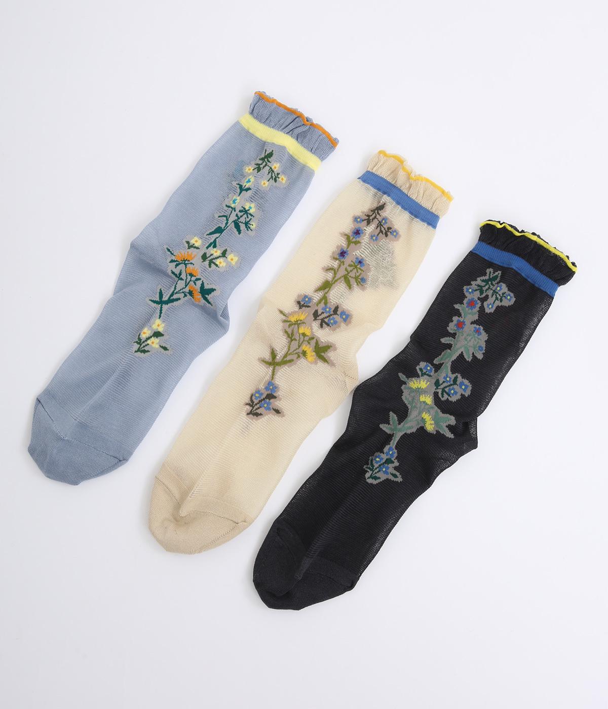 ライン状に並ぶ花々を、フロント部分にジャカードで表現したソックスです。背面にもポイントで柄が入っているので、ローカットのシューズなどに合わせると柄がきれいに見えておすすめです。