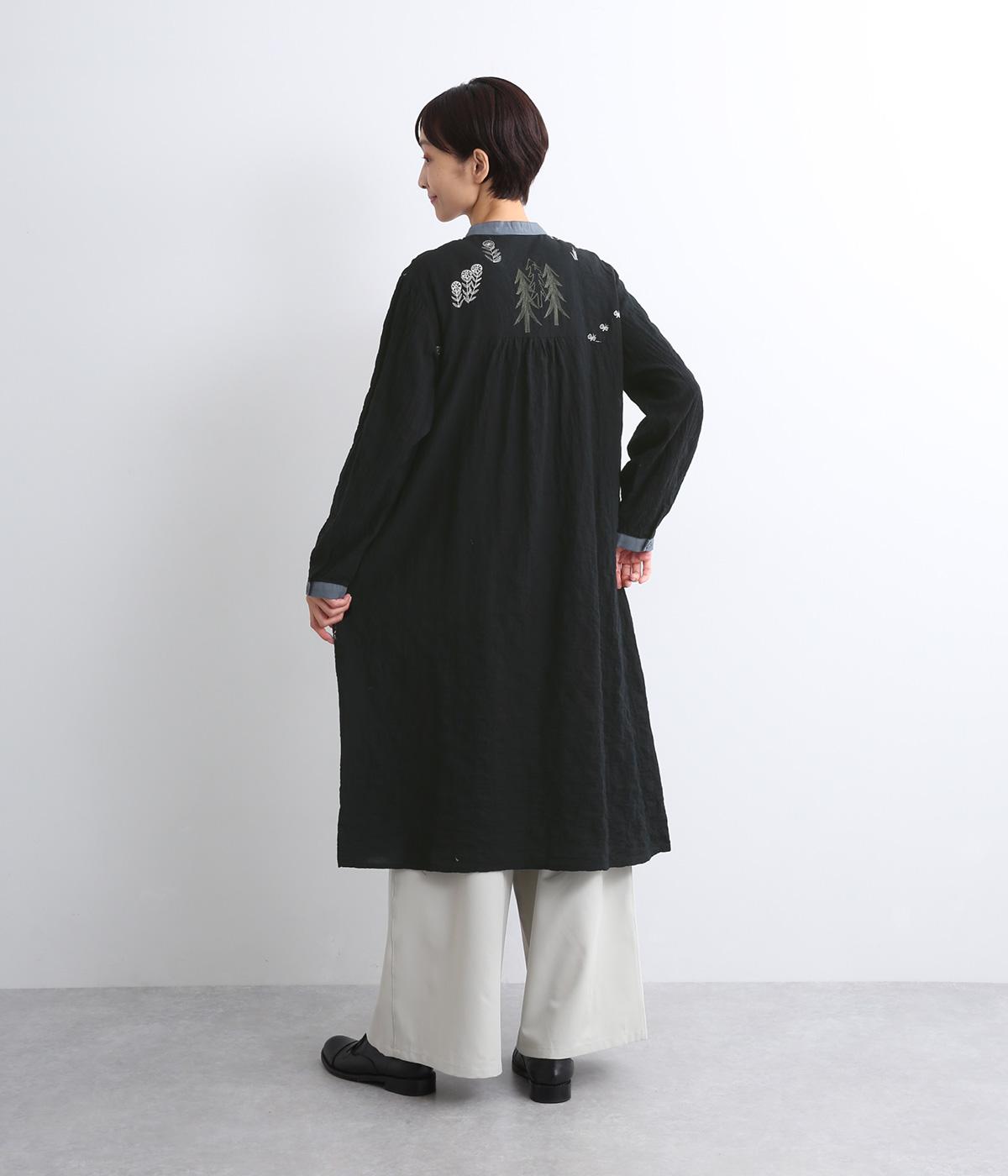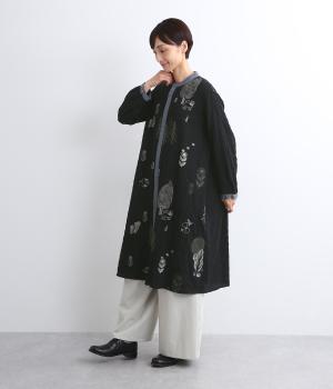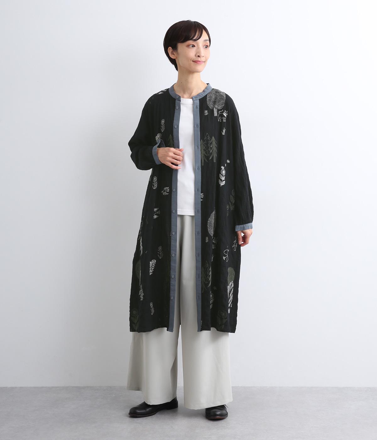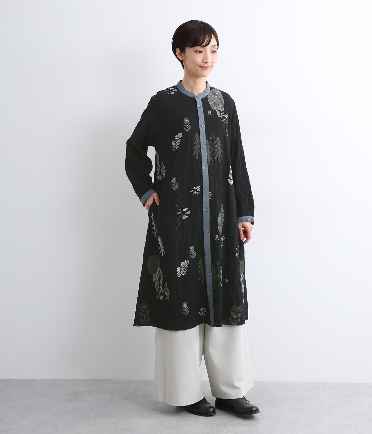 銅版画家、保坂優子さんの描く動物や木々のモチーフをMIXさせ総刺しゅうで表現しました。襟やカフスに別地を使用したクレリック風のデザインに仕上げています。着丈が長いアイテムにあると嬉しいポケットつき。