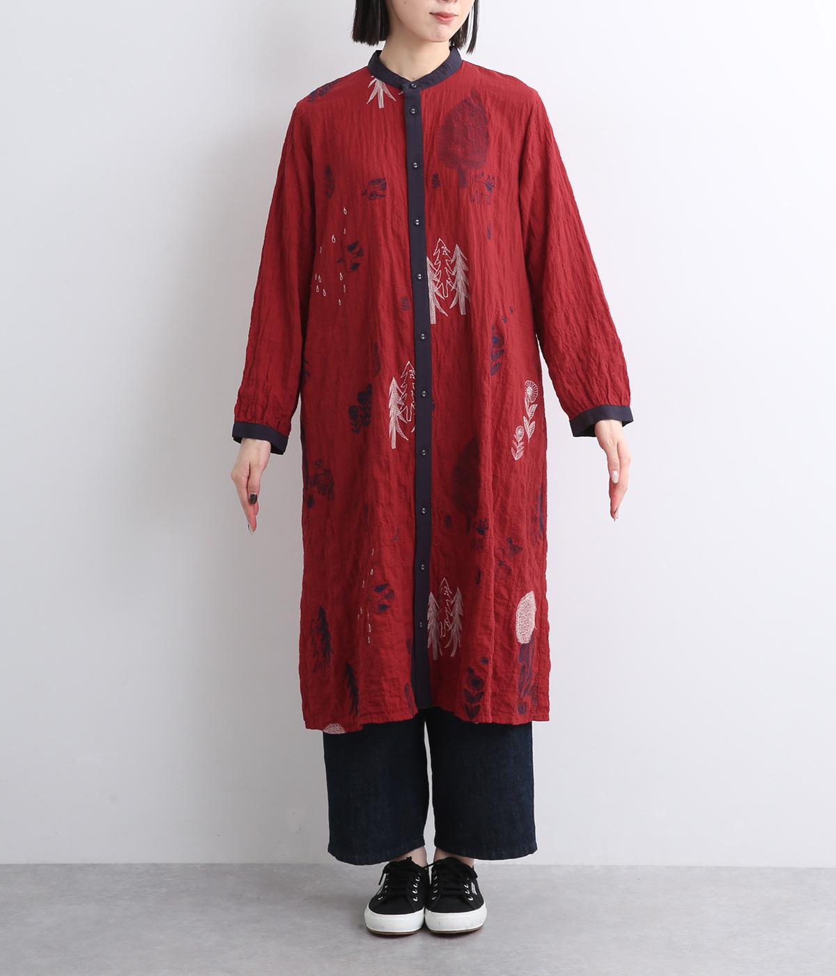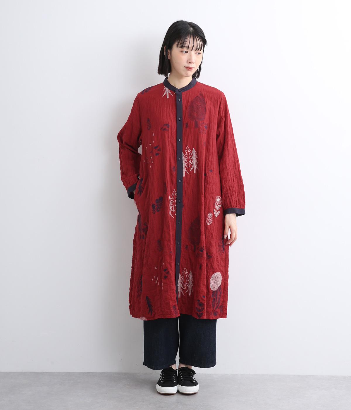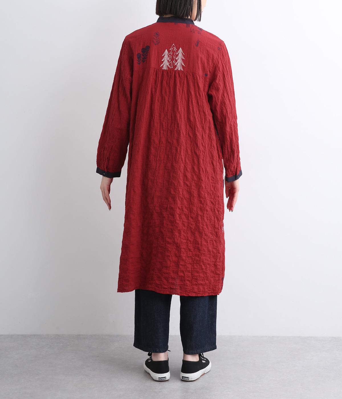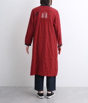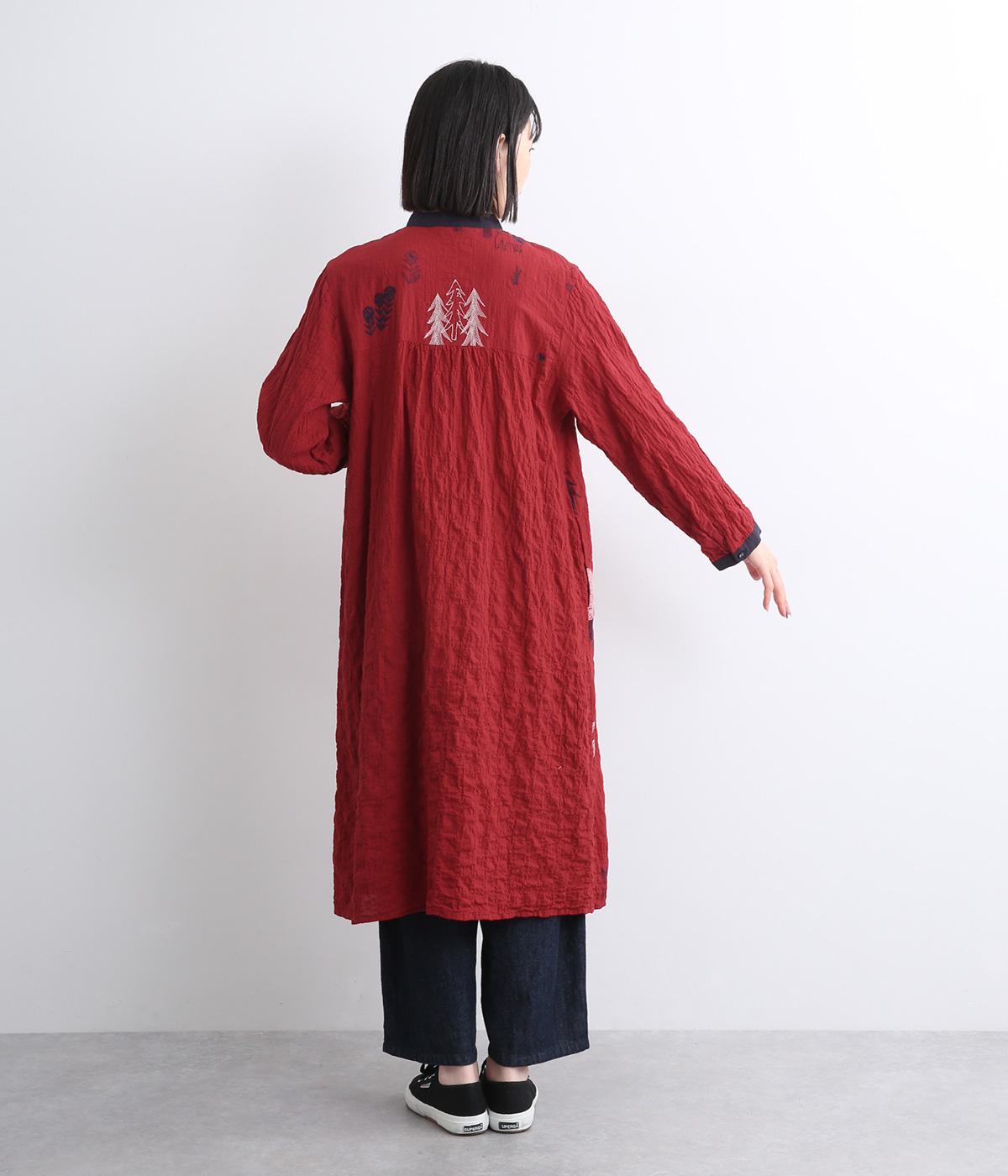 銅版画家、保坂優子さんの描く動物や木々のモチーフをMIXさせ総刺しゅうで表現しました。襟やカフスに別地を使用したクレリック風のデザインに仕上げています。着丈が長いアイテムにあると嬉しいポケットつき。