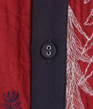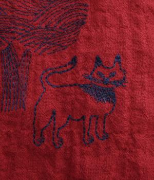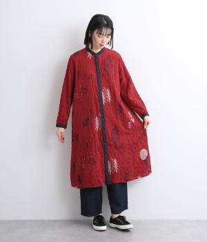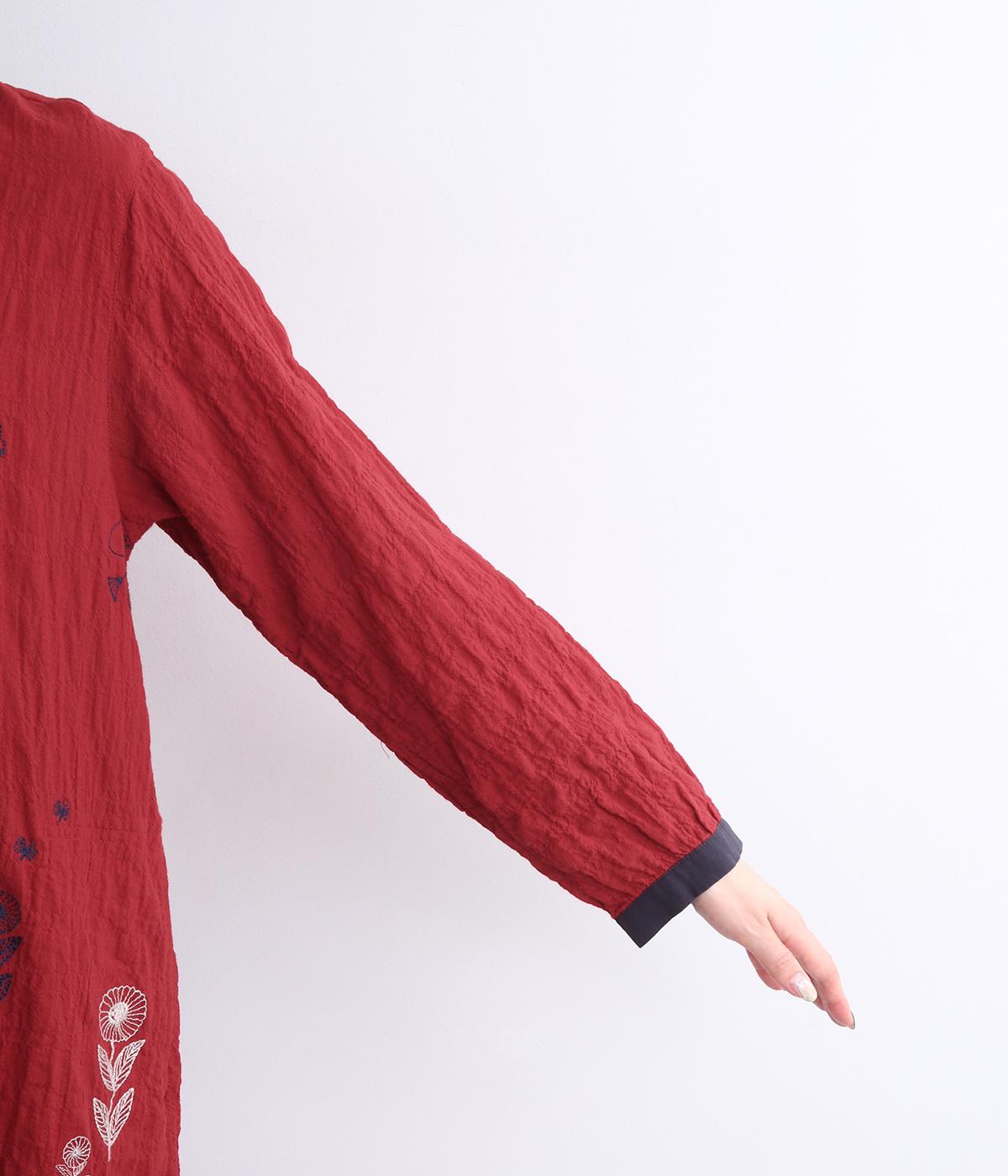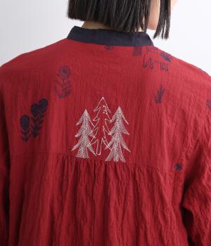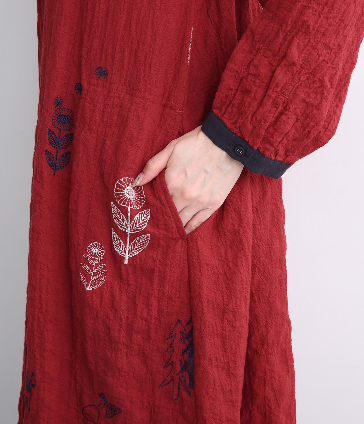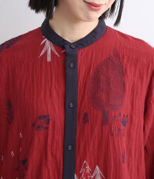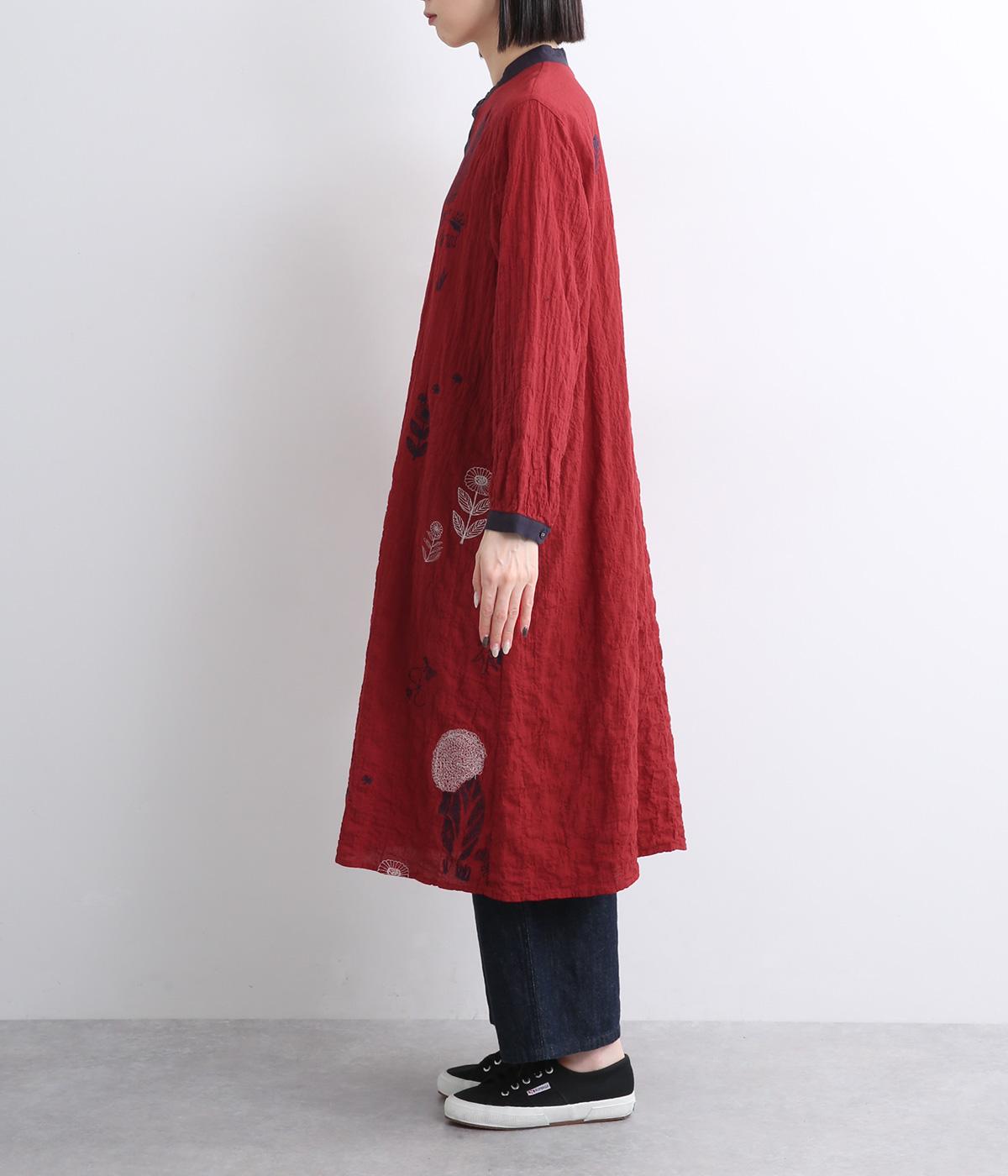 銅版画家、保坂優子さんの描く動物や木々のモチーフをMIXさせ総刺しゅうで表現しました。襟やカフスに別地を使用したクレリック風のデザインに仕上げています。着丈が長いアイテムにあると嬉しいポケットつき。
