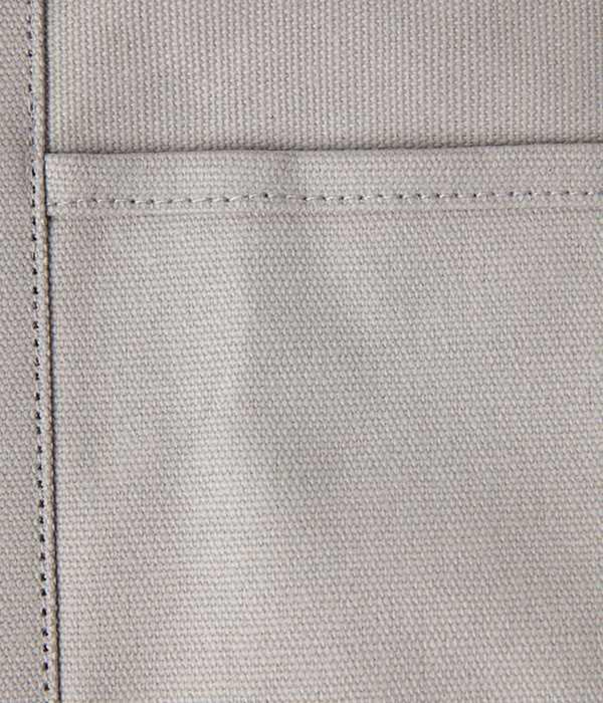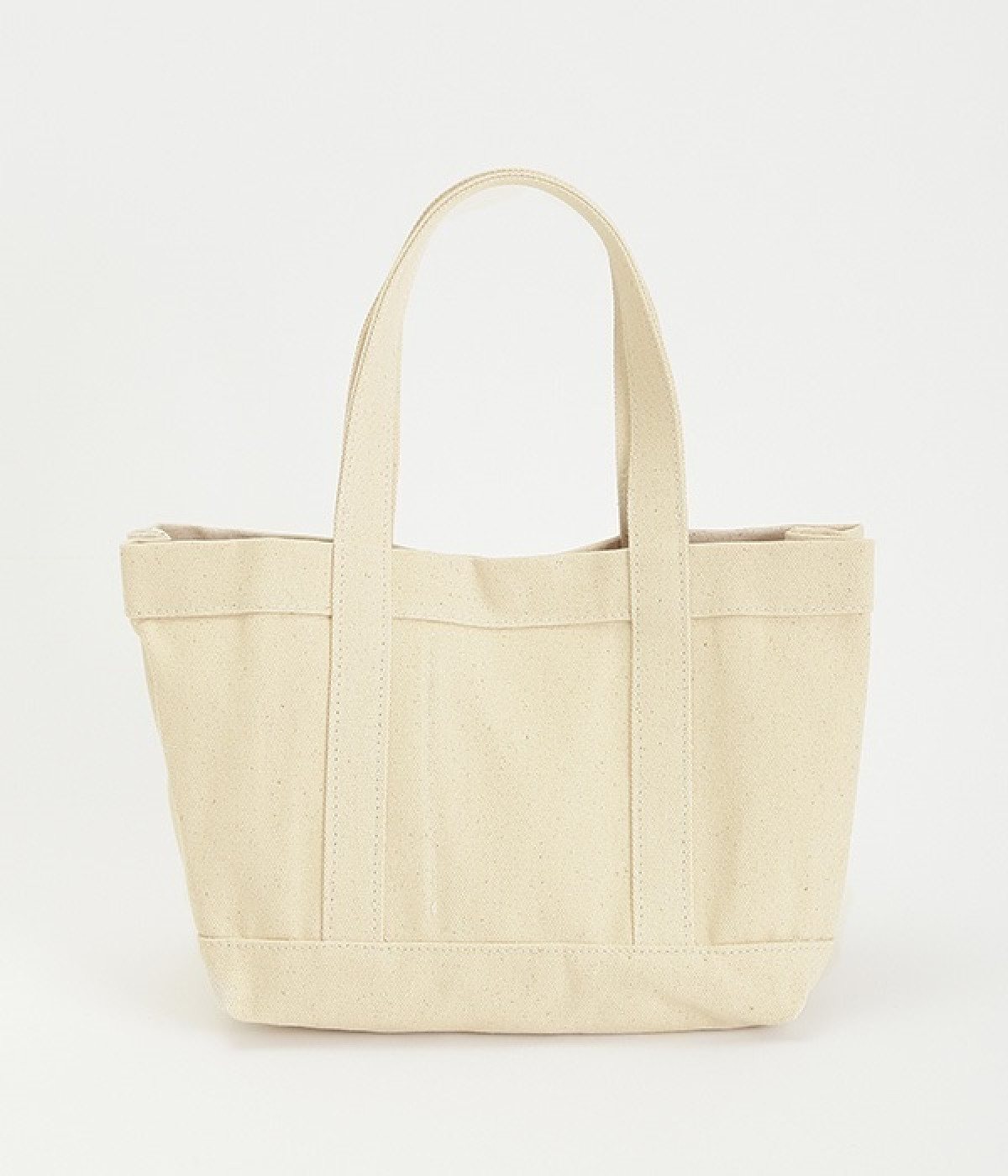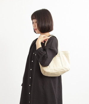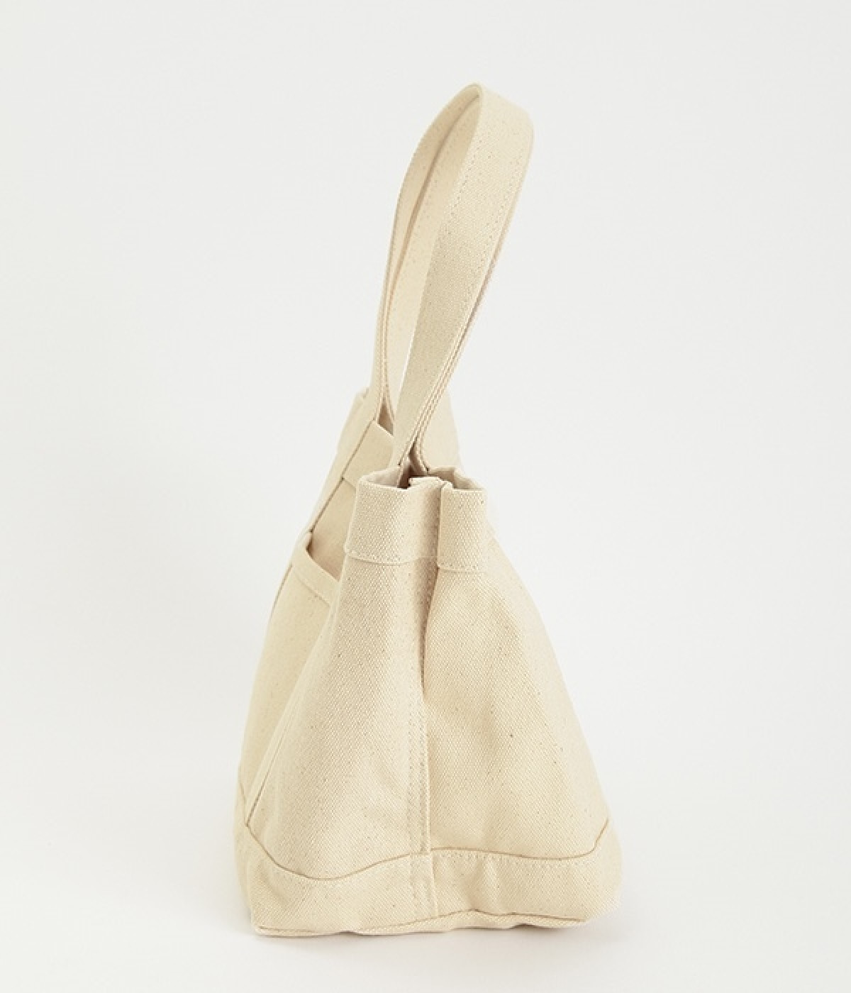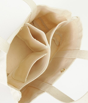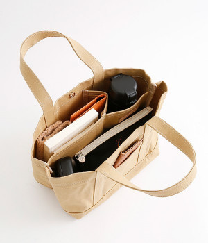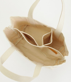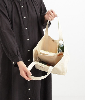 ポケット付きの仕切りでポーチはここ、ペットボトルはここ、お財布はここ、と自分なりに整理して収納できるキャンバス地のトートバッグです。底マチ、サイドマチをたっぷり取ってあるので、見た目以上にしっかり収納できます。開口部はホックで留められるので安心感もあり、持ち手部分は肩掛けも可能な長さで使い勝手も抜群です。