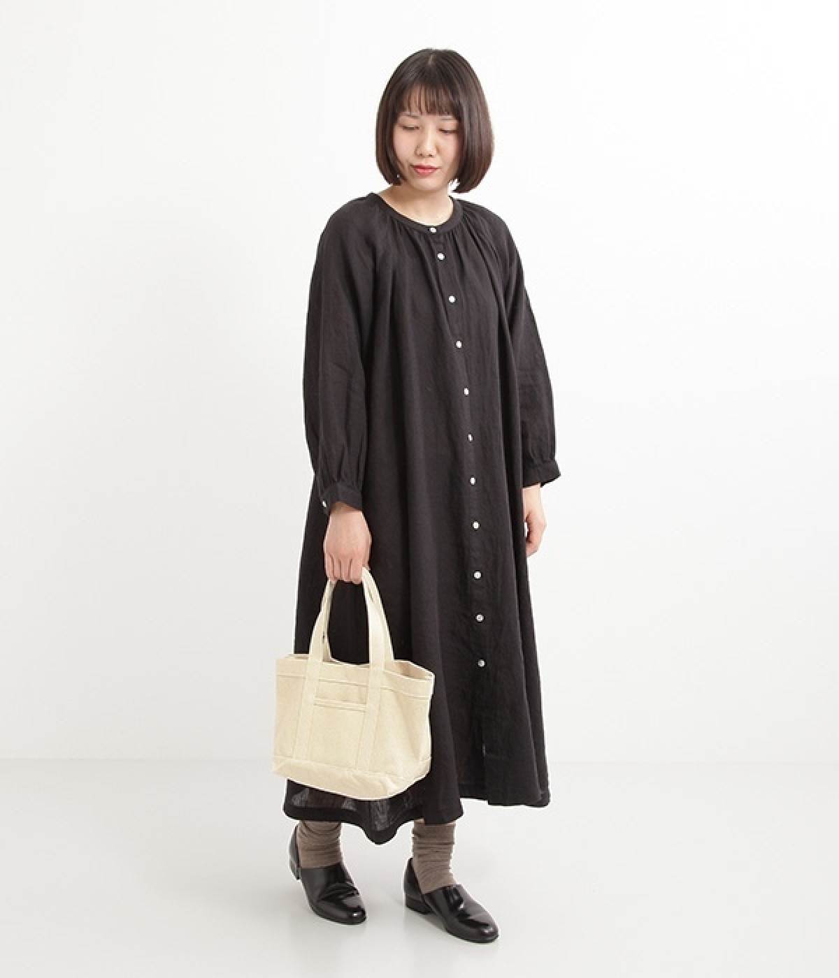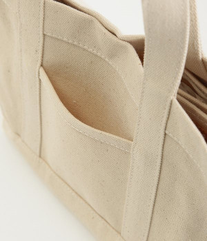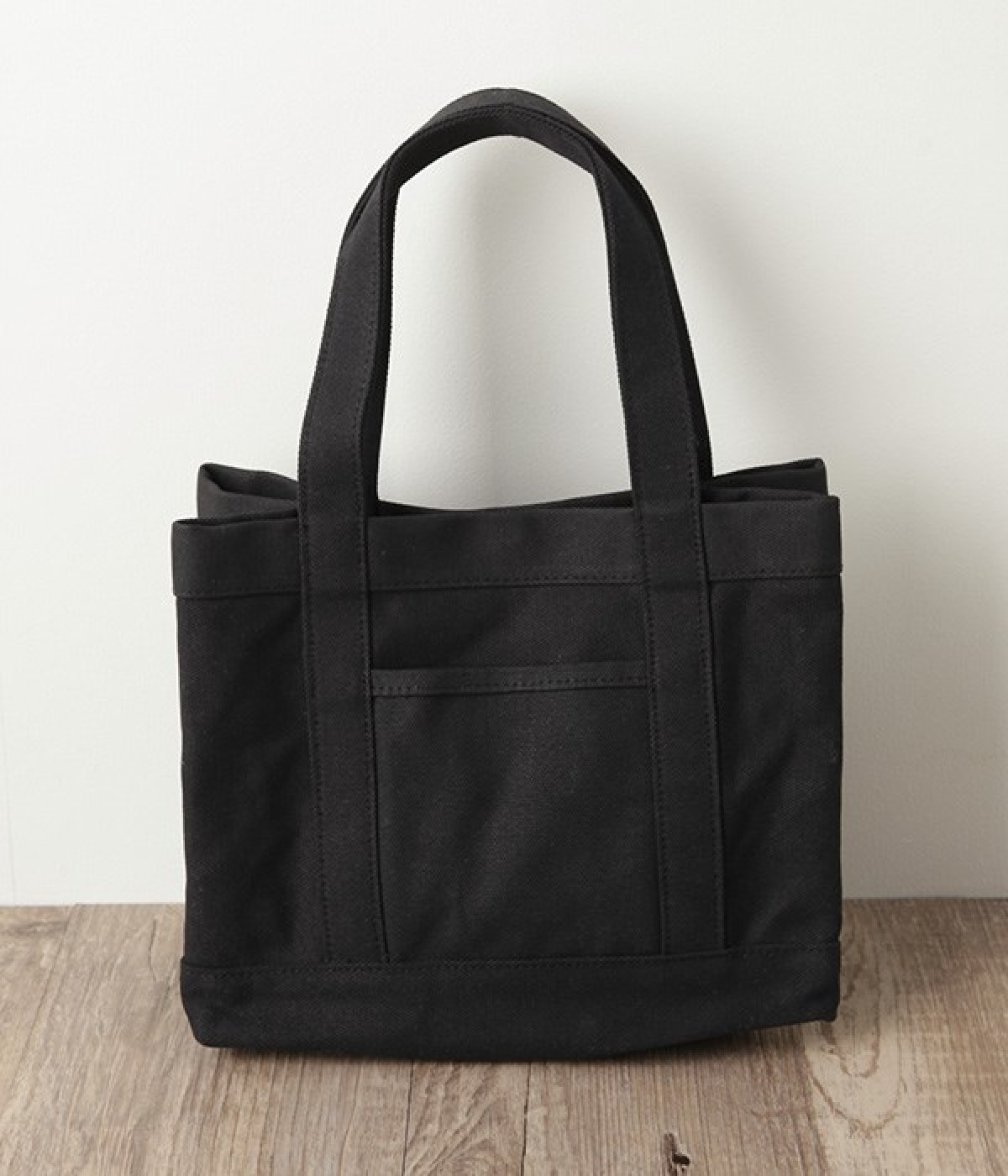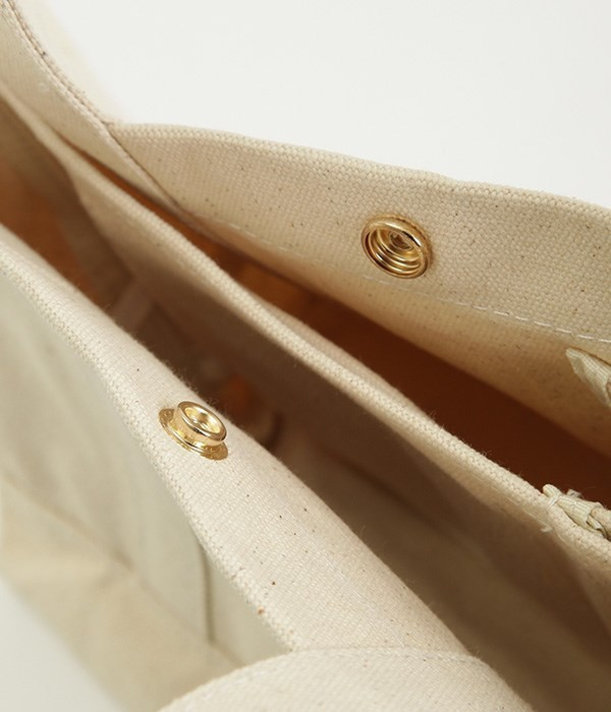 ポケット付きの仕切りでポーチはここ、ペットボトルはここ、お財布はここ、と自分なりに整理して収納できるキャンバス地のトートバッグです。底マチ、サイドマチをたっぷり取ってあるので、見た目以上にしっかり収納できます。開口部はホックで留められるので安心感もあり、持ち手部分は肩掛けも可能な長さで使い勝手も抜群です。