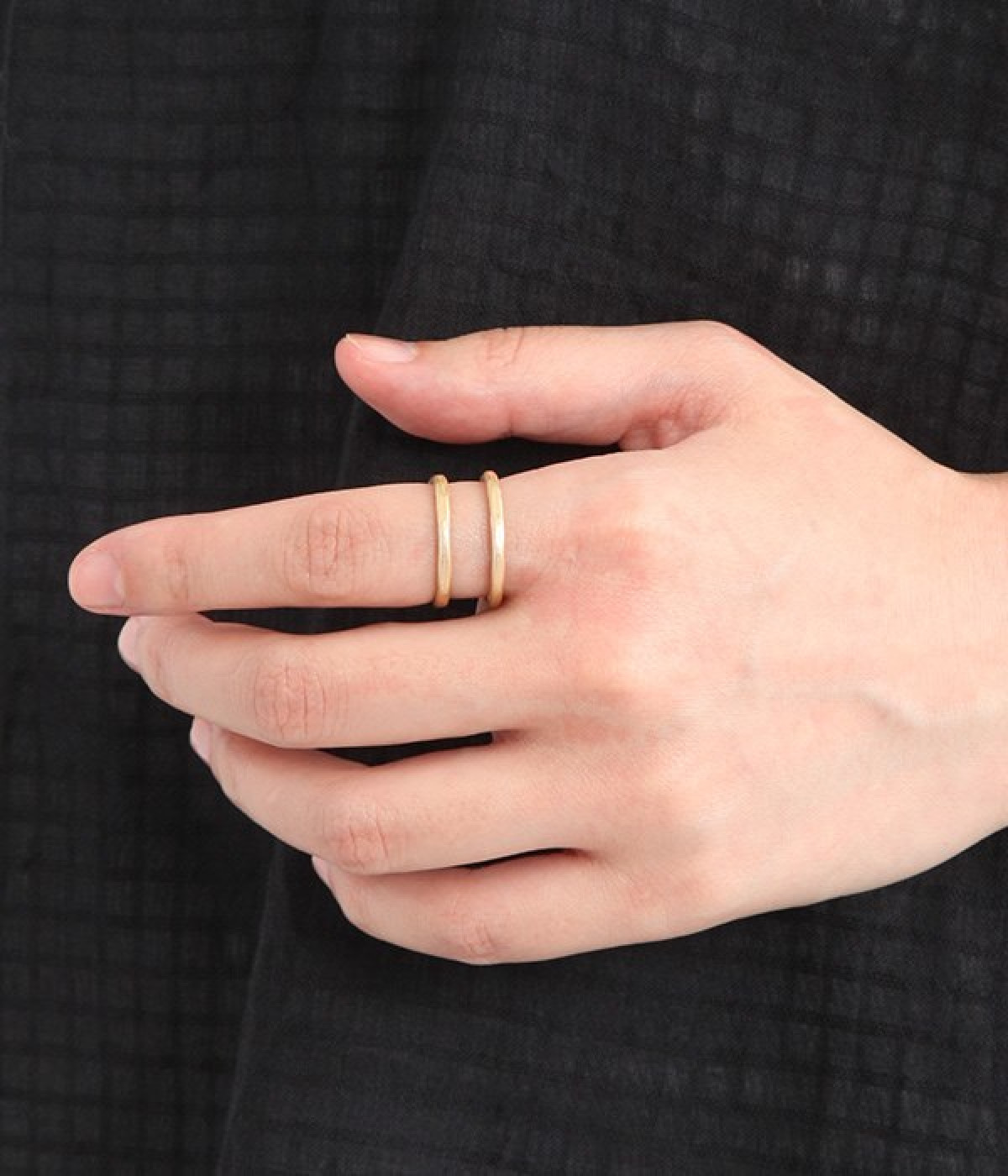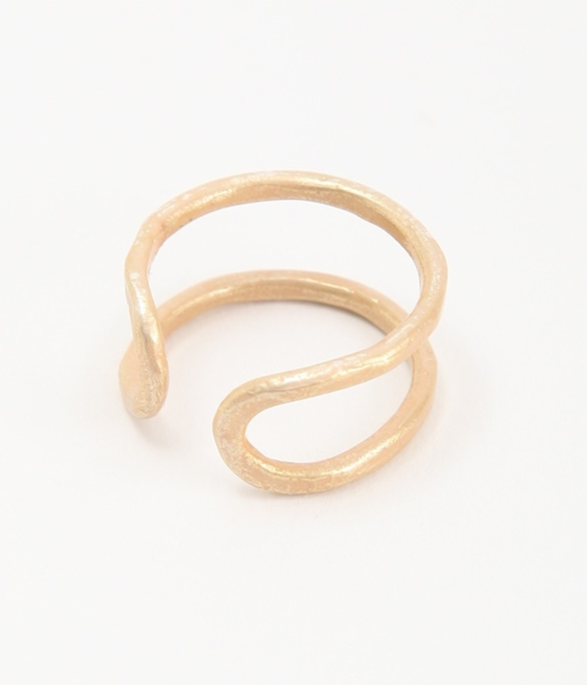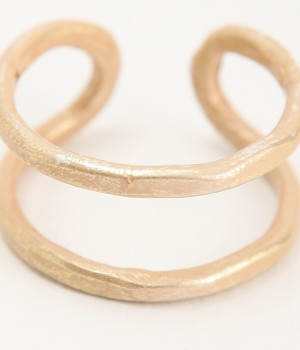 表面にテクスチャーを施したハンドメイド感あふれる表情が魅力のリングです。空きのあるデザインなので窮屈感なく身に着けられます。二重のように見せたり指を両サイドから包み込むようにしたりとどちらをフロントにしても素敵です。真鍮の特性でもある柔らかさで多少のサイズ調整も可能。スカーフやバンダナ留めとしても活躍します。光沢を抑えているので上品な仕上がりに。金属アレルギーの方でも安心してつけられるニッケルフリーの加工が施されています。