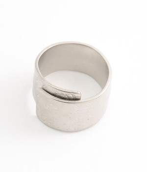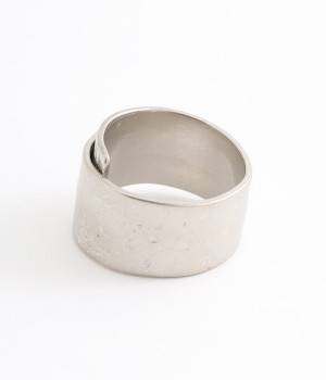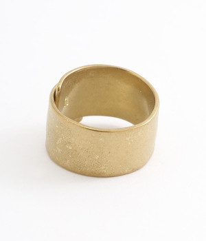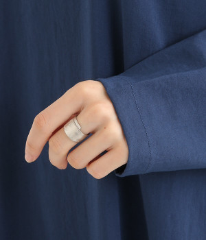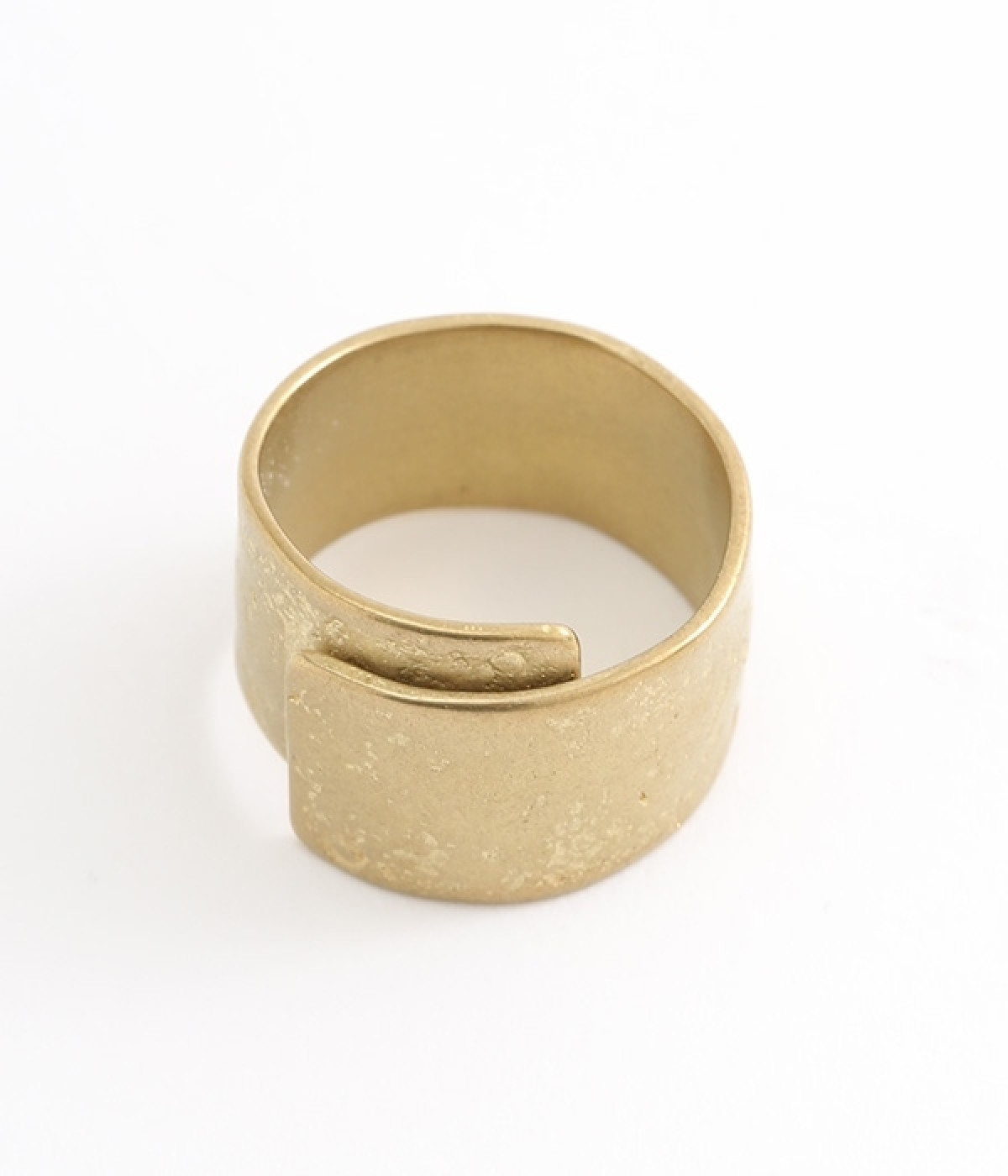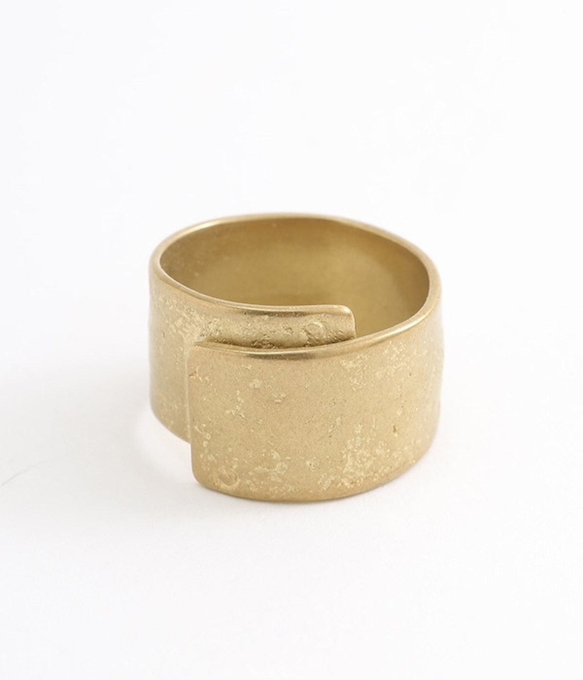 切り出した真鍮プレートを職人さんが一点一点加工したワイド幅のリングです。表面にアンティークのような風合いを施しアクセントを付けています。8mm厚と薄目ですが強度はしっかりとあり、つけやすさも考慮されたアクセサリー。プレートが重なり合ったフォルムはデザイン性だけでなくサイズ調整もでき、機能性を兼ね備えています。