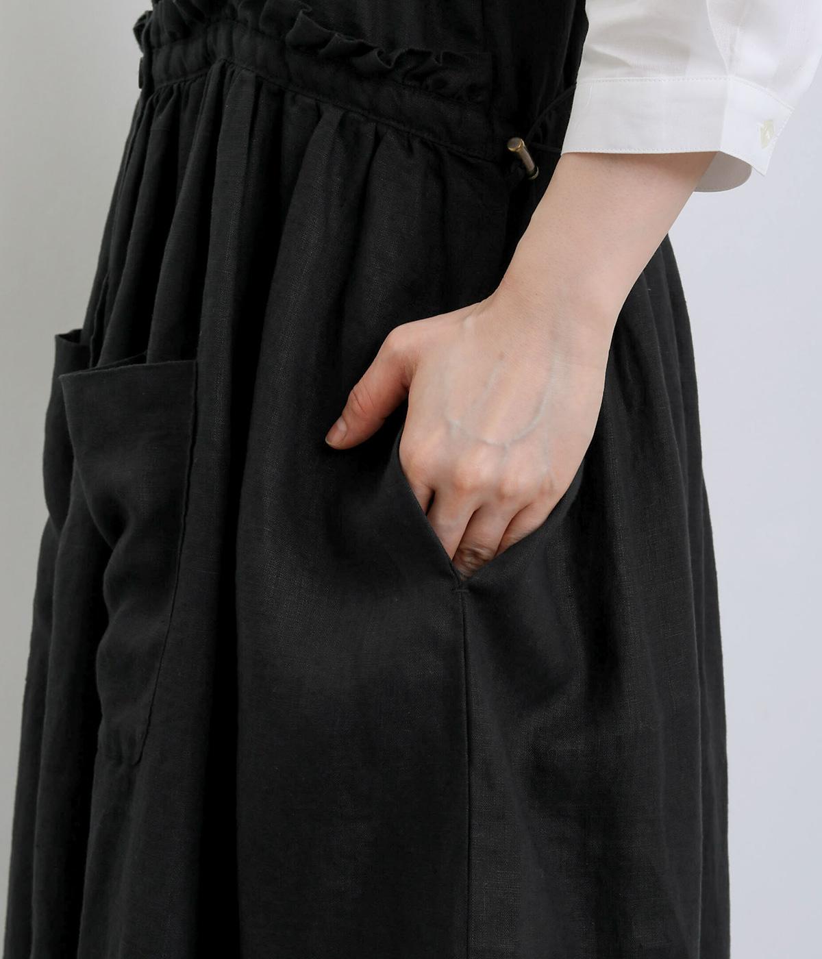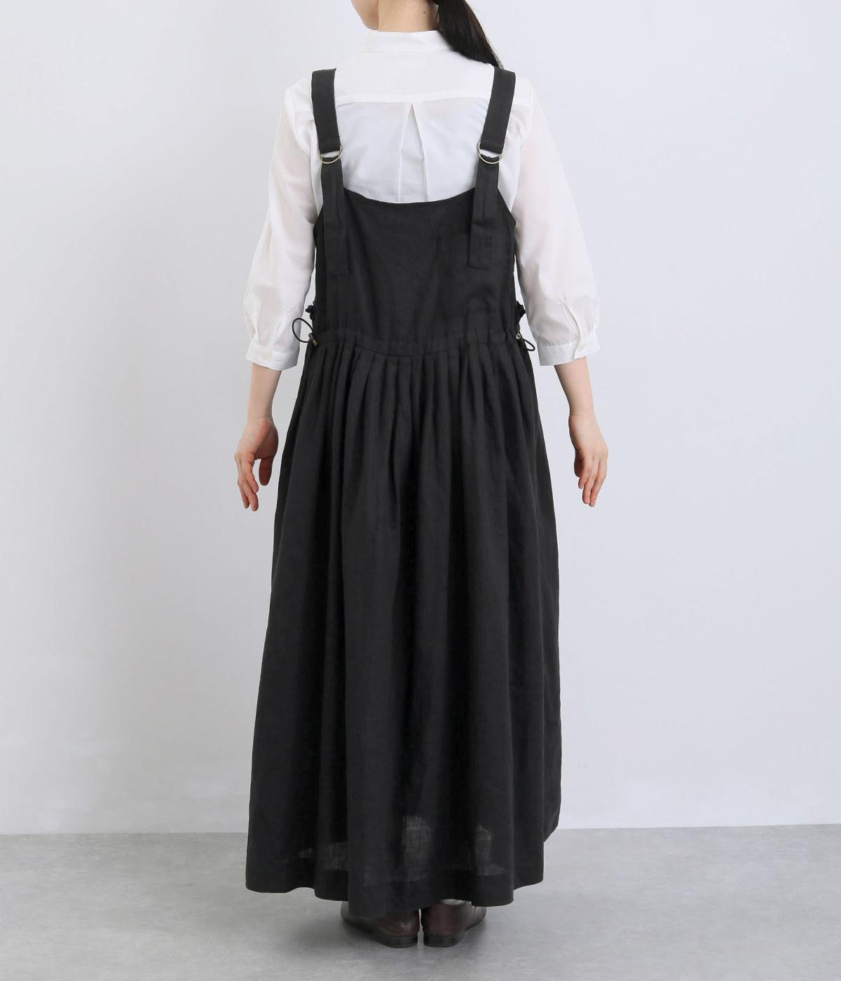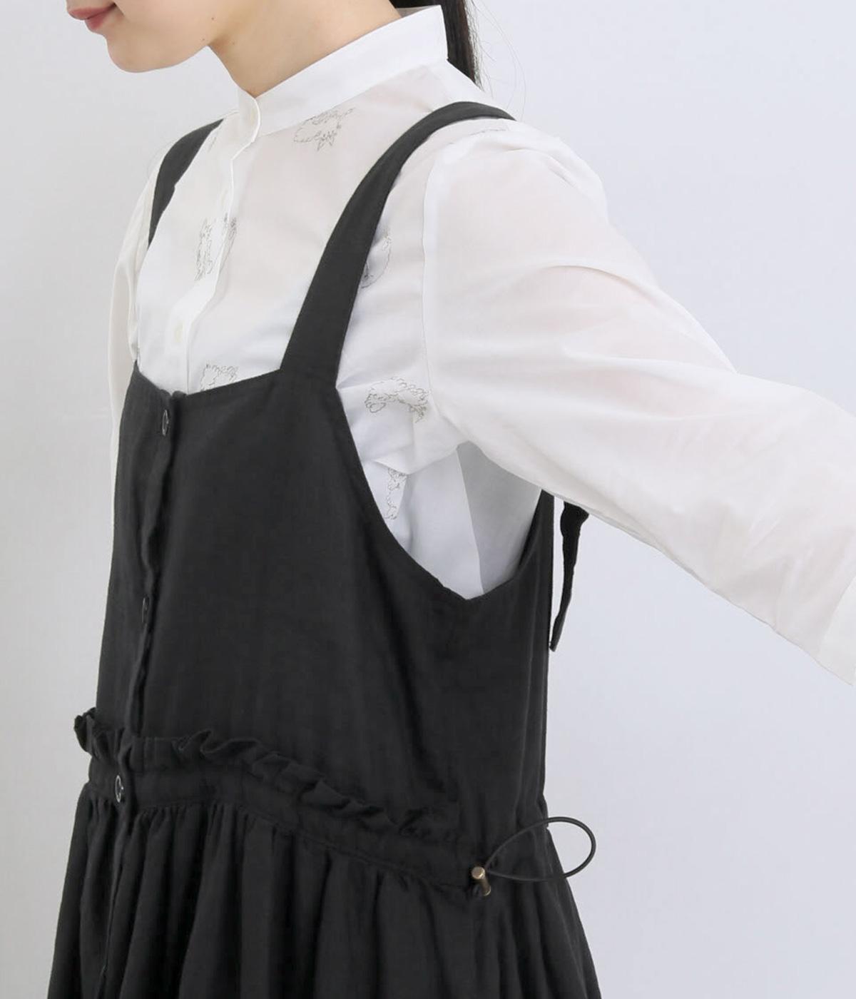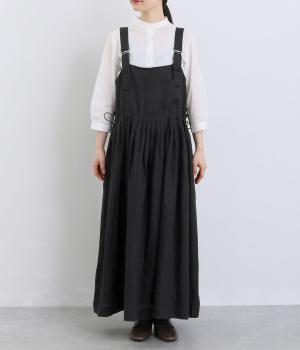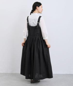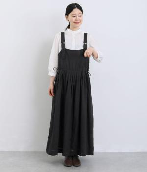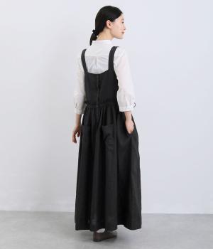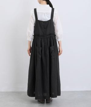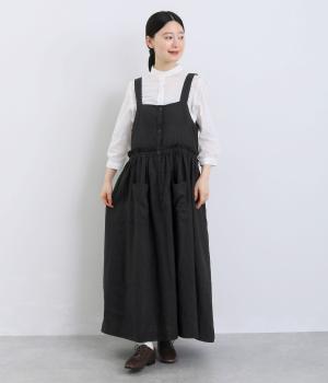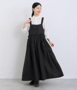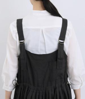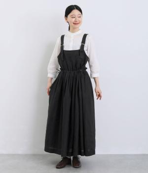 前後どちらでも着用できる、2way仕様のジャンパースカートです。ウエスト部分にフリルとギャザーをたっぷりと寄せ、やわらかな立体感のあるシルエットに仕上げました。両サイドのドローコードを絞ることでボリューム感を調整でき、表情の変化もたのしめます。