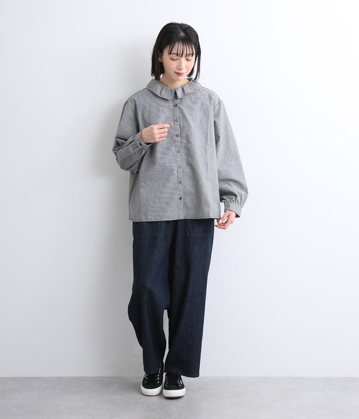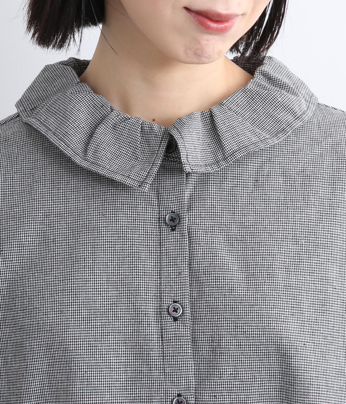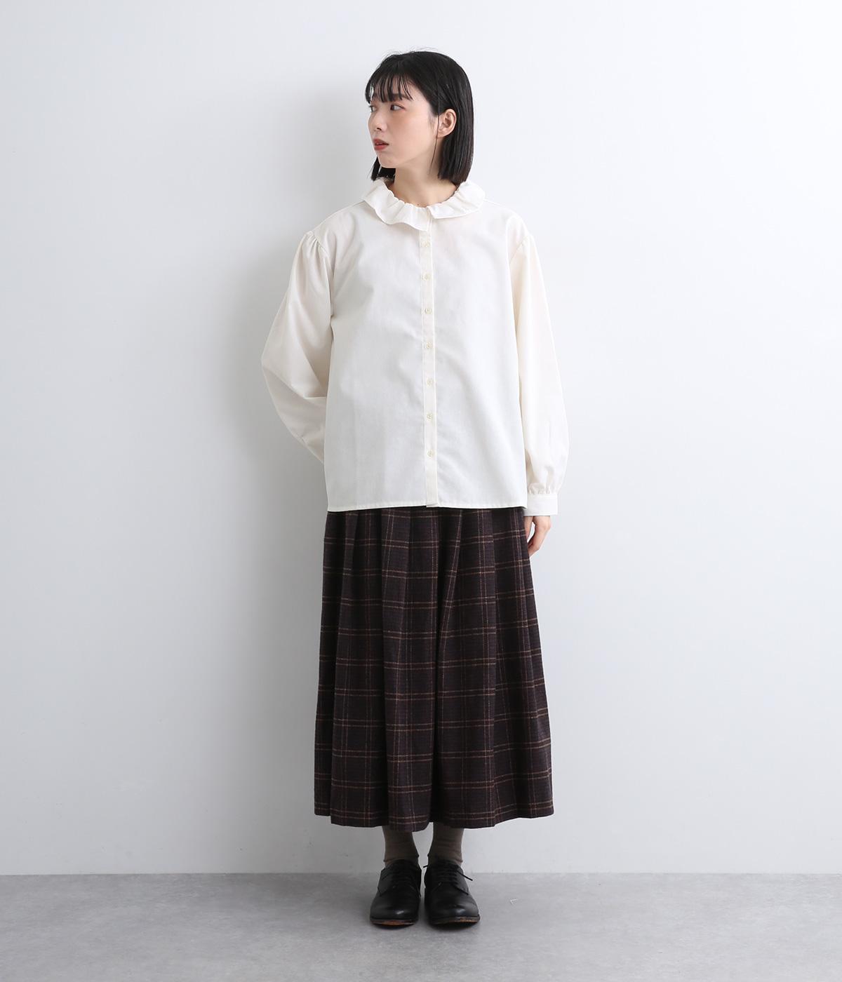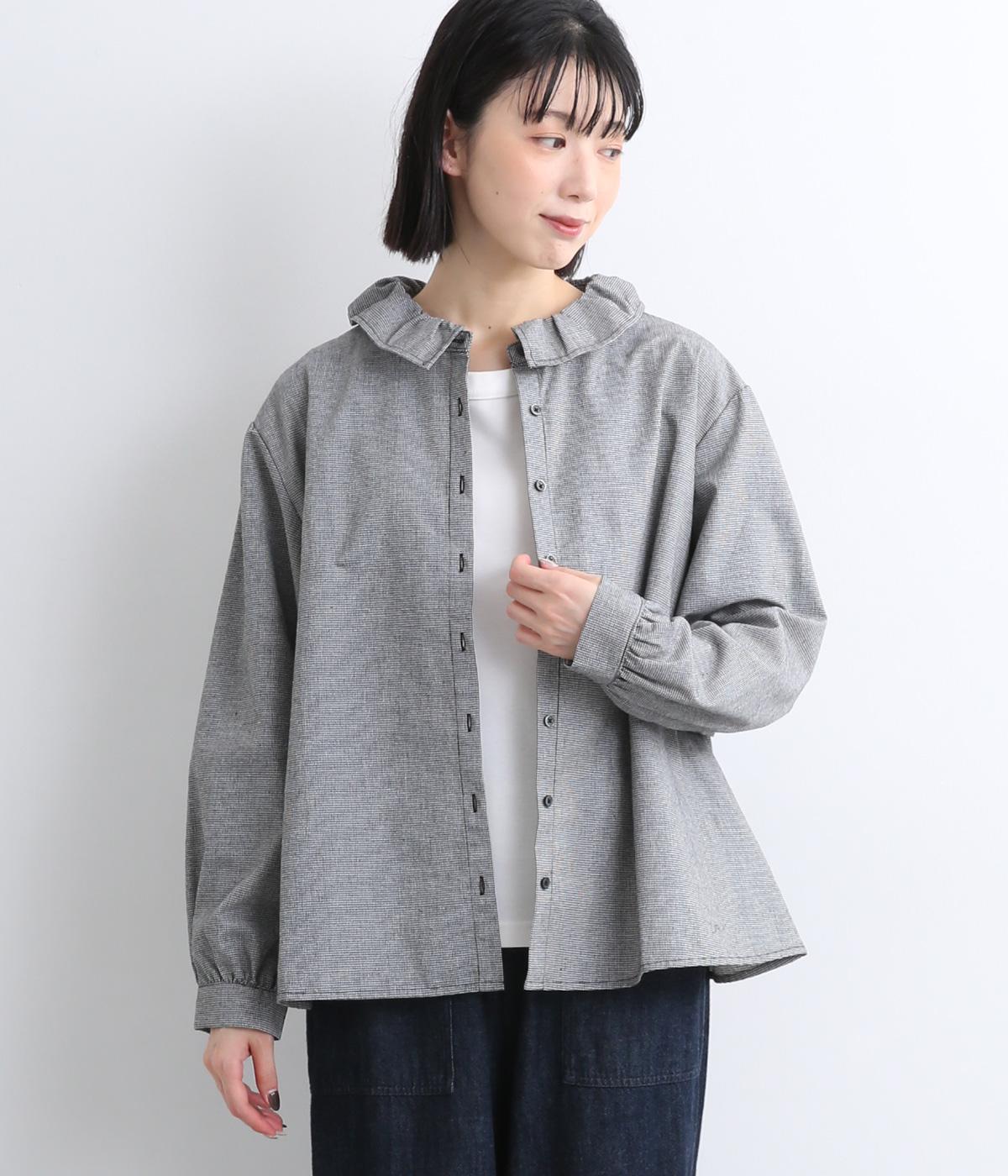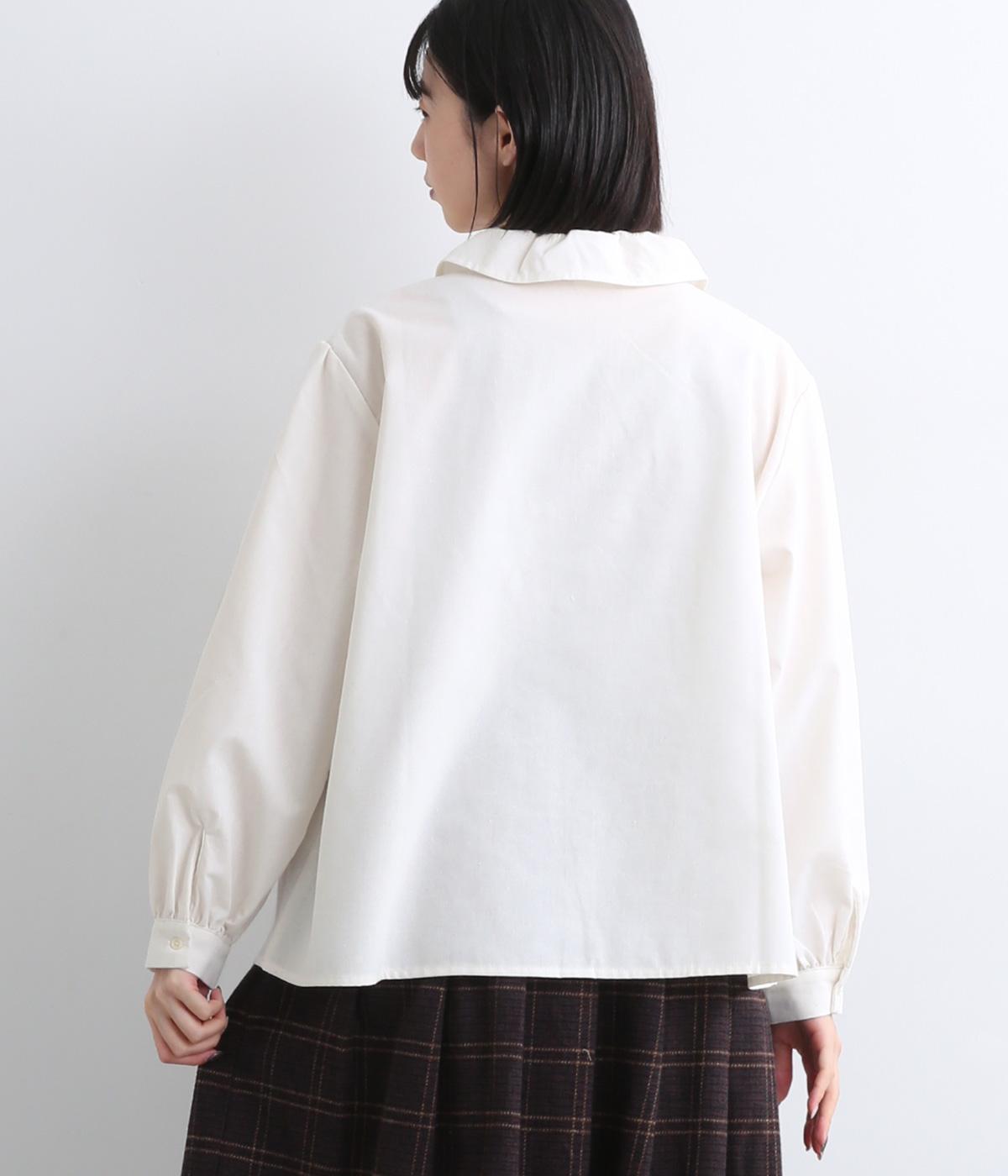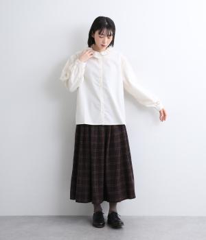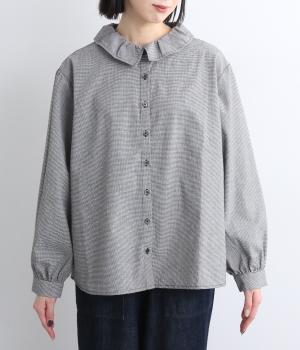 絶妙なサイズでかわいくなりすぎないフリル襟のブラウスを作りました。フロントのボタンをあけて羽織りとしてコーディネートしたり、ニットなどと重ね着をして襟を出すスタイルがおすすめです。