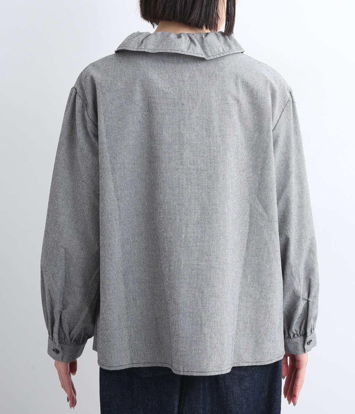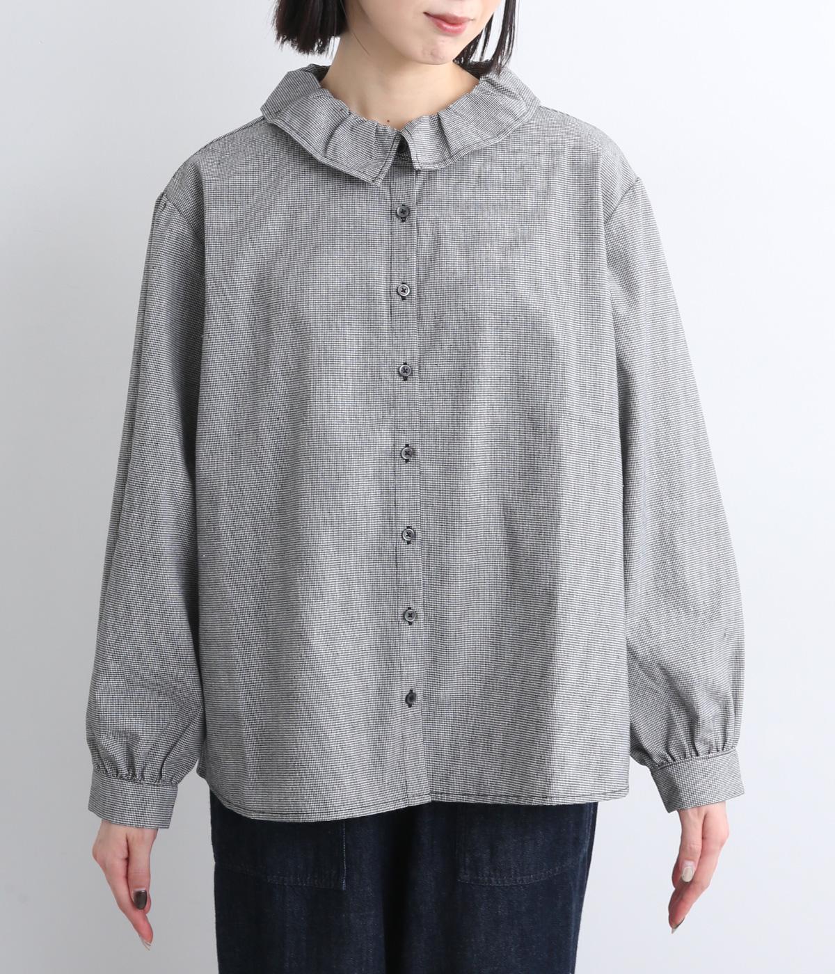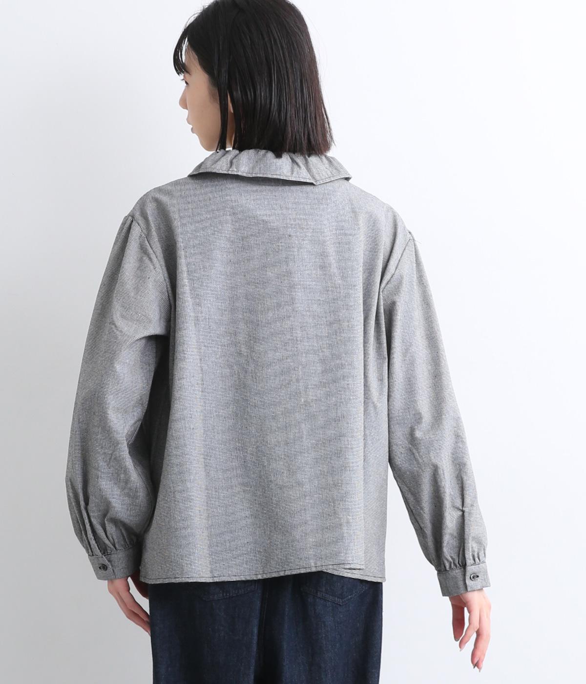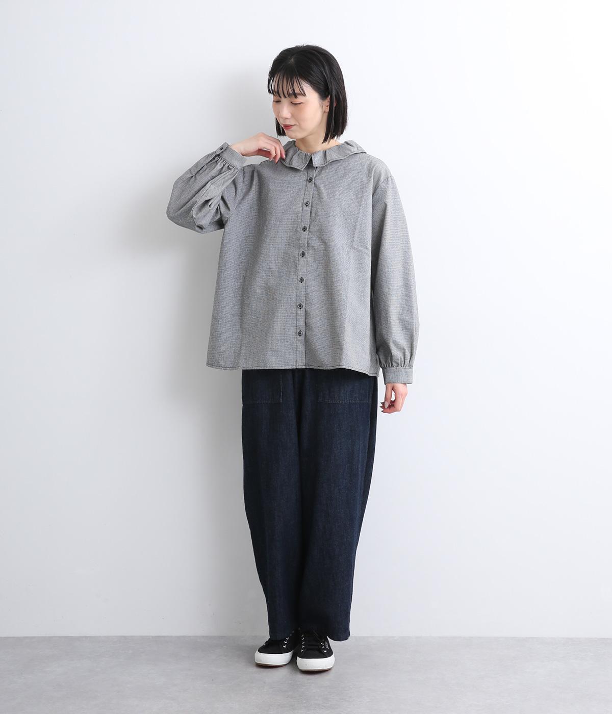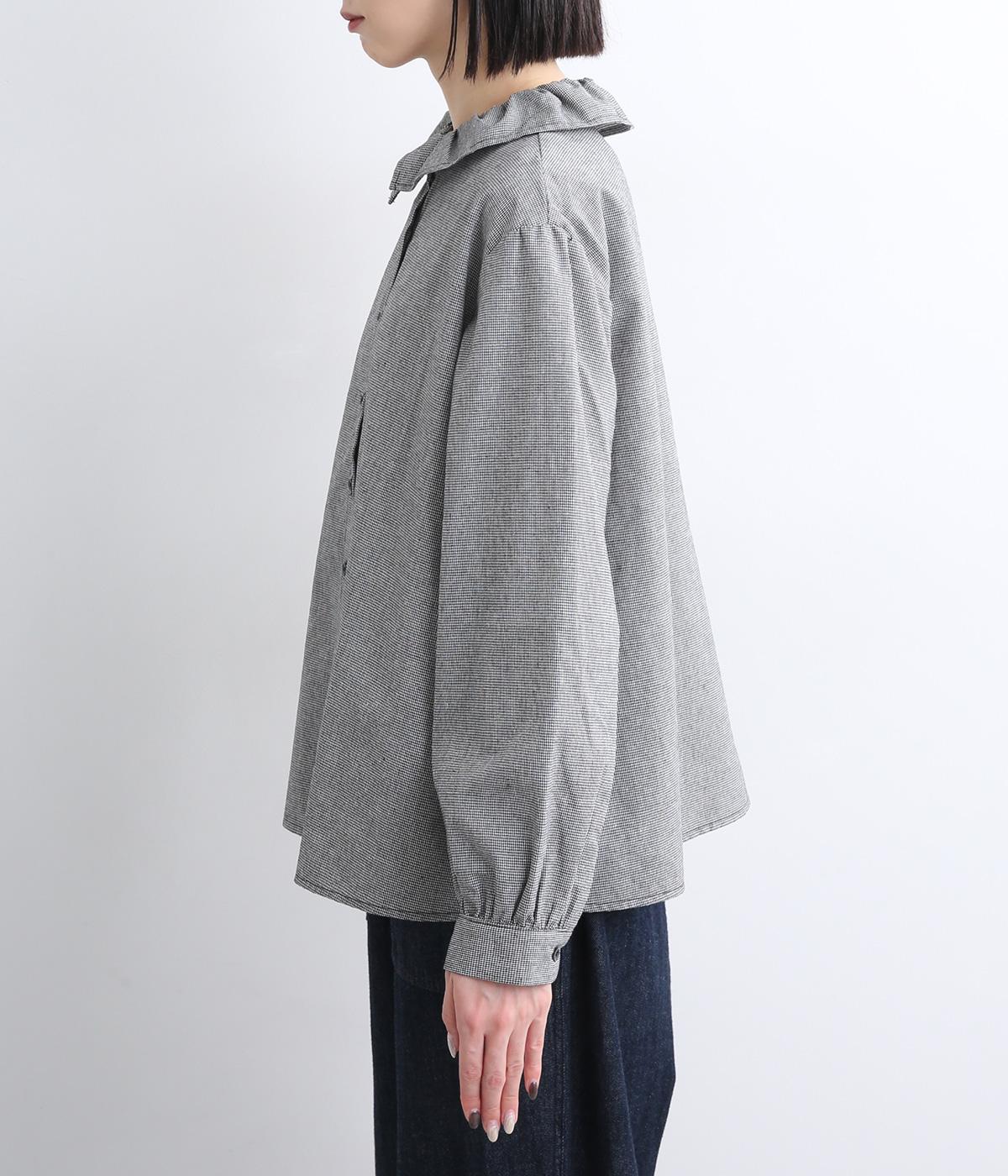 絶妙なサイズでかわいくなりすぎないフリル襟のブラウスを作りました。フロントのボタンをあけて羽織りとしてコーディネートしたり、ニットなどと重ね着をして襟を出すスタイルがおすすめです。