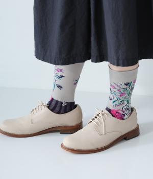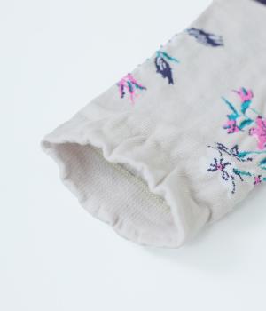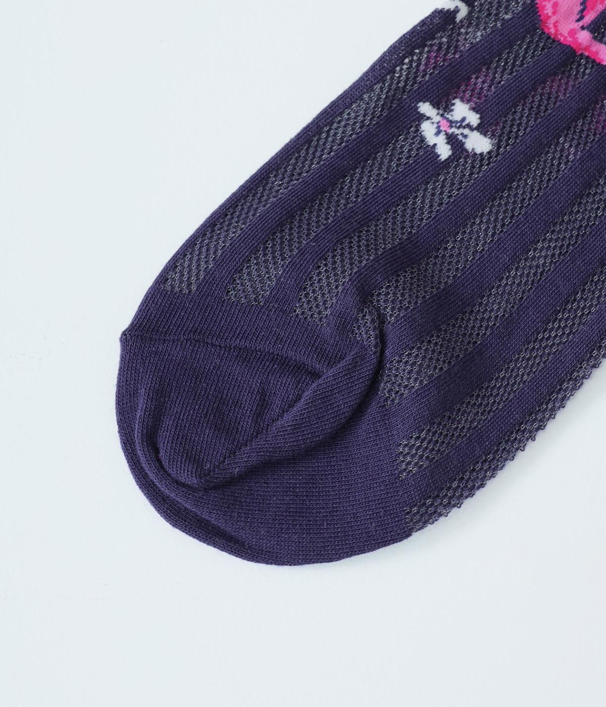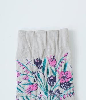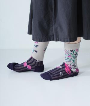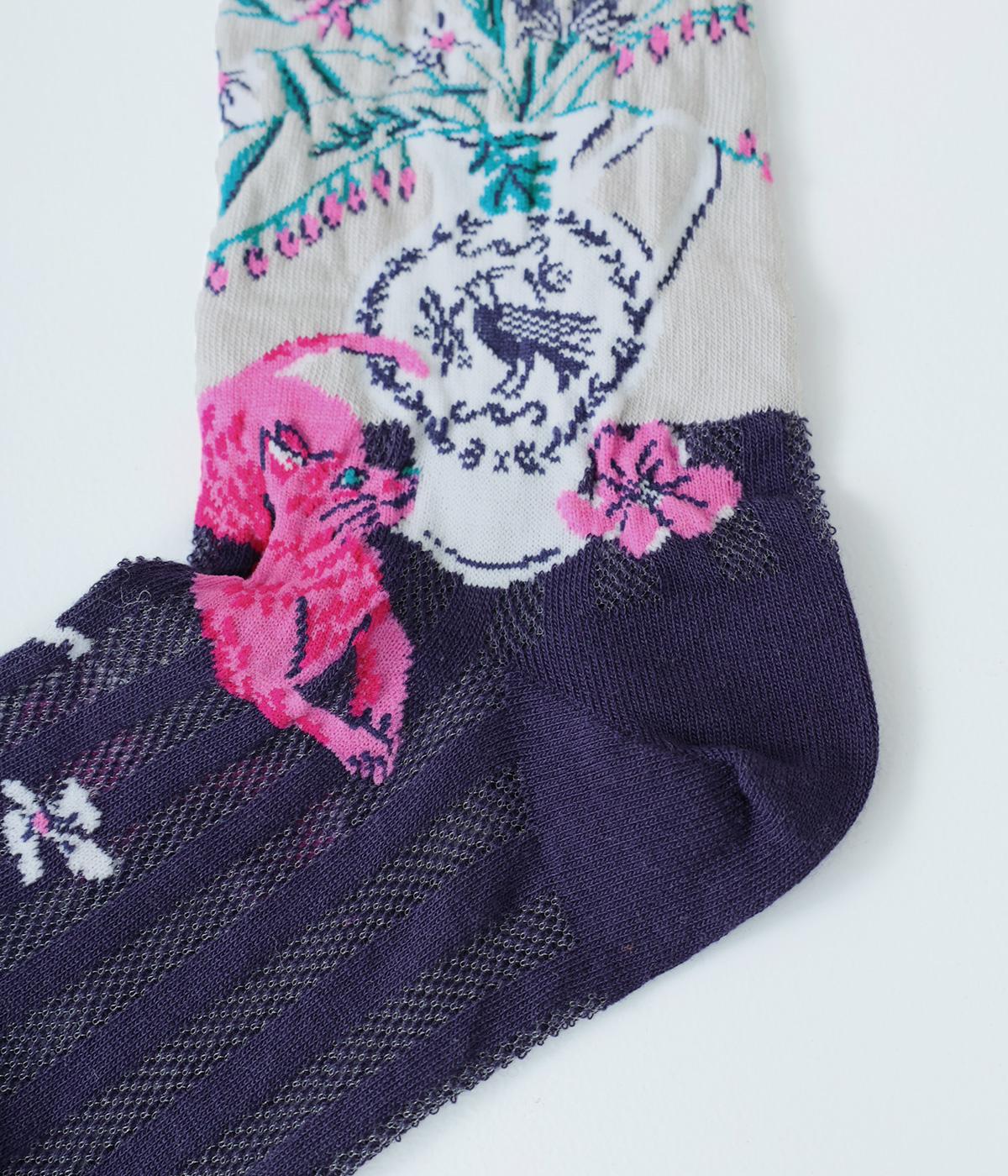 素敵な花瓶に入った美しく繊細なお花と、かわいらしいネコが描かれたソックス。とても華やかなデザインながらも、派手すぎず大人らしい配色が魅力です。足の甲と裏部分はシアー感があり、ムレにくく快適なはき心地を叶えてくれます。