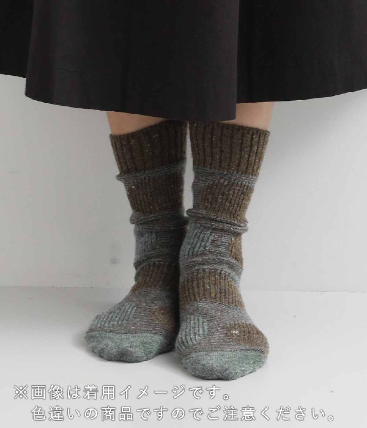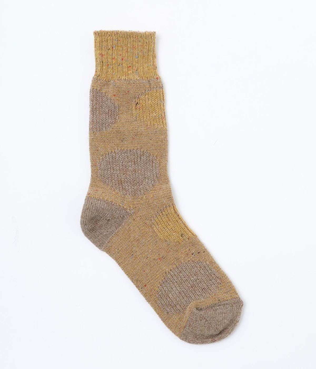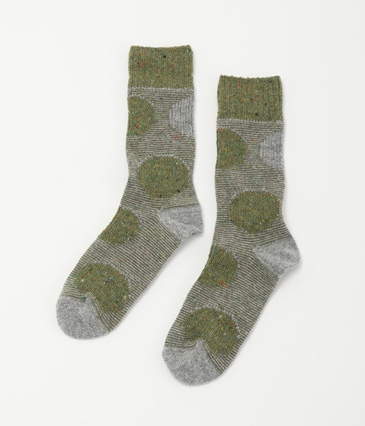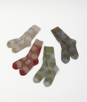 ジャカード織りによって色の濃淡がついた、優しい風合いのドット柄を表現したソックスです。落ち着いた色合いなので柄物が苦手な方にも取り入れやすい一足に。直角のかかとはずれにくい仕様で、履き口はリブになっていて程よいフィット感です。ドット・つま先・かかとの配色もポイントで、靴を脱いでもかわいいデザイン。チクチク感の少ないウール混紡素材で暖かな履き心地です。