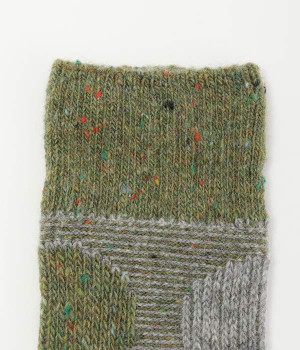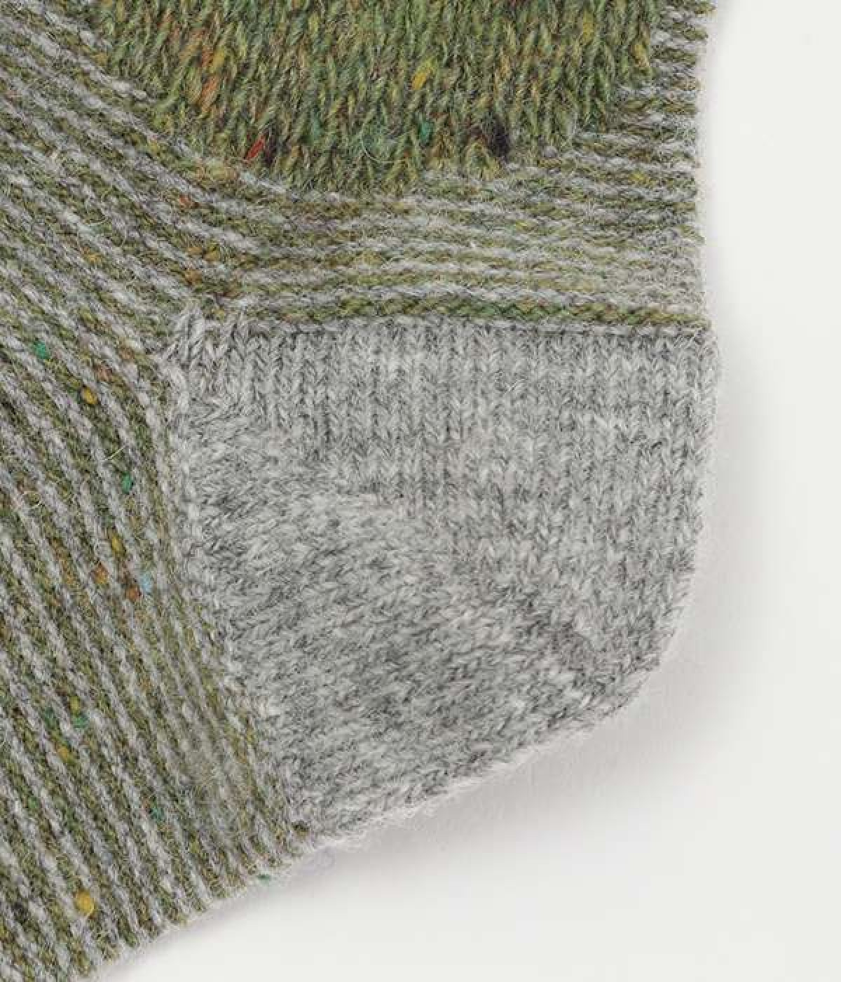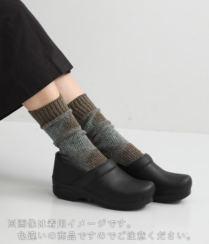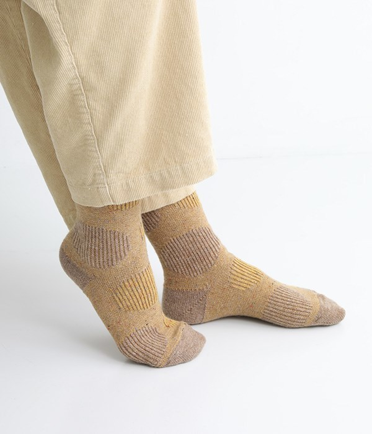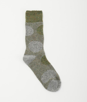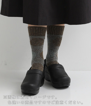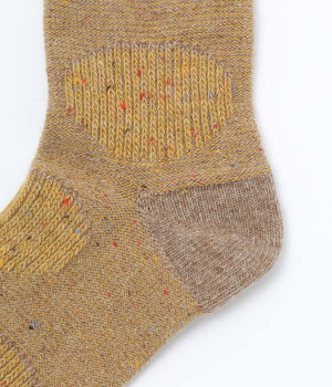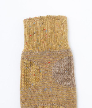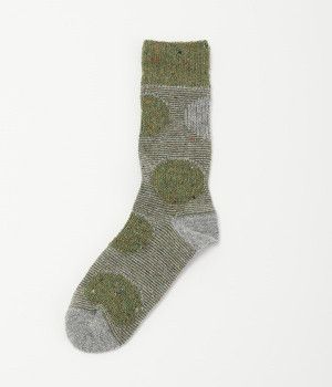 ジャカード織りによって色の濃淡がついた、優しい風合いのドット柄を表現したソックスです。落ち着いた色合いなので柄物が苦手な方にも取り入れやすい一足に。直角のかかとはずれにくい仕様で、履き口はリブになっていて程よいフィット感です。ドット・つま先・かかとの配色もポイントで、靴を脱いでもかわいいデザイン。チクチク感の少ないウール混紡素材で暖かな履き心地です。