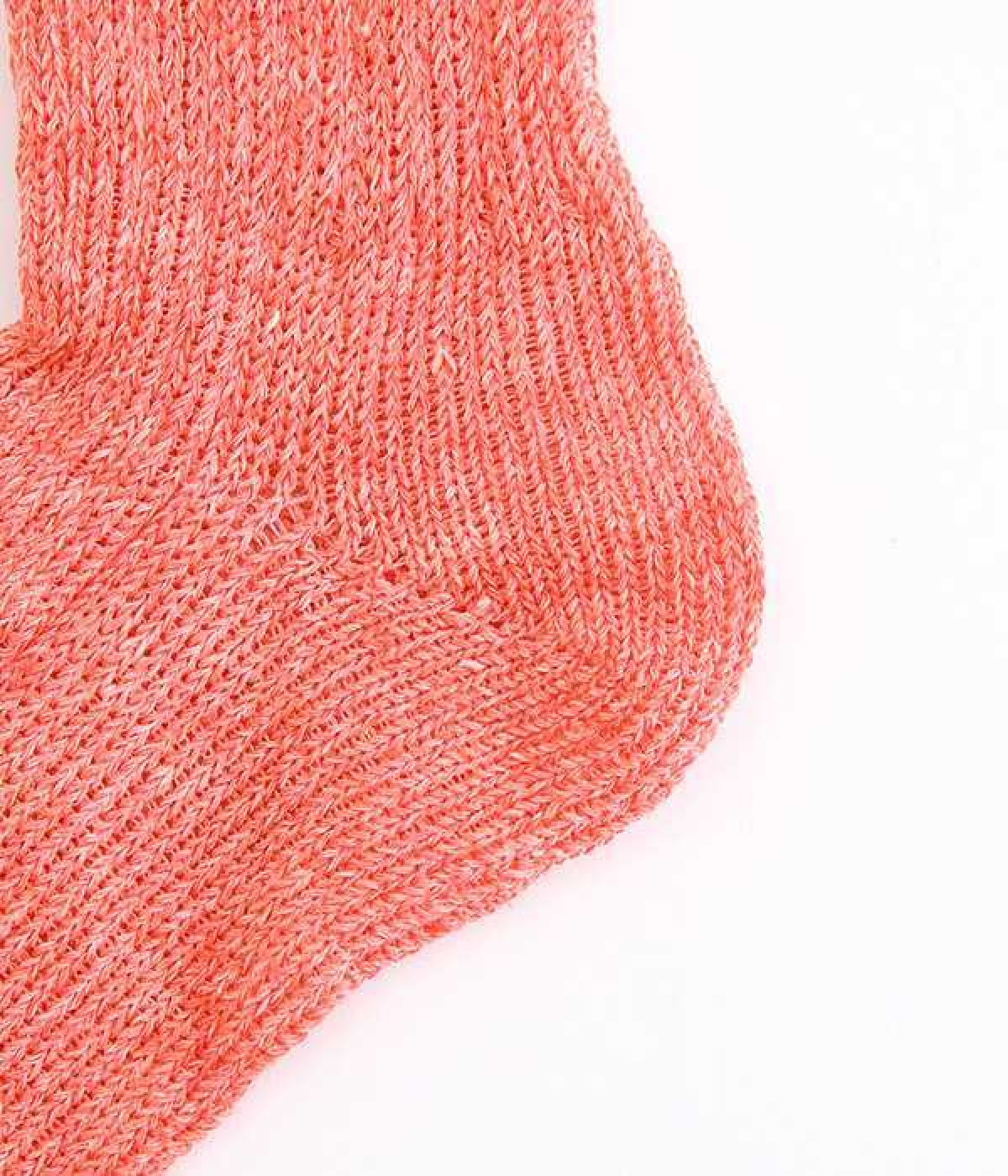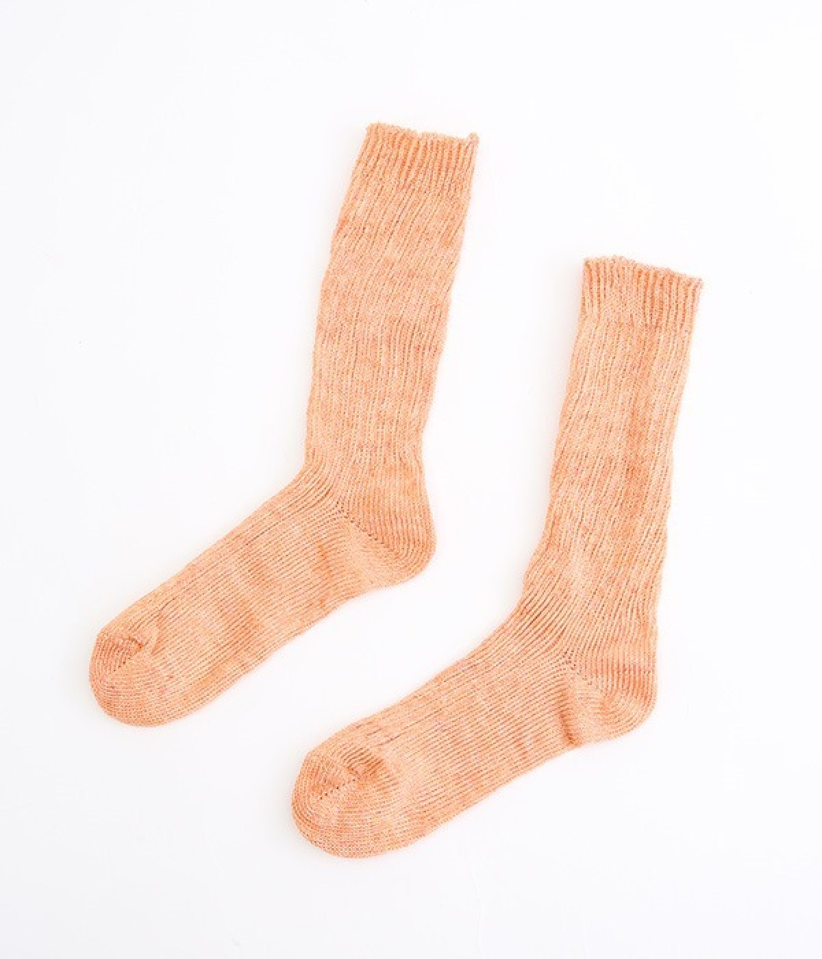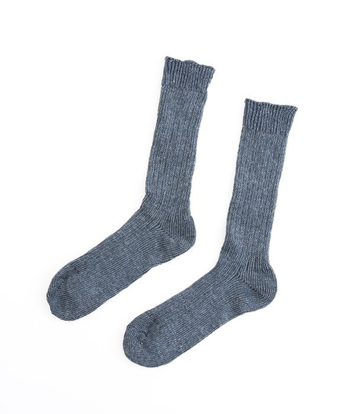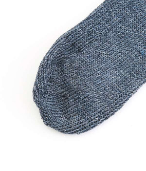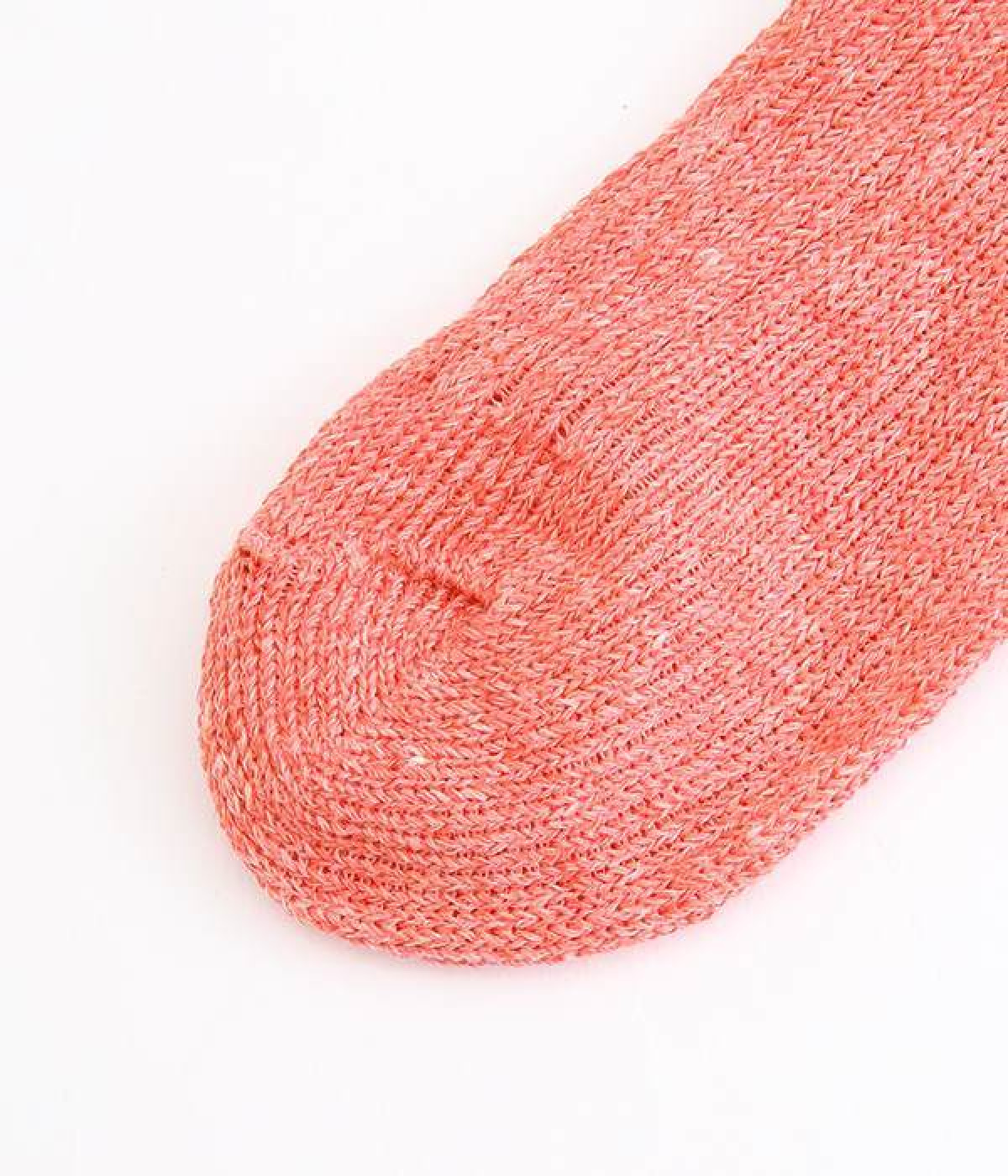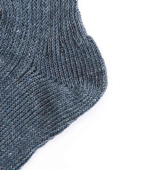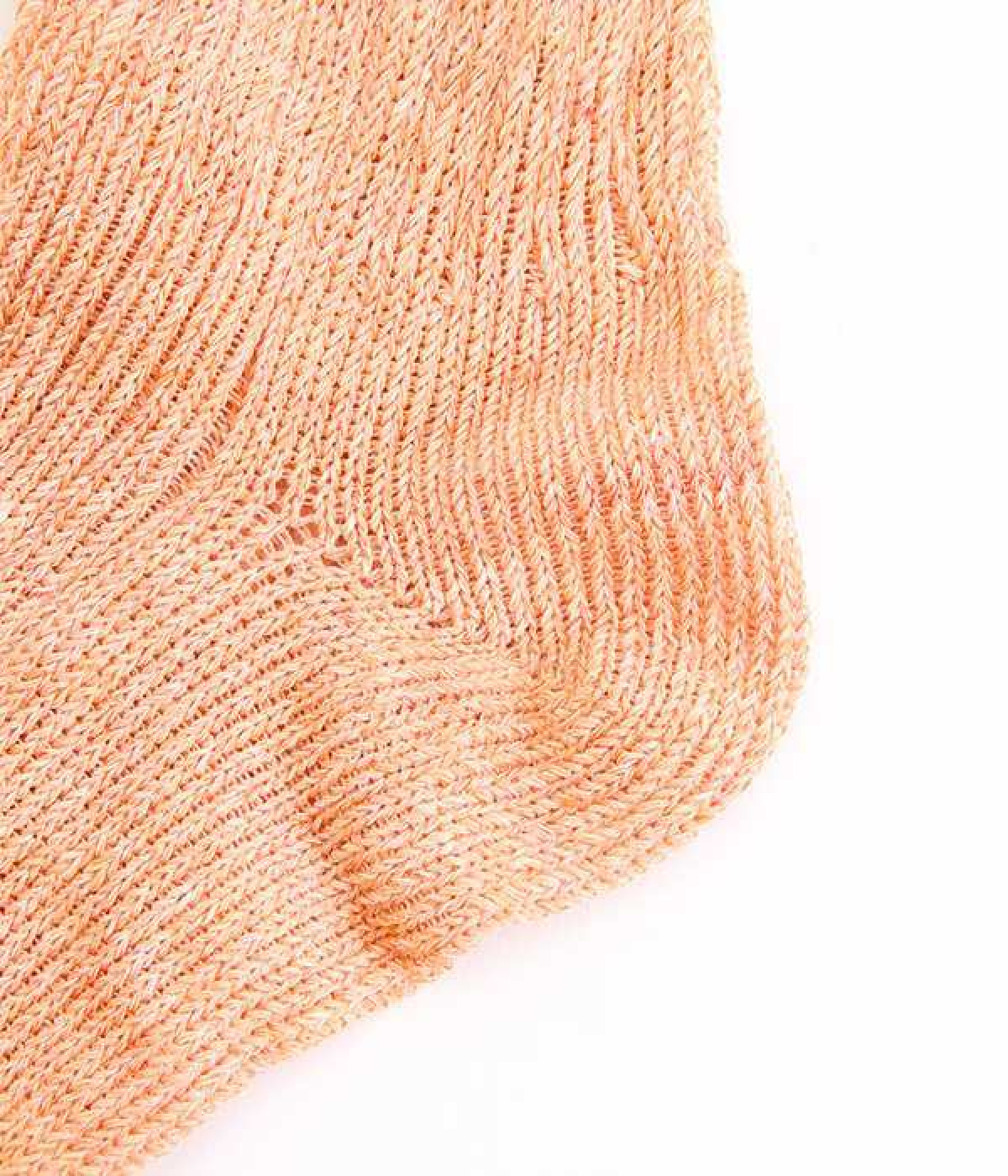 リネンの風合いを最大限に楽しめる、ブランドリネンを使用したソックスです。リネンはコットンと比べ3倍ほどの吸収力と高い発散性を持つ繊維なので、蒸れる感覚がほとんどありません。暑い時期にはぴったりのシャリ感と通気性はやみつきになります。また履けば履くほど足に馴染んで柔らかくなっていくのも嬉しいポイント。半年ほど履くとコットンのような風合いになりつつも、吸収性と発散性はそのまま。長く愛用したいアイテムです。