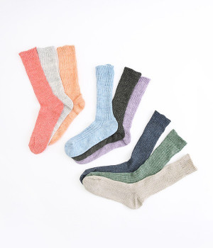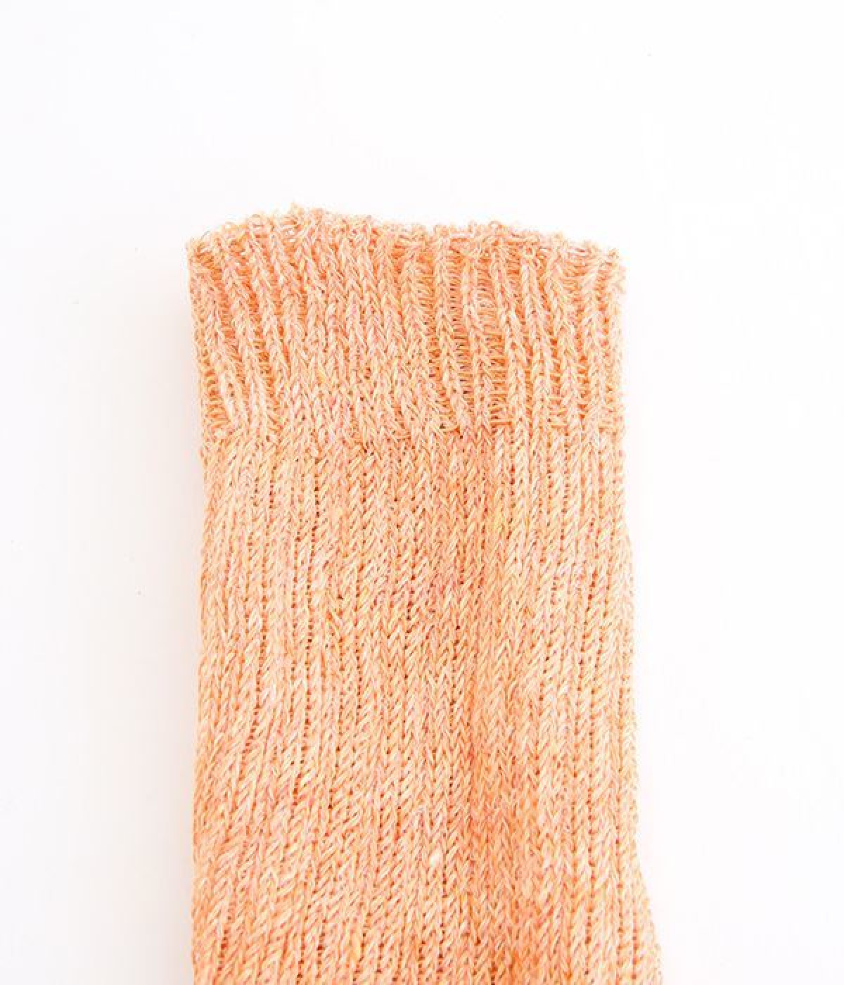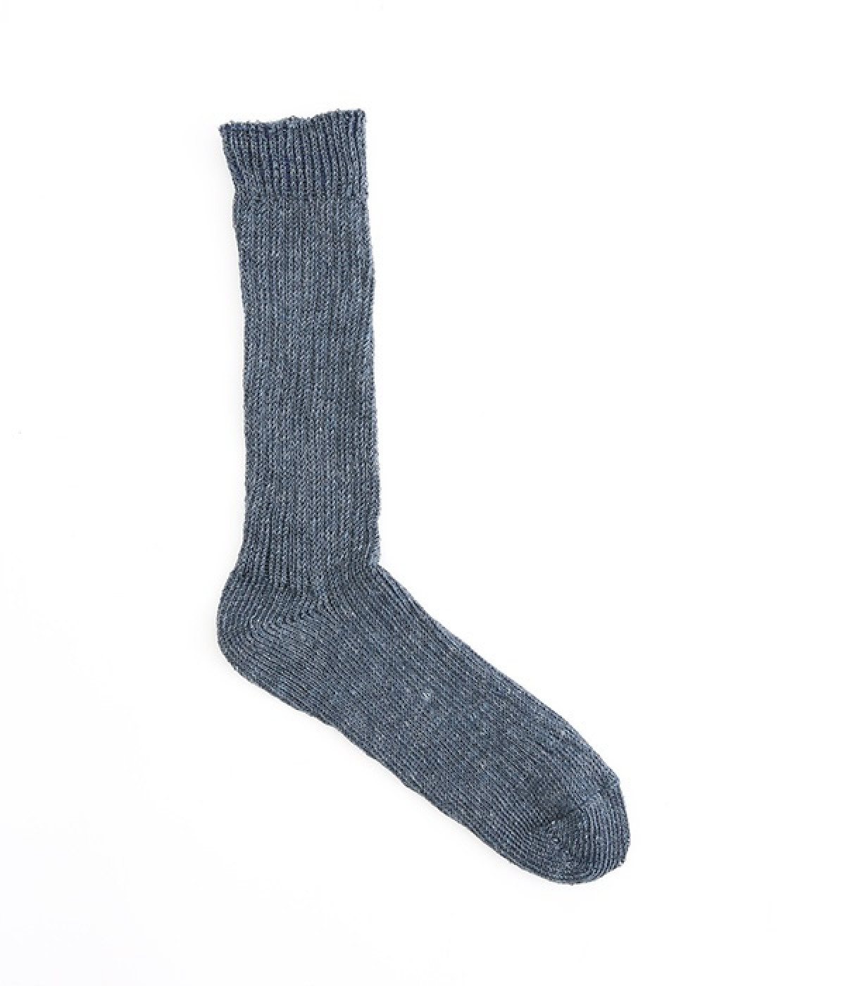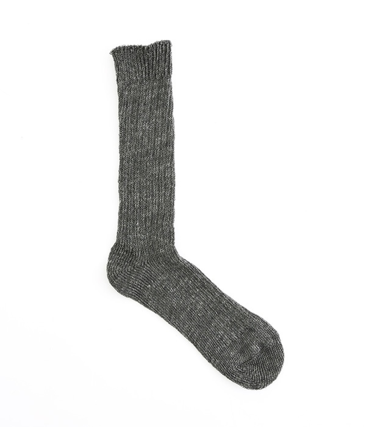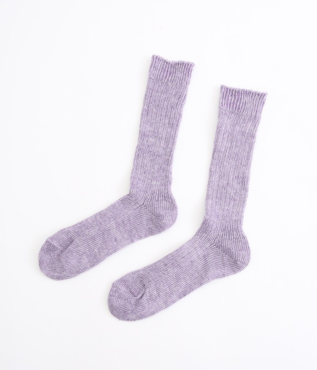 リネンの風合いを最大限に楽しめる、ブランドリネンを使用したソックスです。リネンはコットンと比べ3倍ほどの吸収力と高い発散性を持つ繊維なので、蒸れる感覚がほとんどありません。暑い時期にはぴったりのシャリ感と通気性はやみつきになります。また履けば履くほど足に馴染んで柔らかくなっていくのも嬉しいポイント。半年ほど履くとコットンのような風合いになりつつも、吸収性と発散性はそのまま。長く愛用したいアイテムです。