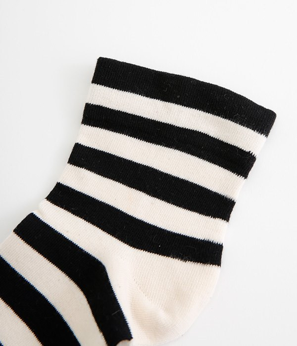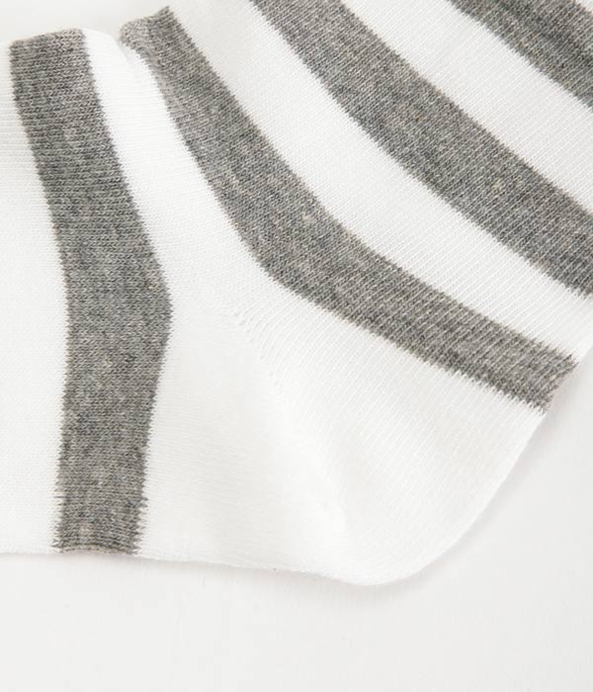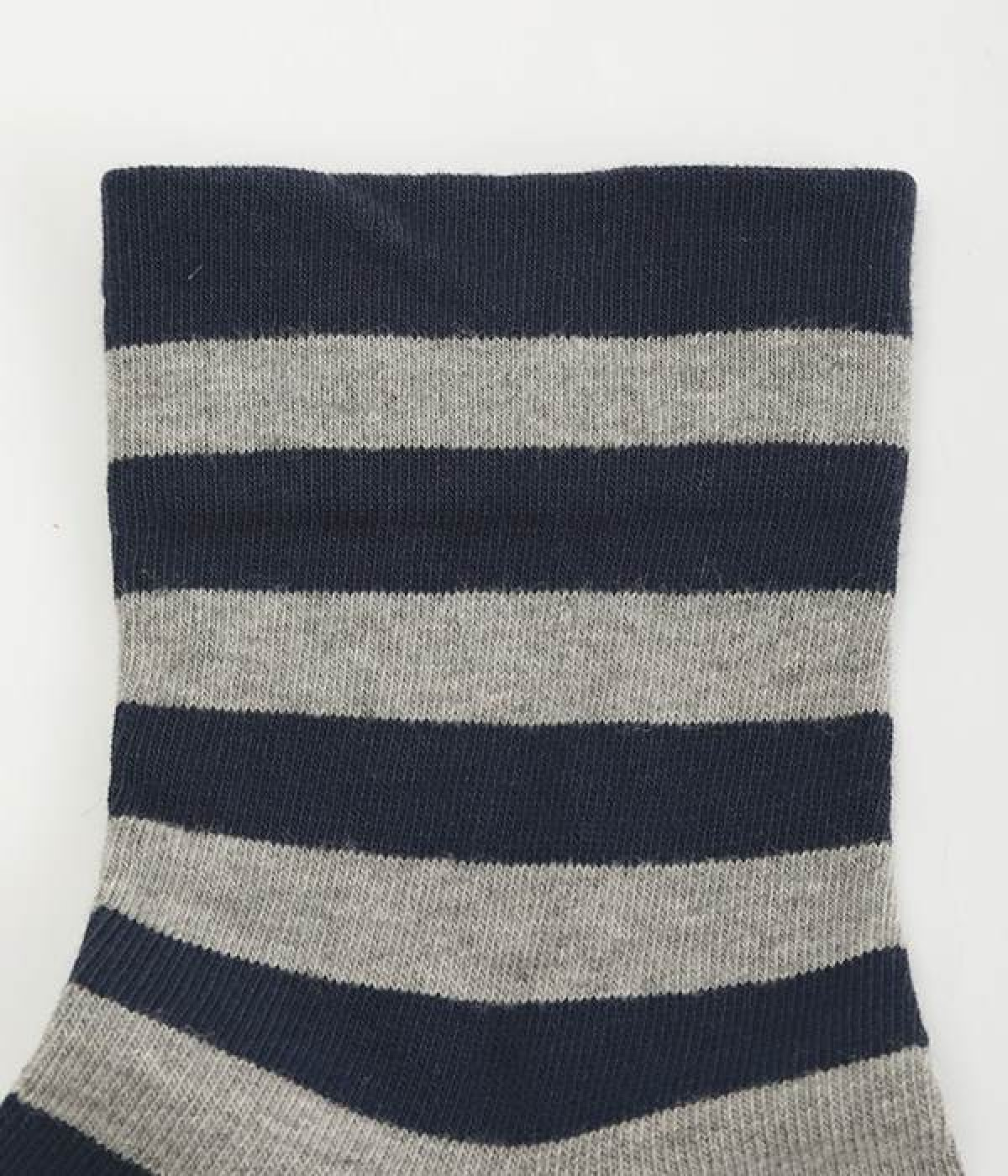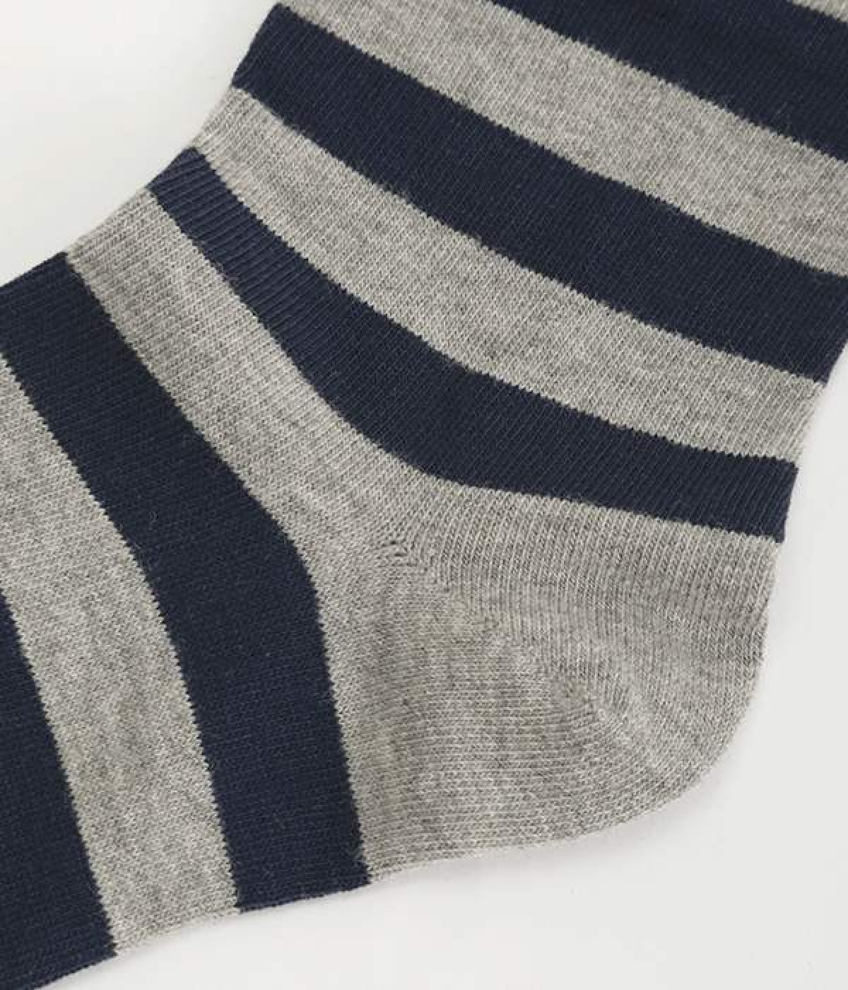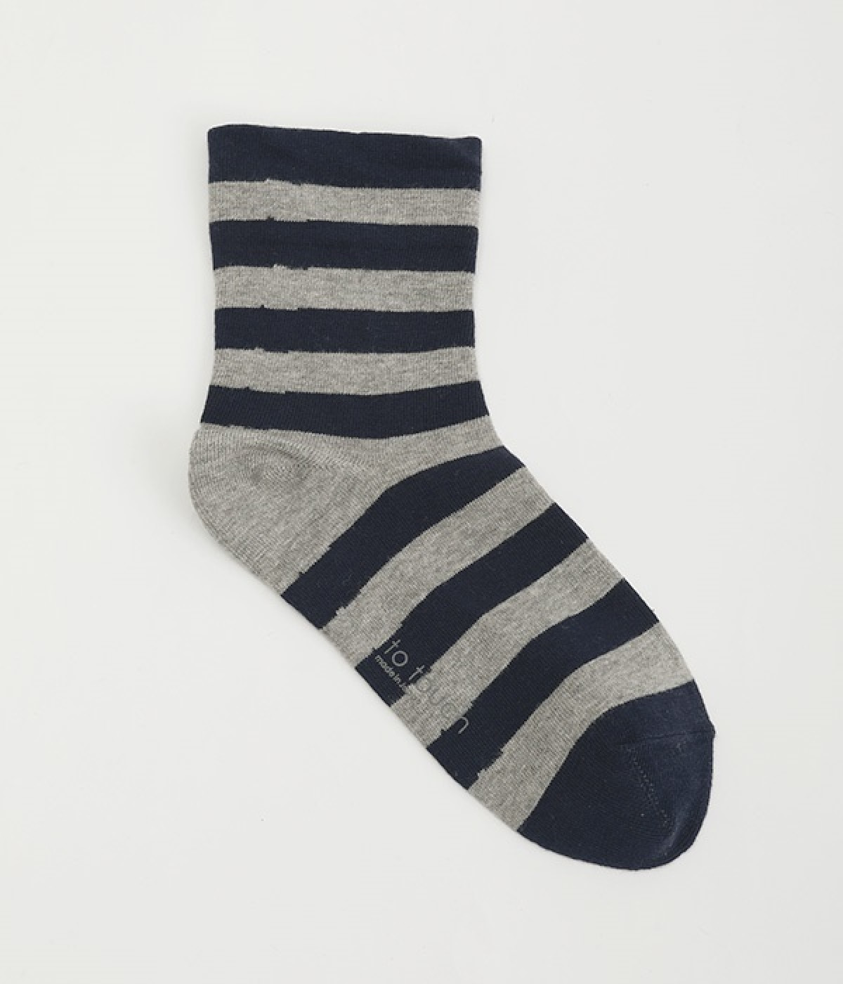奈良の靴下産地の中心地である広陵町の老舗が作る、丈夫ではき心地の良いソックスのファクトリーブランド。オリジナルのボーダー柄を編みたてた少し短めの丈はコーディネートのさりげないアクセントにぴったり。スカートはもちろんシンプルなパンツスタイルに合わせても素敵なアイテムです。