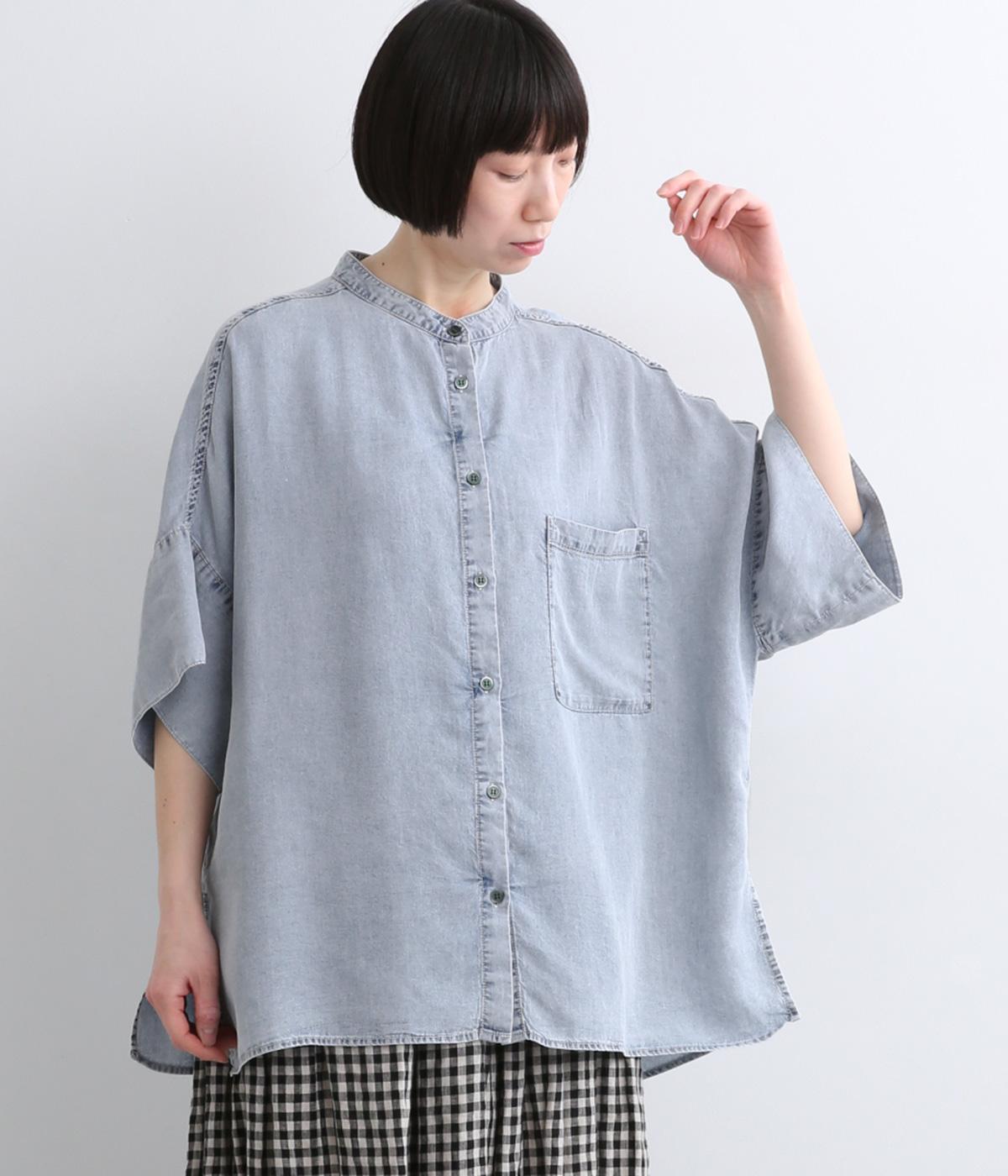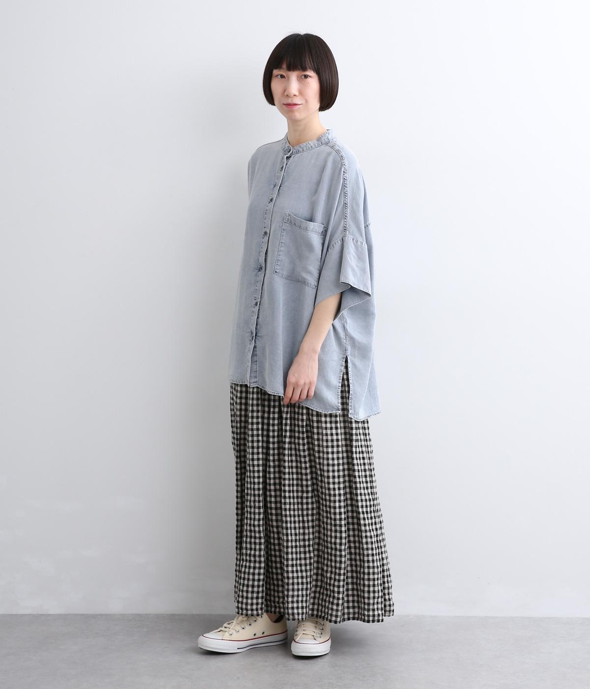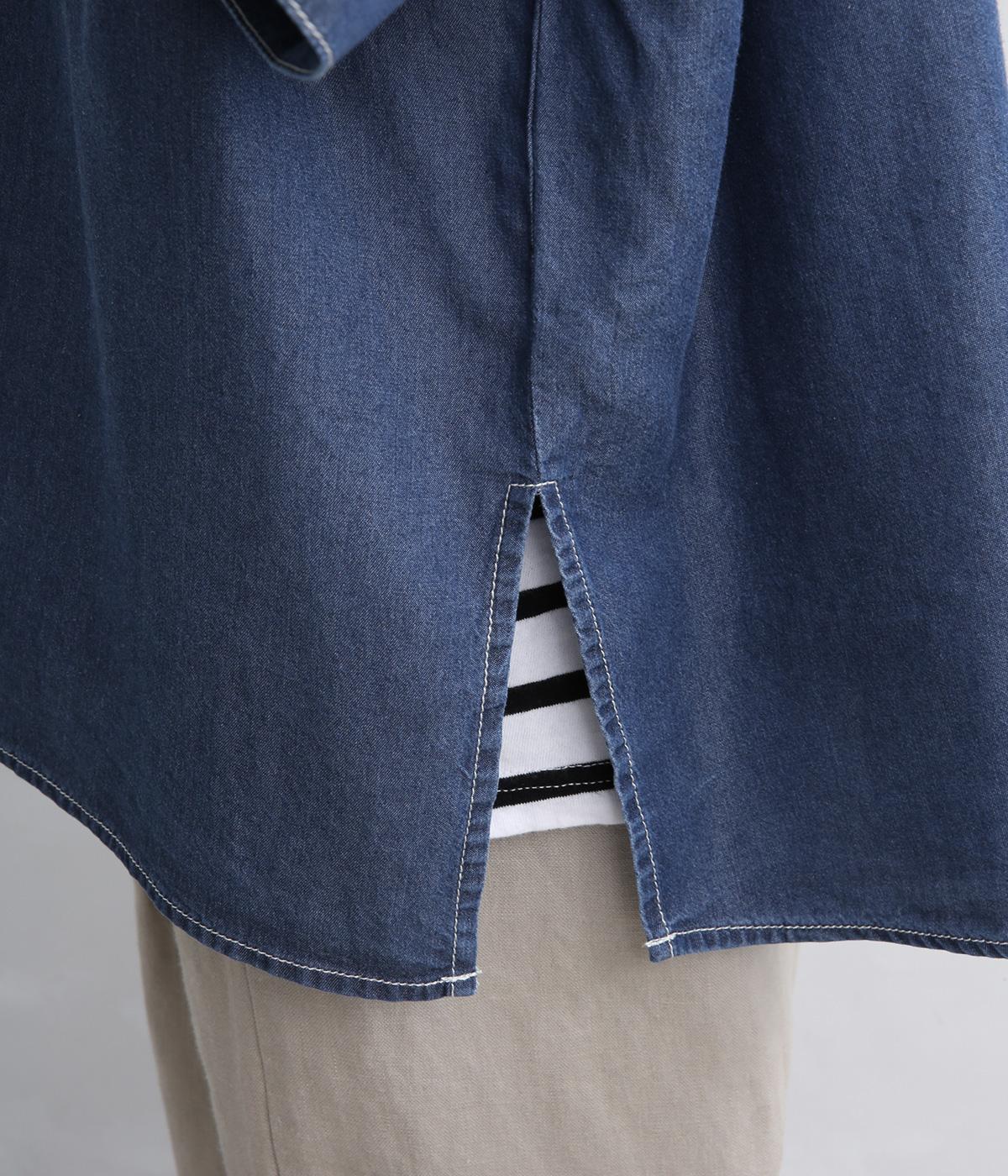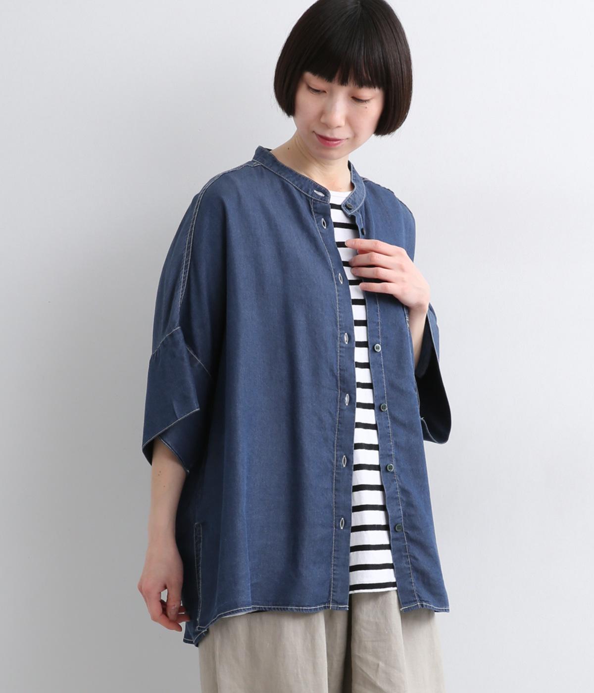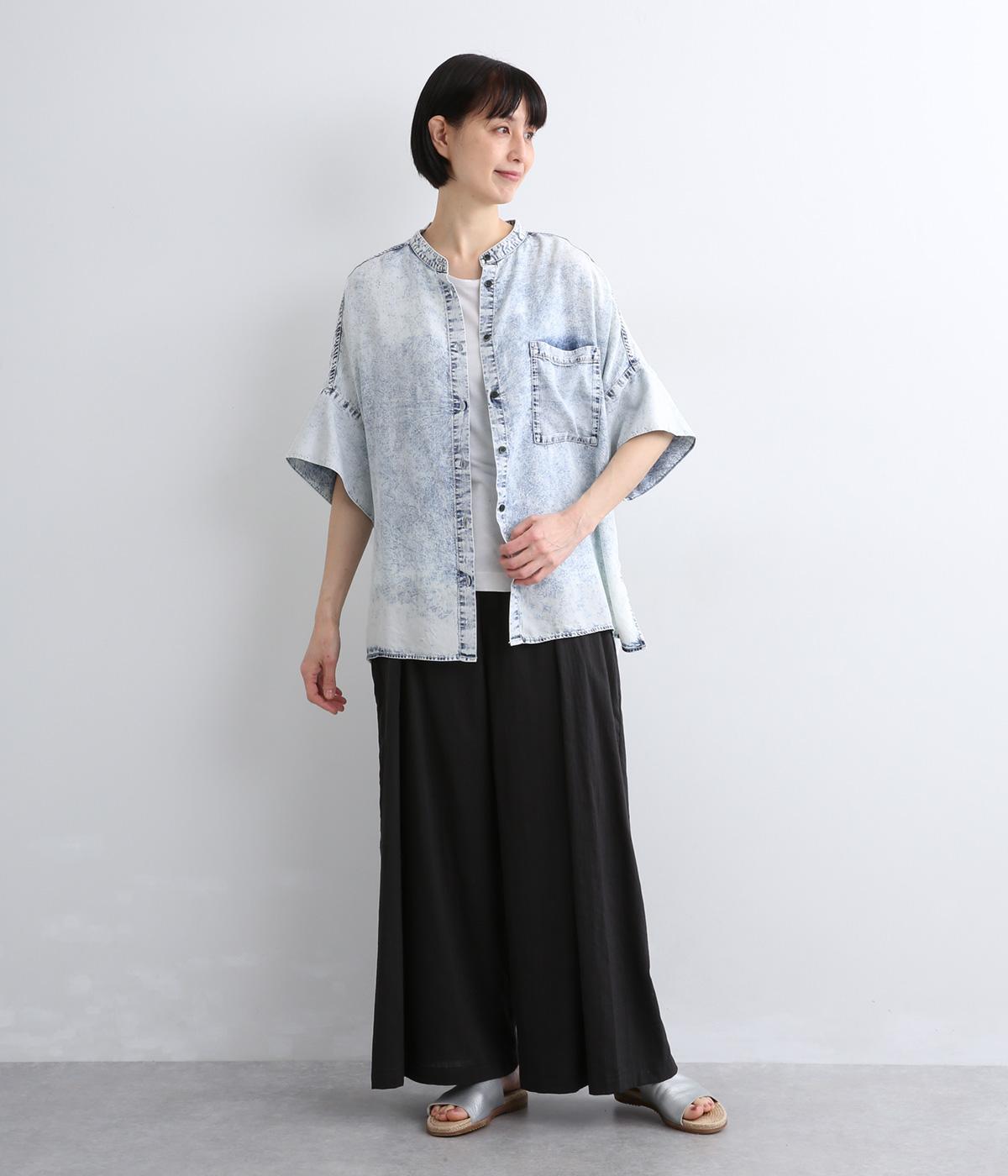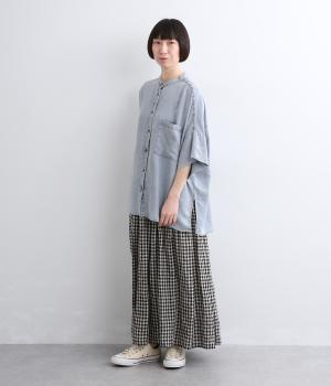 たっぷりと身幅を取ったワイドシルエットの前開きシャツです。羽織りものとしても活躍し、肘まで隠れる袖丈は春から初夏にかけての軽やかな季節にぴったり。大きく前後差をつけた裾がこなれ感を演出します。